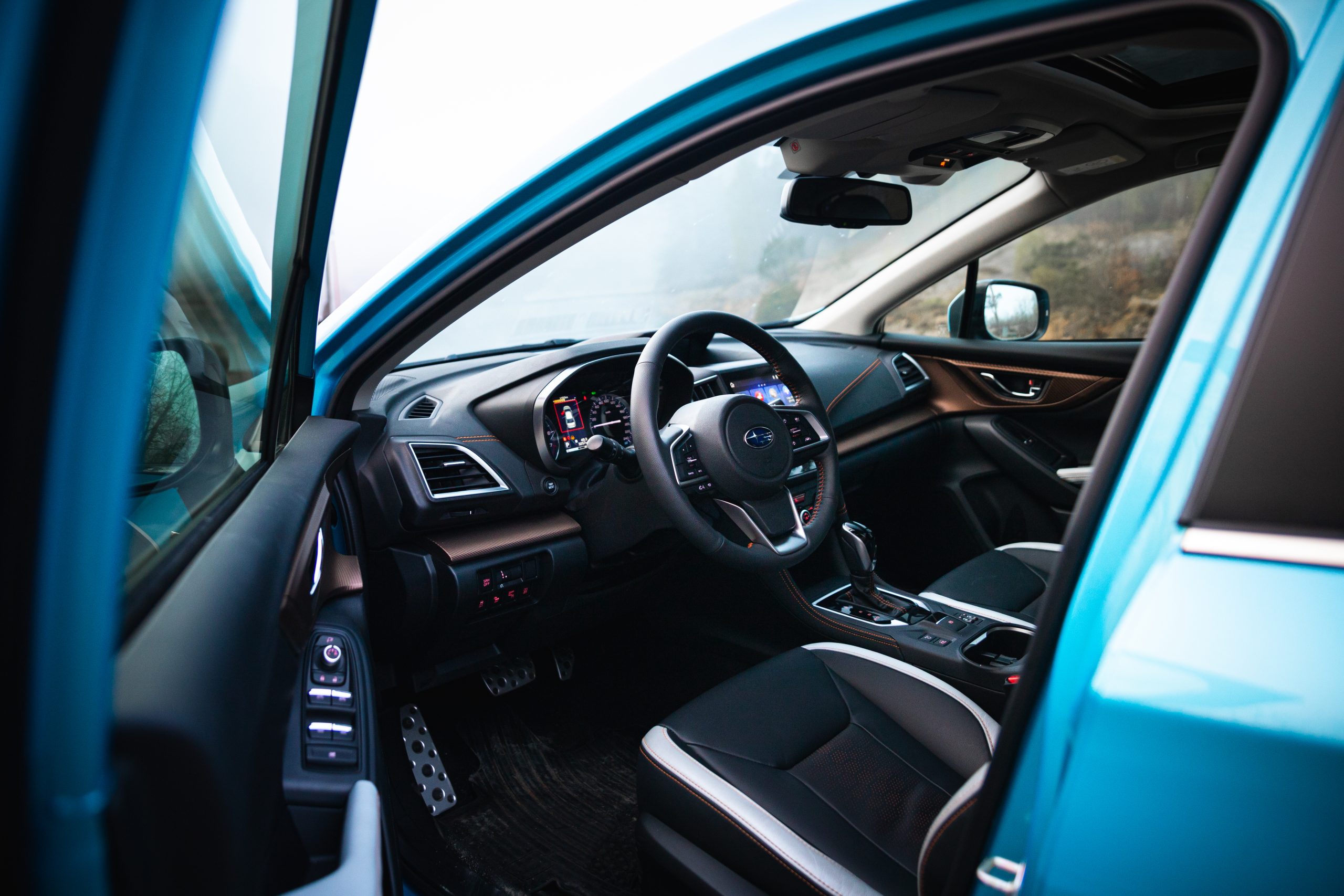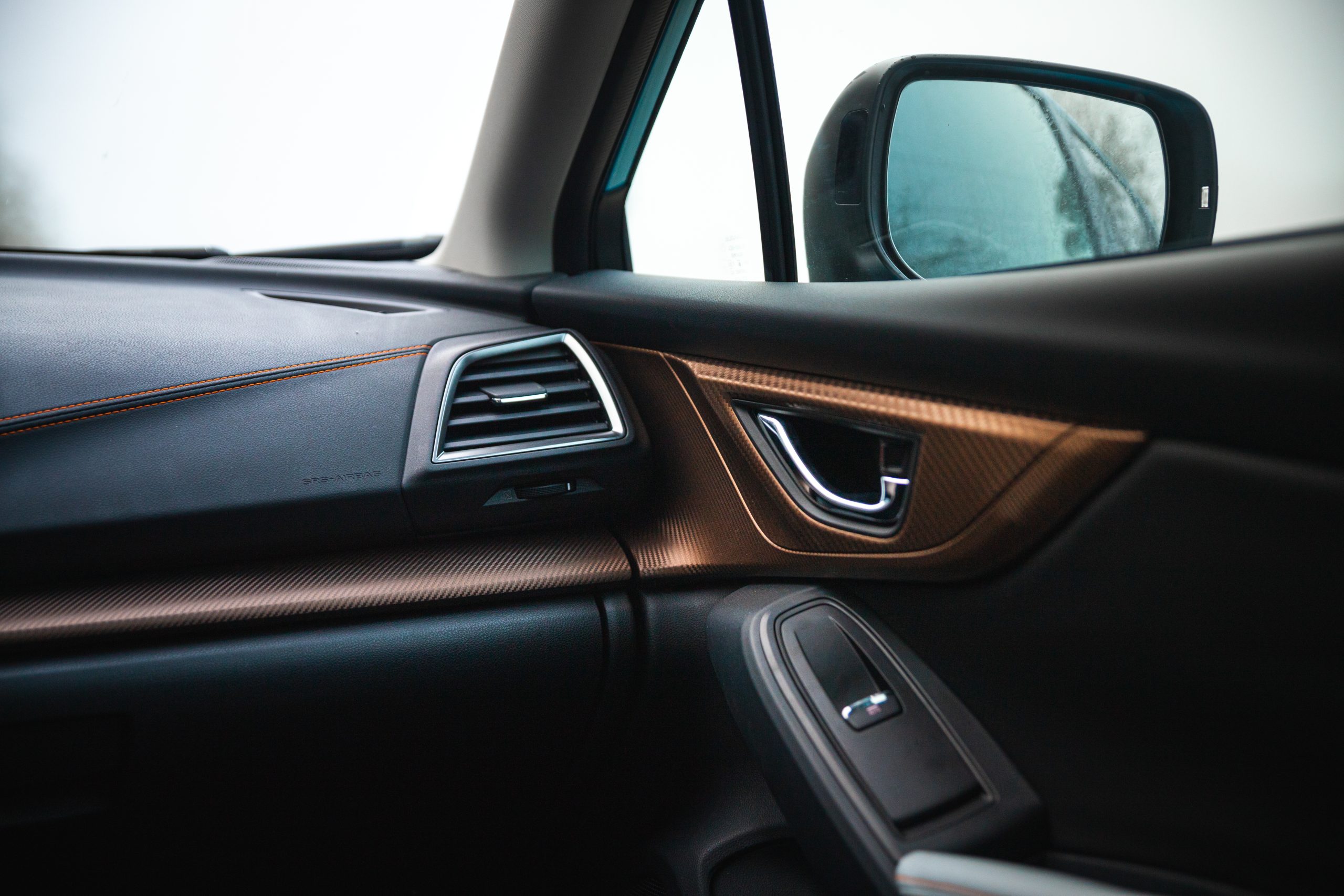 Inredningen bjuder på både positiva och negativa inslag där en bra kvalitetskänsla i alla reglage och knappar är särskilt utmärkande. Kopparfärgad fejkkolfiber i framdörrarna står däremot för ett av de mer underliga inslagen, särskilt när man noterar att bakdörrarnas inlägg är av samma material men istället i en svart kulör. När man väl kör bilen känns det påtagligt ofta som att man framför ett jaktflygplan, dels för att kupen är belamrad med en knapp för varje funktion och dels för att bilen avger ett pip varje gång säkerhetssystemet med namnet EyeSight ser en bil framför sig, ljudet är utformat så det snarare låter som att jag låst en jaktrobot på min medtrafikant.