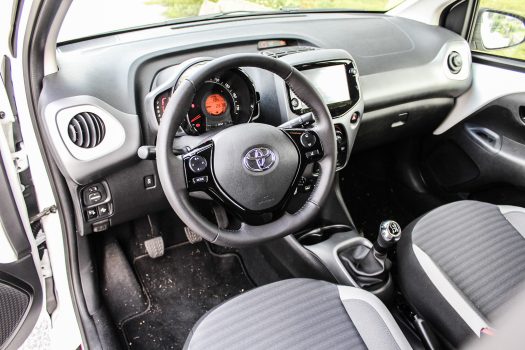 På insidan känns dock allt billigt. Det är hårdplast som gäller, dörrarna känns som om de är tillverkade av papp och stolarna är lövtunna. Allt är så enkelt som möjligt men samtidigt är Aygo förvånansvärt välutrustad med farthållare, backkamera och filhållningsassistans.