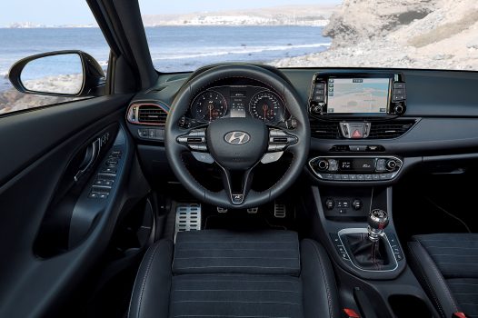 Ett genomgående tema är röda detaljer i sann racinganda, något som återgår både exteriört och interiört. Stolarna är härligt kupade och pryds av alcantara och läder med röda sömmar och kupén känns genomgående välbyggd sett till materialval, med undantag för somliga plastdetaljer som för tankarna till en leksaksbil – imponerande för en Hyundai i småbilssegmentet. Infotainmentsystemet är dock aningen svårarbetat och ljudsystemet är på sin höjd mediokert. Det är tydligt var man skär ned på kostnader. Något positivt är dock att man i egenskap av förare har en mängd information avseende själva körningen tillgänglig intill hastighetsmätaren.