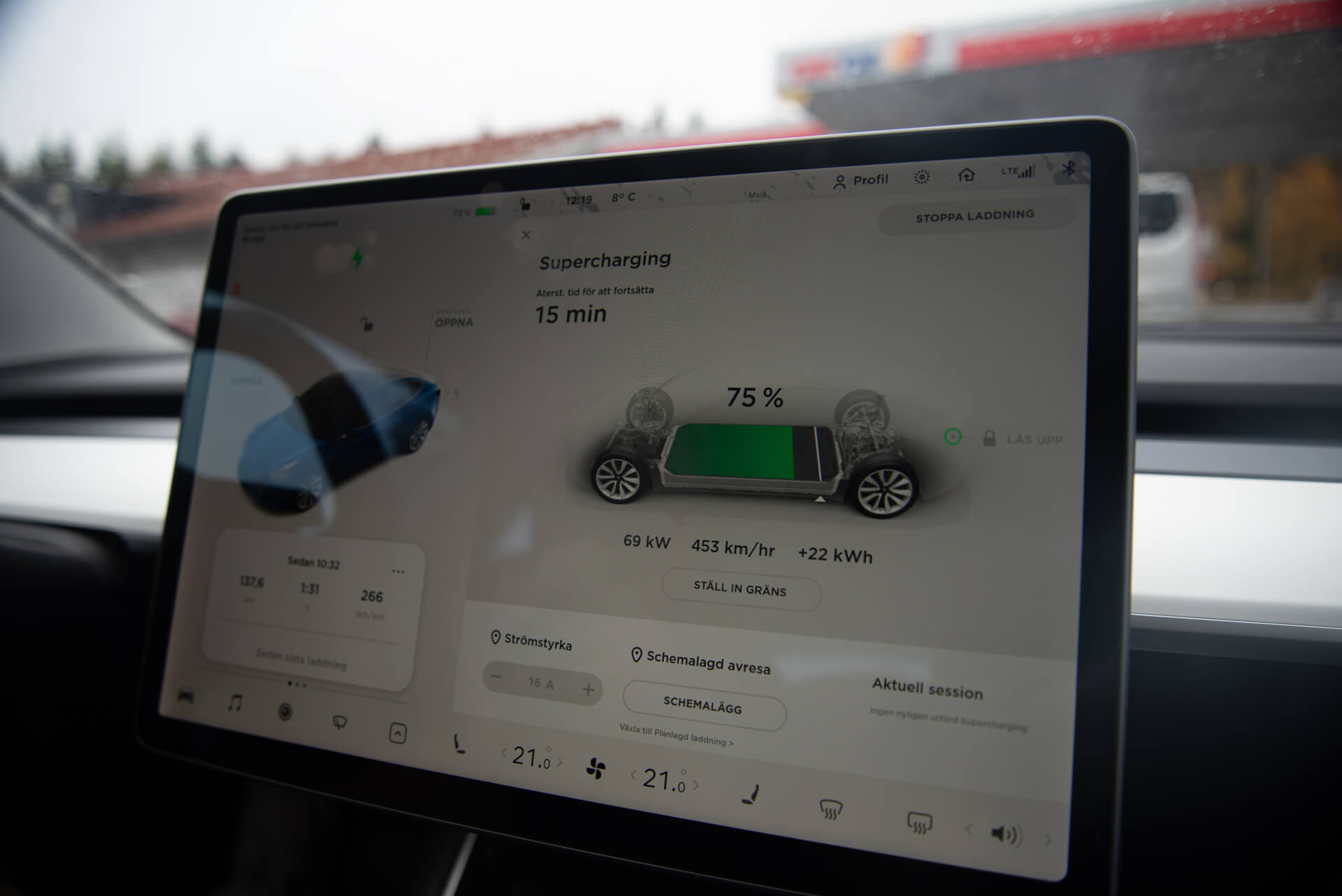 Det gick lika smidigt varje gång – koppla in och så kickar laddningen prompt i gång. Ytterligare en fördel med en Tesla är att det går att spela spel på den enorma skärmen och även titta på film när man laddar. Vi kombinerade laddstoppen med alla behov som ändå måste uträttas när man kör närmare 100 mil.