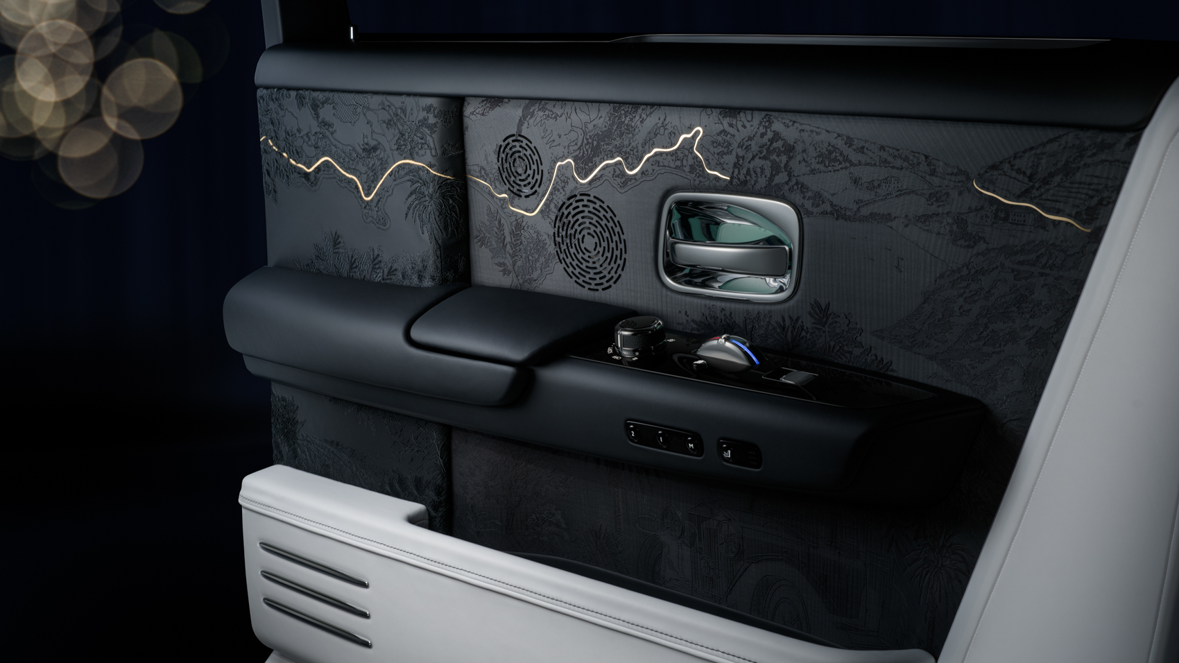 Träarbetet är det mest avancerade i Rolls-Royces historia. Dörrpanelerna i mörkbetsad Blackwood berättar tre historier.