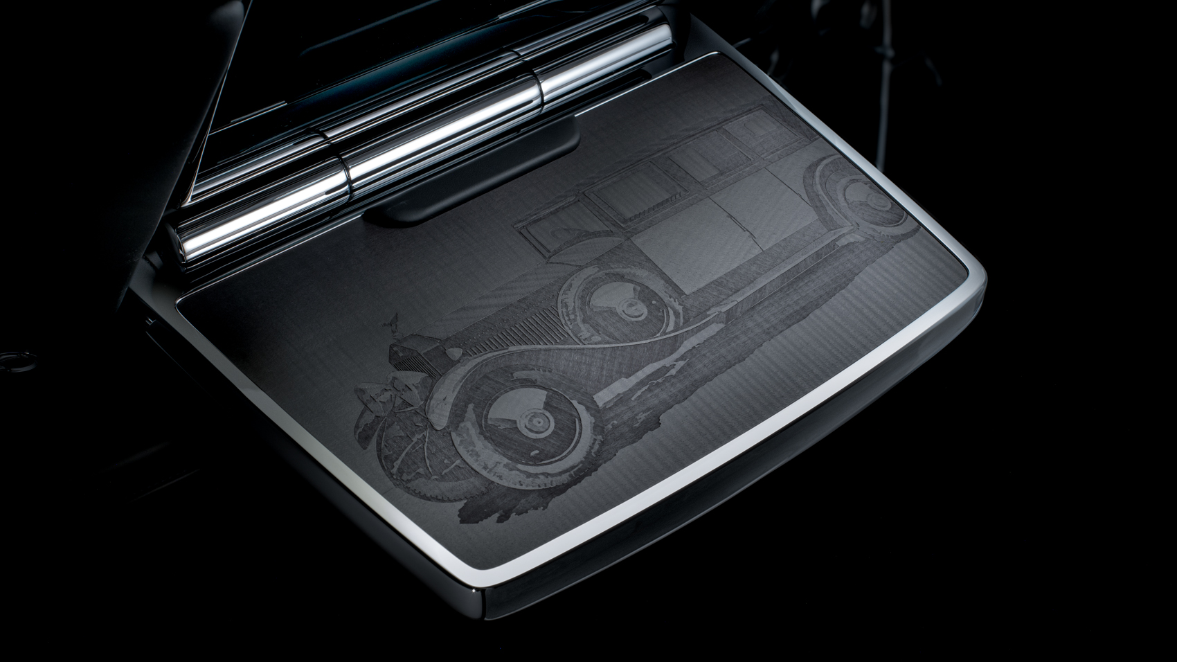 Picknickborden i baksätet är graverade med Phantom I från 1925 och dagens Phantom VIII, en tydlig koppling mellan då och nu.