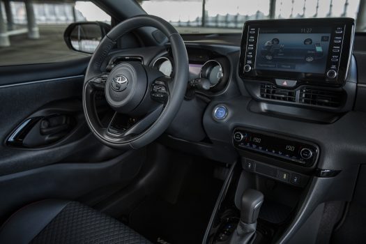 Interiörmässigt ser vi ett rejält uppsving vad gäller materialval och utformning. Instrumentbrädan är placerad lägre, medan A-stolparna har dragits bak för bättre sikt. Nya Yaris är samtidigt bestyckad med en 10-tums head-up-display, vilket sammantaget bidrar till en mer förarorienterad layout. I övrigt är komforten fullt duglig, trots att kupén snabbt fylls av däckbuller samt gnälligt motorljud i höga farter, och designspråket är genomgående stilrent vilket förhöjer kvalitetskänslan.