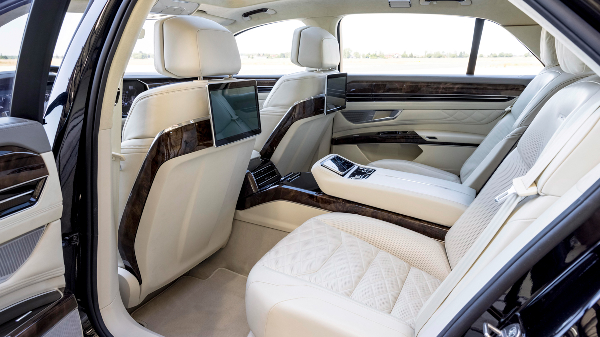 Insidan genomsyras av lyx i alla möjliga former. Föraren och framsätespassageraren får ta del av den välvda display som idag sitter i Volkswagens flaggskepps-SUV – Touareg. I baksätet finns träpaneler som bryter av mot den ljusa skinnklädseln, TV-skärmar och en kontrollpanel i mitten.