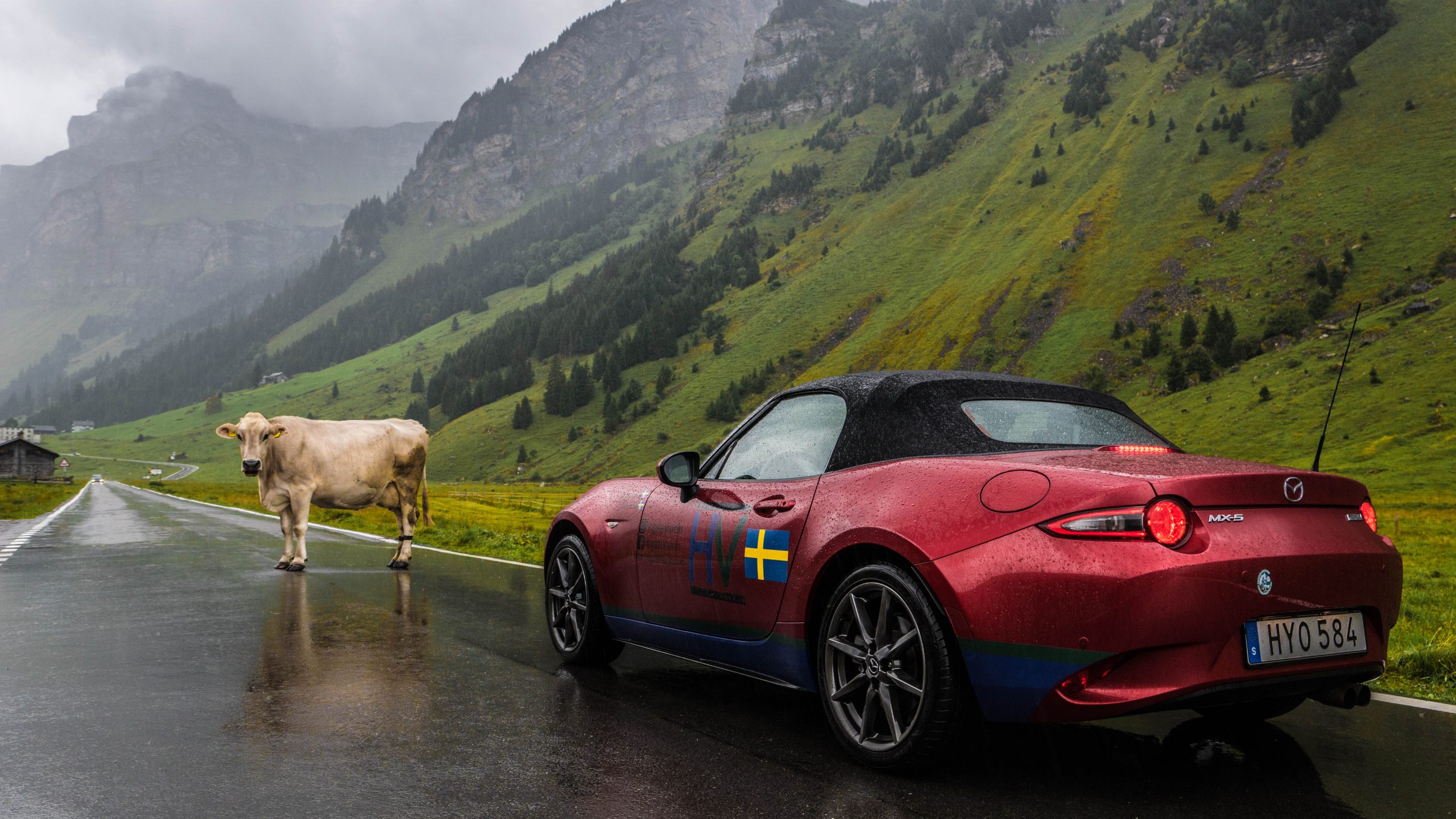 En sträcka som endast var 385 kilometer men med tanke på att snittfarten i alperna är lika hög som Islands (några centimeter per år) tog det ändå sin tid. Klausenpasset erbjuder fina vyer och – precis som alla alppass – mycket engagerande körning. Det regnade otroligt mycket vilket var till vår fördel – eftersom de 160 hästkrafterna under huven på MX-5 absolut inte hade svårigheter att få ut bakändan när underlaget var blött. Sustenpasset erbjöd istället snöfall och dimma vilket inte var en höjdare. När vi väl kom till Luzern var det första dagen som vi faktiskt kunde gå och lägga oss en rimlig tid.