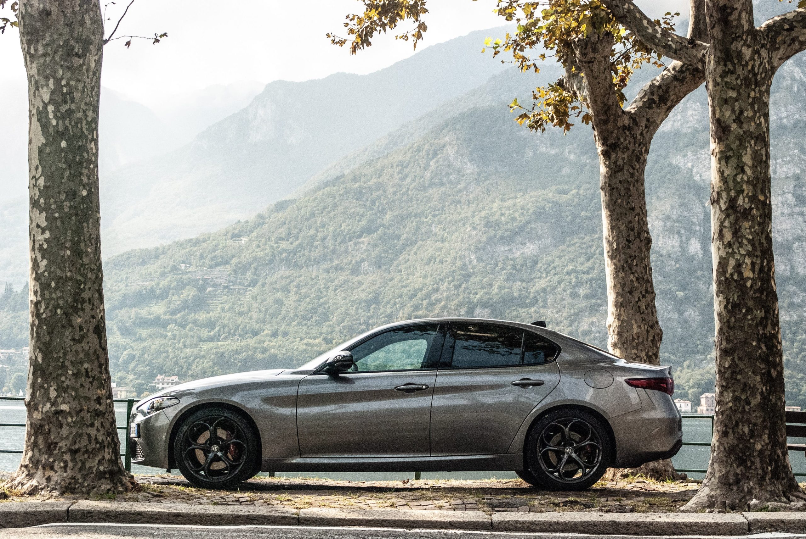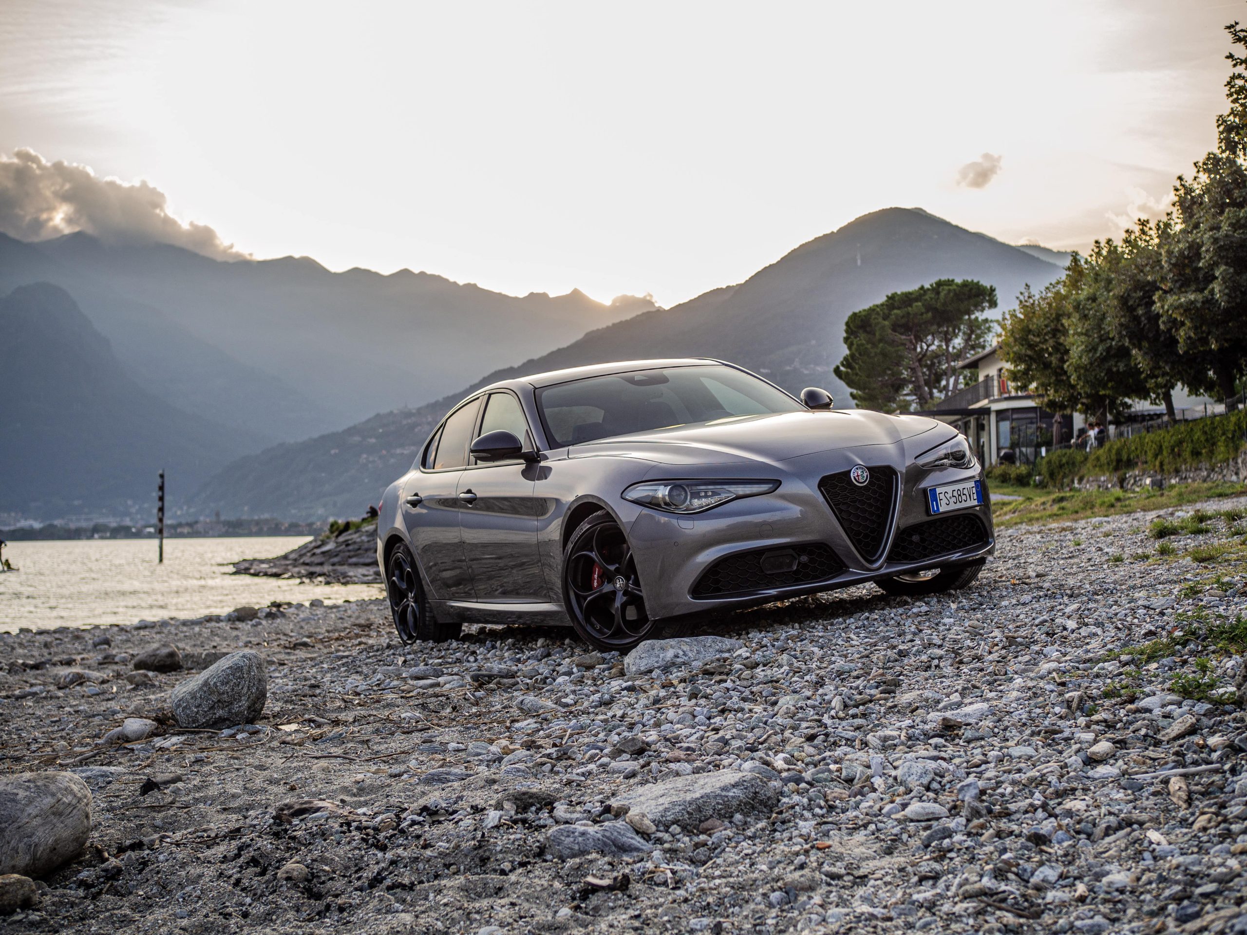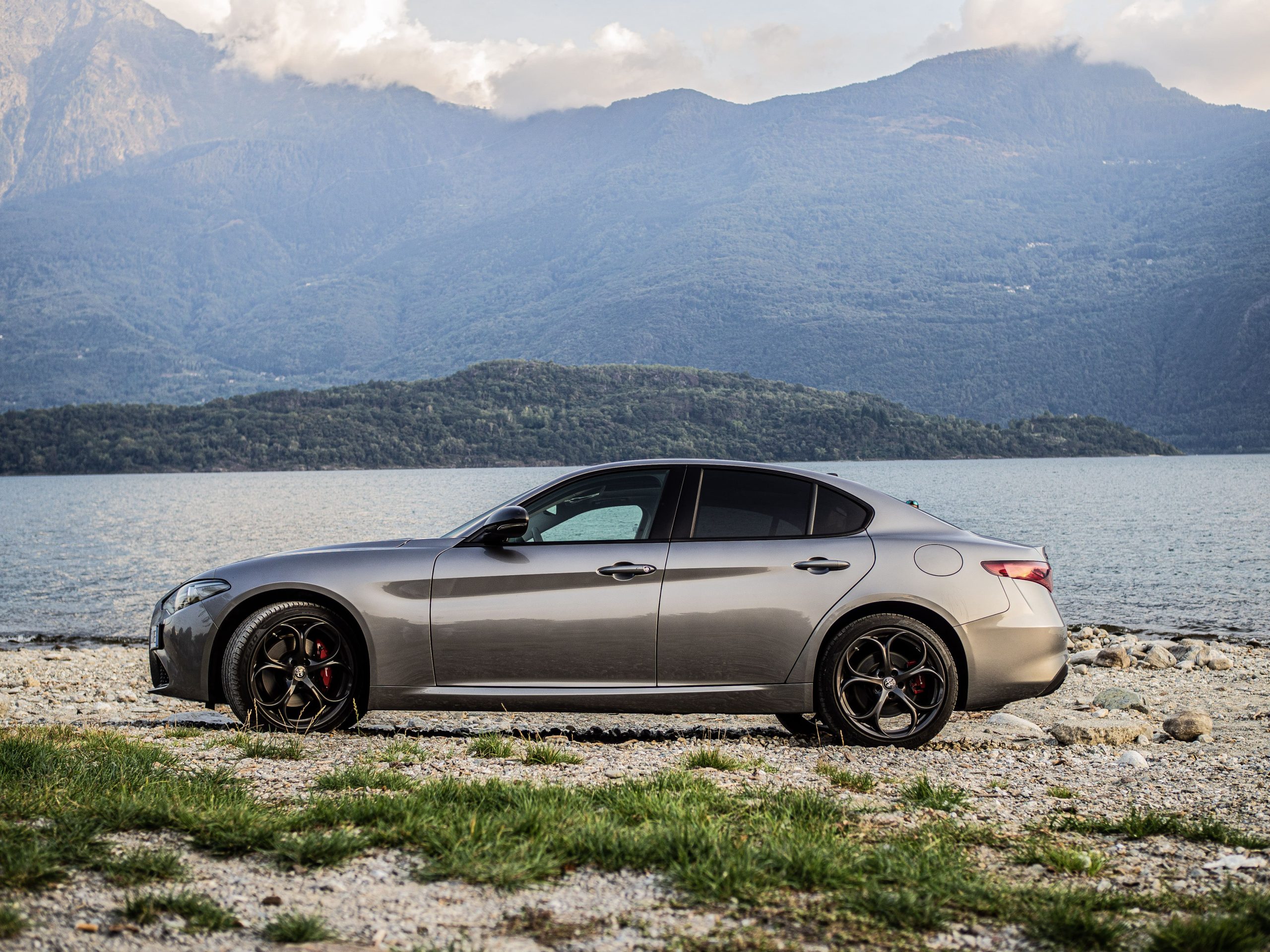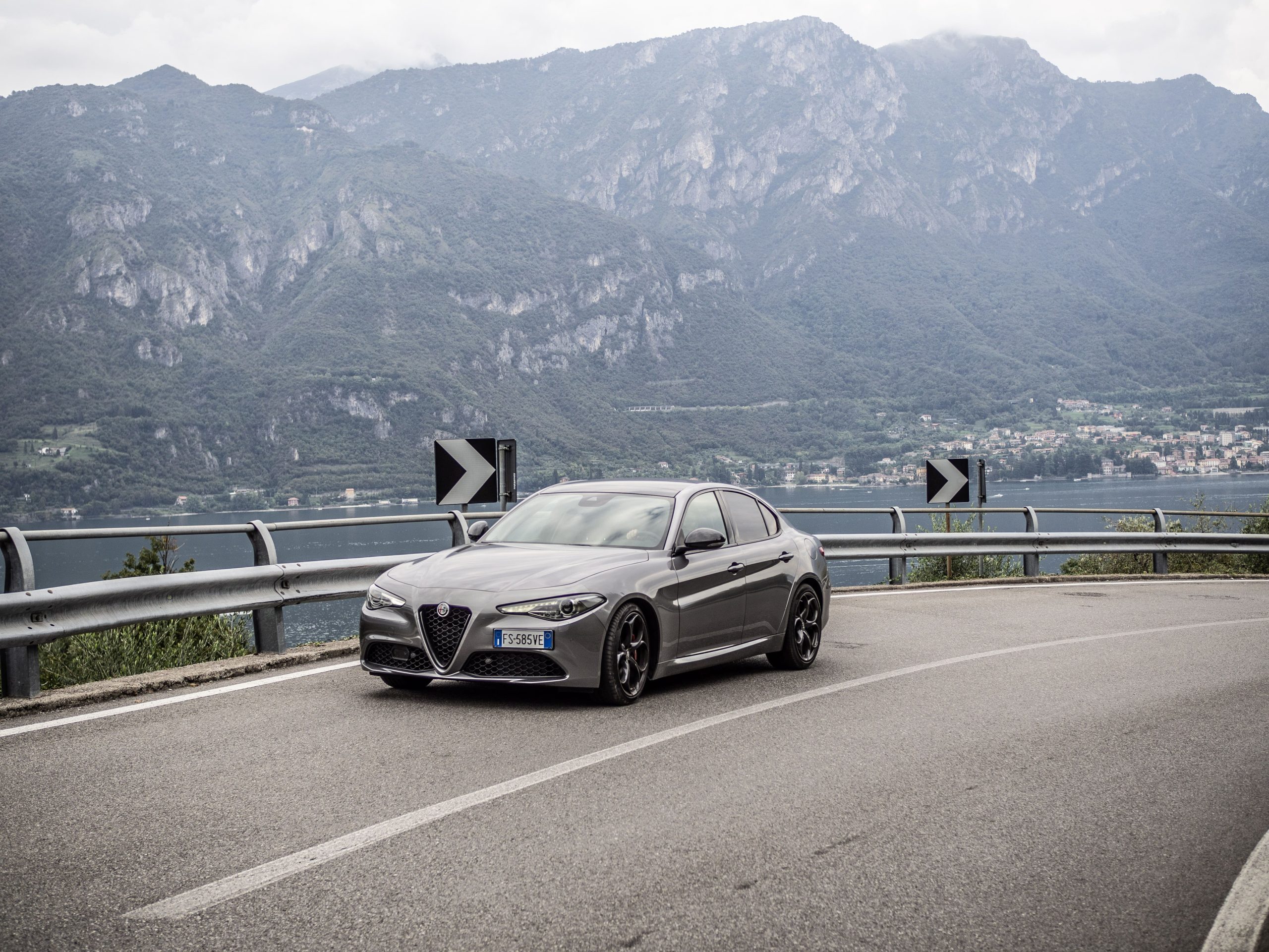 På de lite kurvigare vägarna utefter sjön ville vi, precis som alla som köper en Alfa Romeo Giulia med tjänstebilsdiesel, låtsas att vi inte hade varianten med tjänstebilsdiesel. Drömmen om att framföra en Giulia Quadrifoglio genom berg och dalar hade hållits vid liv ända fram till första ordentliga gaspådrag. Tack vare prestandapaketet hade vi nämligen välsignats med aktiv fjädring, diffbroms och Alfa Romeos fenomenala växelpaddlar; tyvärr hade den vänstra av dessa böjts så att den satt alldeles för nära ratten i sitt utgångsläge.