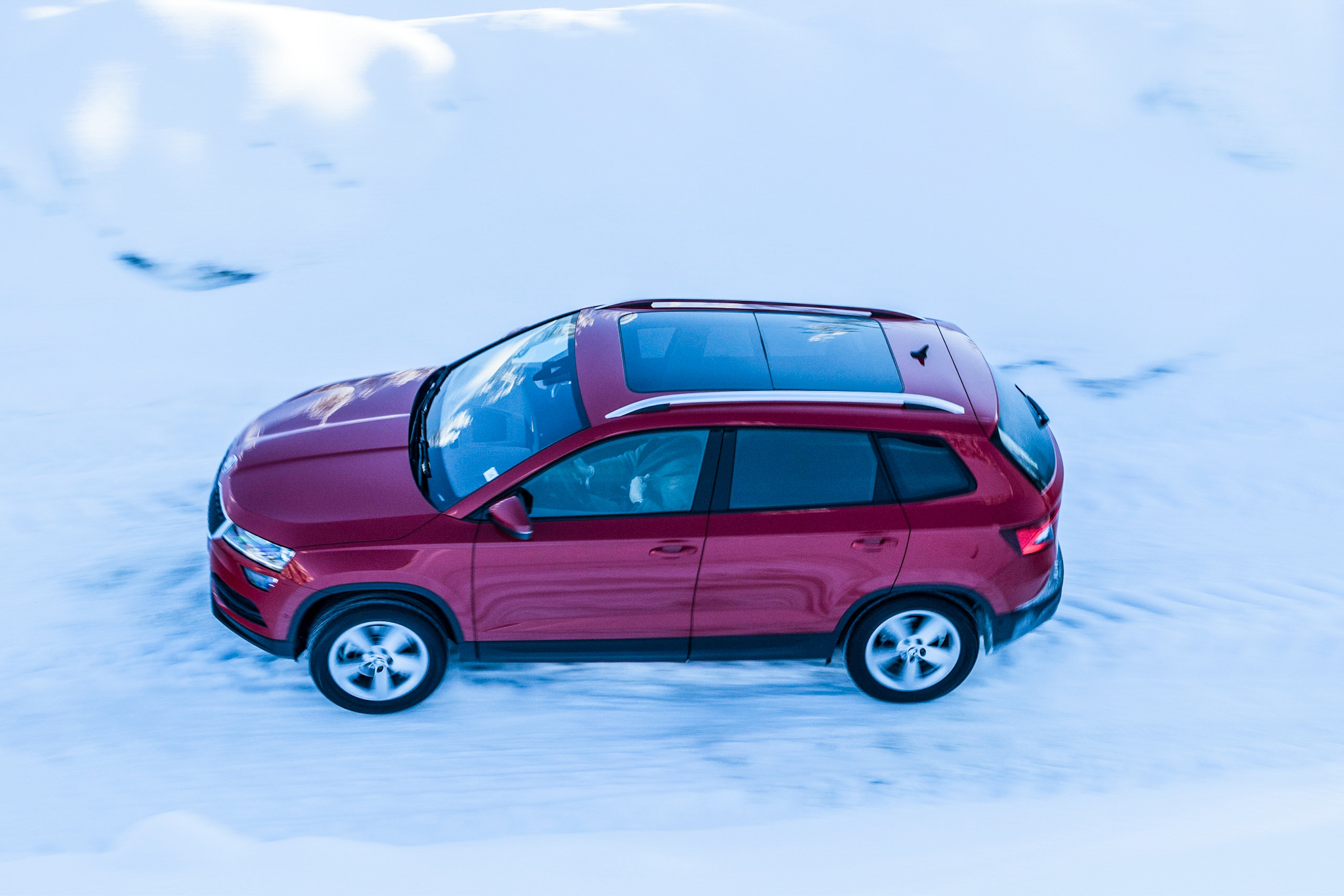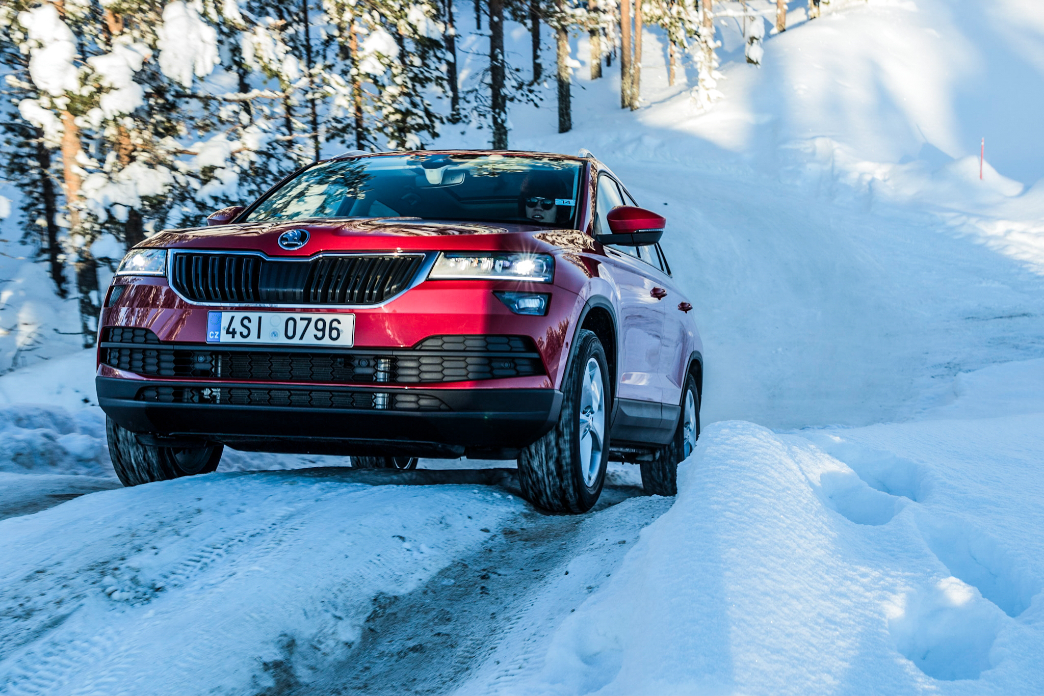 Det var sedan dags att ge sig ut på en offroad-bana, naturligtvis även då i Kodiaq och Karoq. Kodiaq är mer av en skogsmulle än man kanske anar och tuffade på bra både genom djup snö och upp för isiga backar. Karoq hade dock lite svårare att tackla den djupa och hårt packade snön med sin lägre markfrigång. Men alla vet väl att himlen är blå? Föga förvånande.