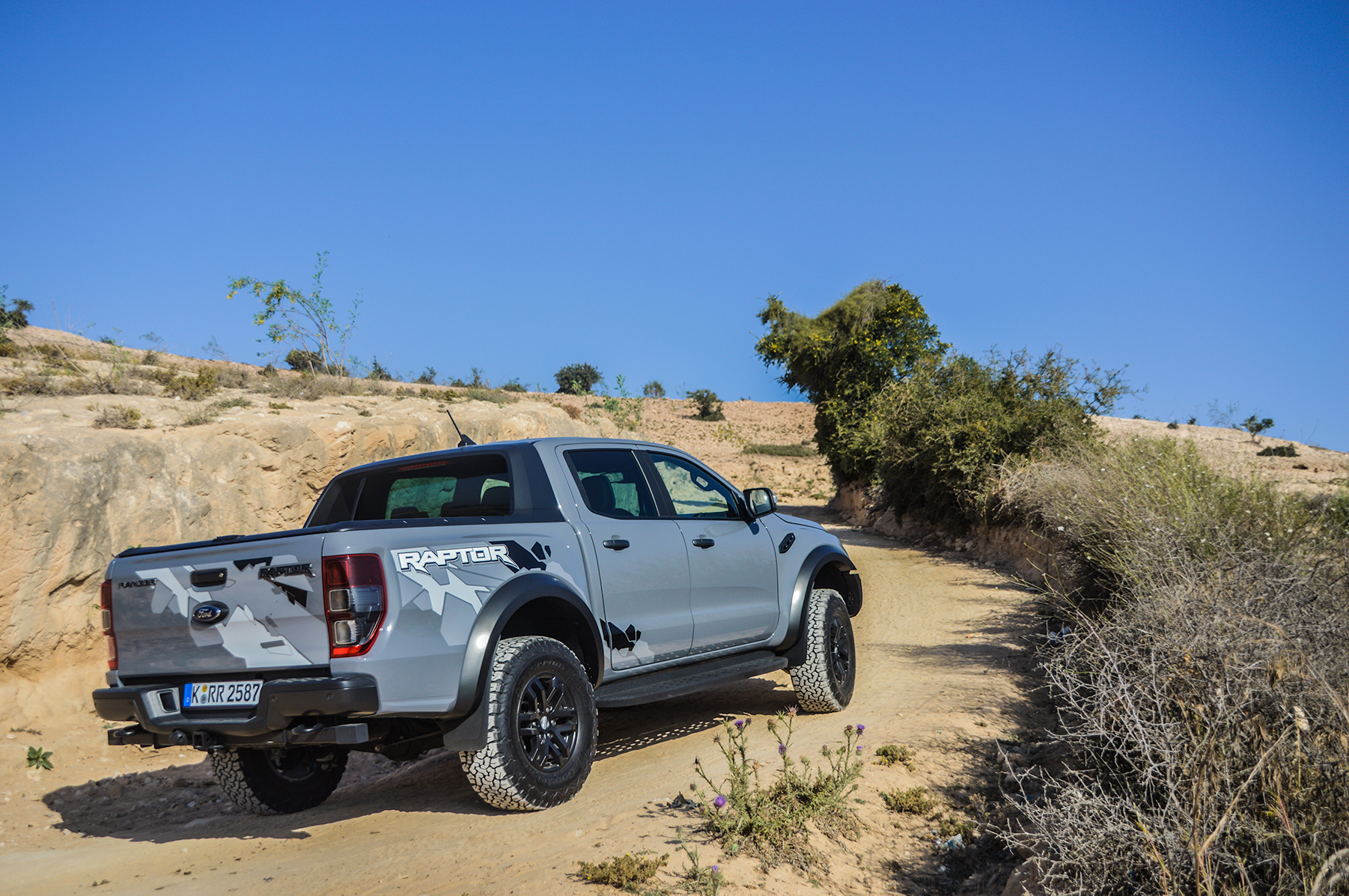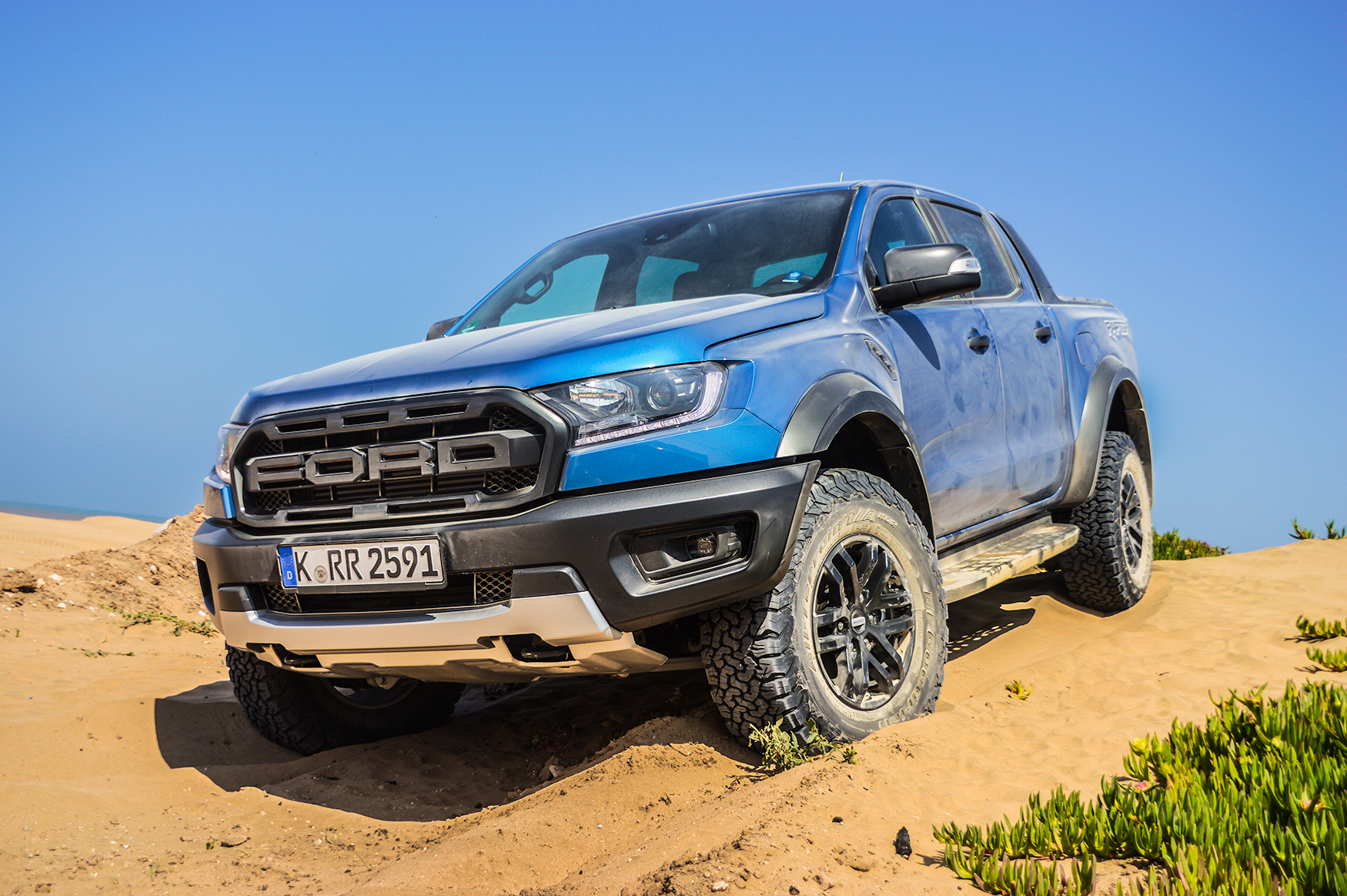 Ford Ranger Raptor kommer också med ett antal körlägen från sport till sand och sten. Det bästa läget är dock baja som låter föraren köra som en riktig racerförare över sanddynerna. Ranger Raptor känns inte bara tuff att köra offroad utan den ser också riktigt elak ut. Vanliga Ranger är på tok för smal och hög men Raptorns breddade hållning råder till stor del bot på det.