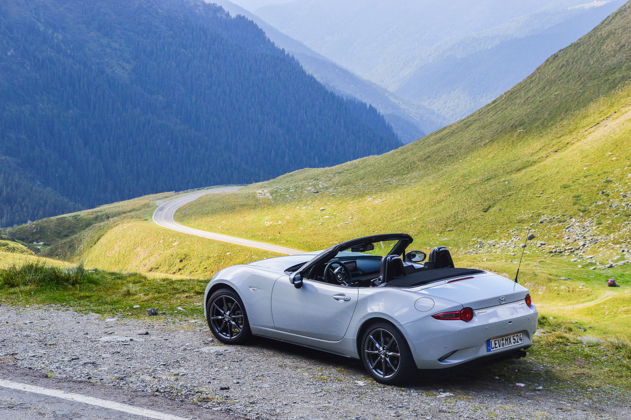 Så vad är Transfagarasan Highway? Kort fattat en liten del av himlen som förkroppsligat sig som en en alldeles spektakulär bergsväg i Transylvanien i Rumänien. Och varför har vi en Mazda MX-5 där nu igen? För att Mazda har gjort en försiktig uppdatering av bilen. Nytt är en extra hästkraft i 1,5-litersmotorn och respektabla 24 extra hästar i 2-literspannan. Dessutom får man nu med lite aktiva säkerhetsfunktioner som är bra att ha men som heller inte är livsavgörande i en liten sportbil.