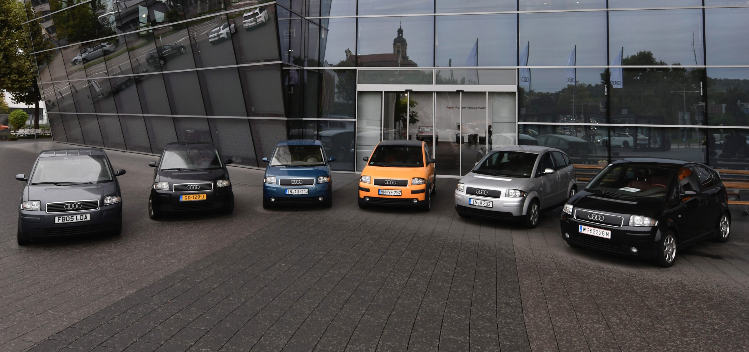 Dagen började utanför det storslagna komplexet Audi Forum Neckarsulm, där A2:or i en mängd olika varianter och kulörer stod uppradade.