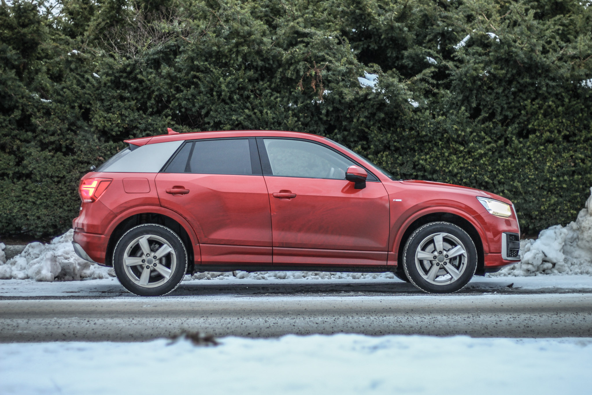Q2:an som vi testade var inte utrustad med fyrhjulsdrift vilket ofta gjorde sig påmint under de vinterförhållanden som bilen testades i. Gasen i botten resulterade oftast i en väldig massa oljud snarare än blixtsnabb acceleration. När den väl fick grepp upplevdes som den ha åtminstone 50 extra hästkrafter. För att bara ha 150 kusar under huven var den faktiskt orimligt kvick, stundtals lite för kvick, trots att komfortläget var aktiverat. Dock lider Q2 av ett stort problem. Precis som så många av dess konkurrenter har den blivit försedd med fjädring som till synes är tillverkad av trä. Den lyckas finna ojämnheter i de mest jämna av väglag. Javisst, föraren får en bättre koppling till vägen men om jag ska färdas så obekvämt som jag gör i en Q2 förväntar jag mig åtminstone att den gör 0-100 på en halv sekund men så är alltså inte fallet.