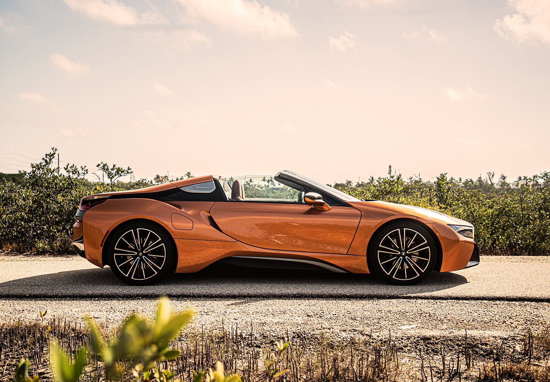 Styrningen känns något gummi-aktig men ändå kommunikativ, och däcken som är smala nog att passa på en cykel gör att man inte behöver köra för kung och fosterland för att stimuleras. Den är genuint underhållande att köra men saknar den dramatik som en mer traditionell drivlina hade erbjudit. Körupplevelsen är unik, något som har att göra med dess ivrighet och det helt otroliga samspelet mellan alla bilens komponenter. Det är givetvis med taket nedfällt som roadstern ska köras – inte minst i Florida – och den lyckas väl med det. Det är knappt något vindbrus i kupén vilket gör att man kan konversera även på motorvägen. Istället för att upplevelsen kompromissas som fallet är i många andra cabrioleter, ser i8 Roadster till att allt istället förgylls.