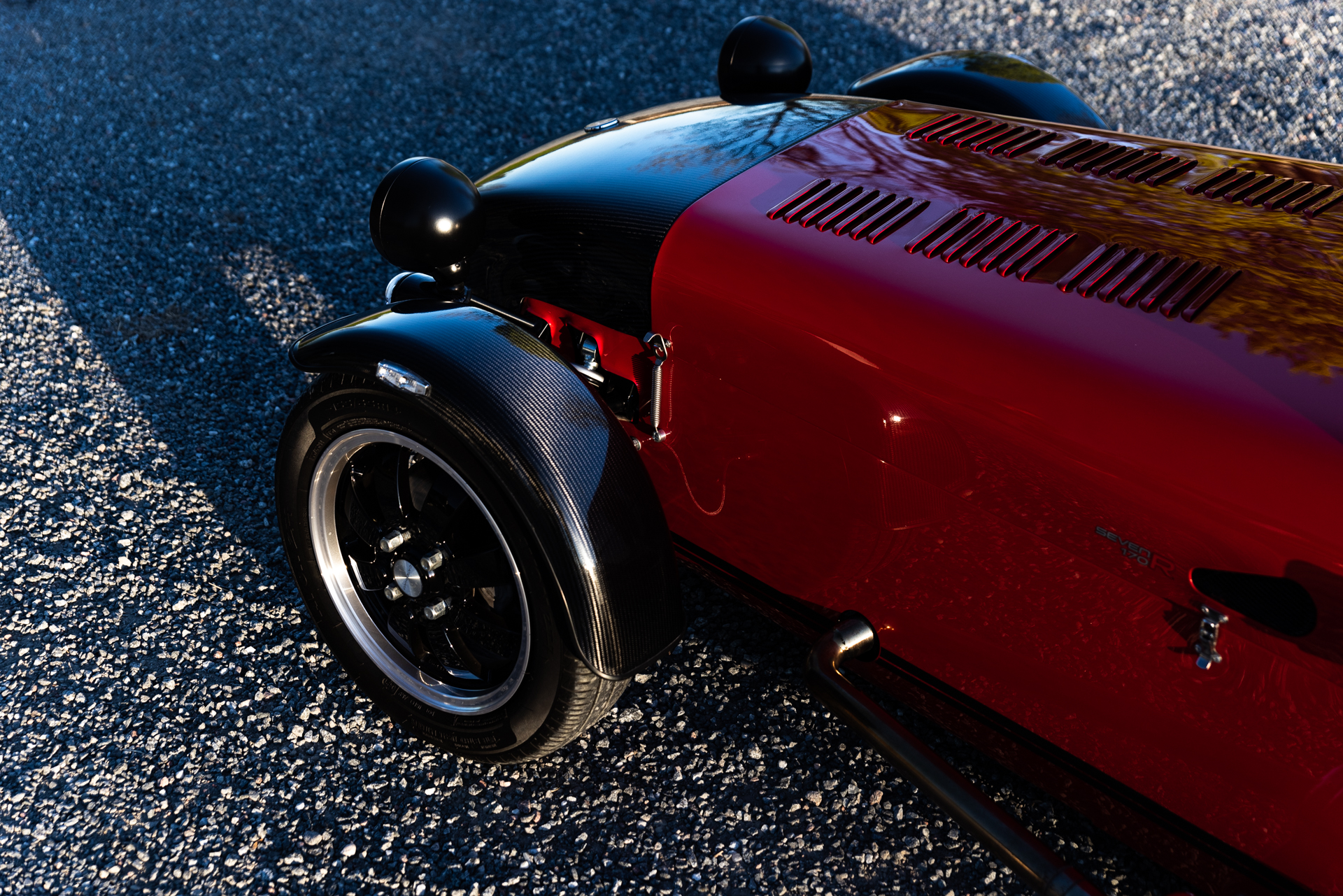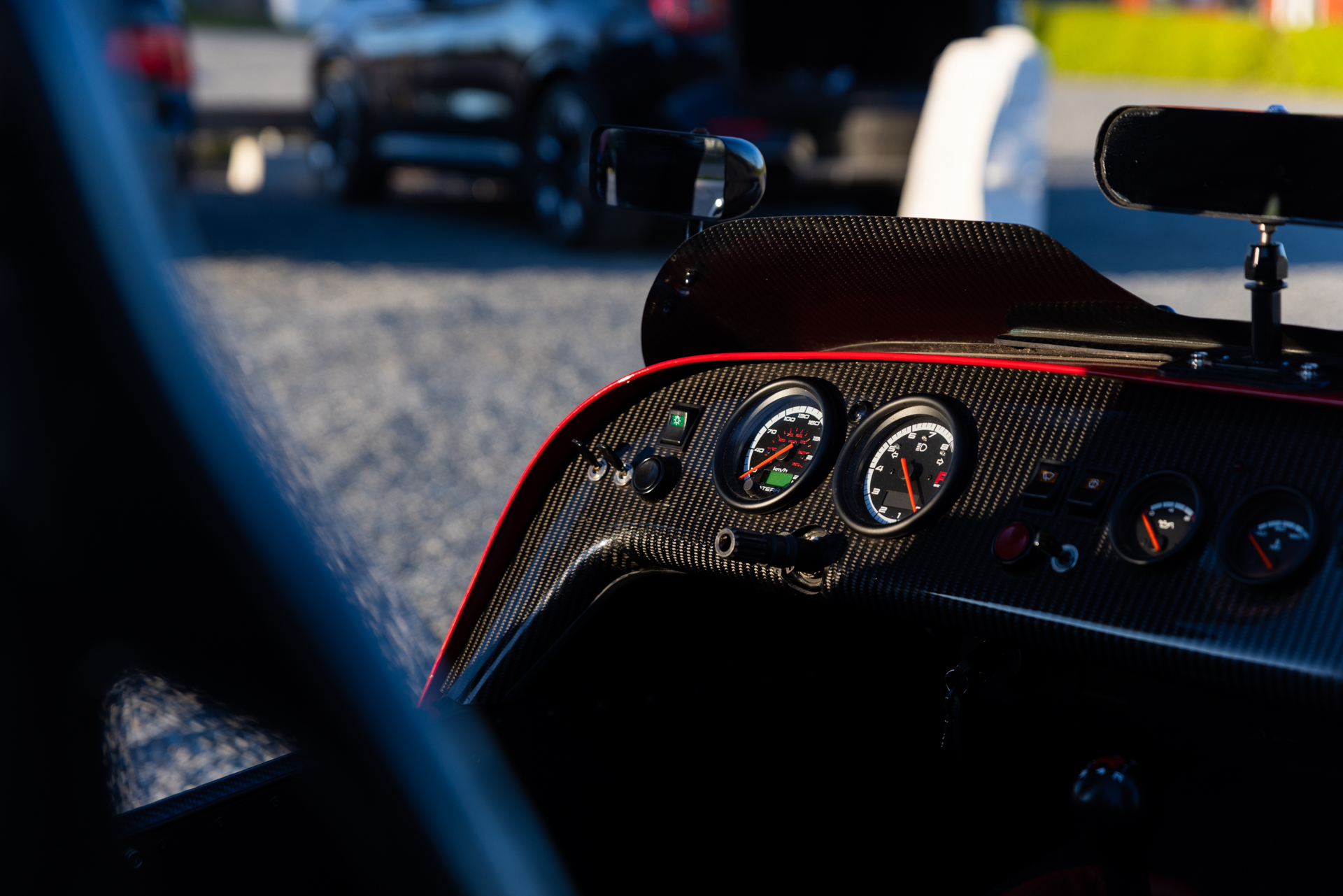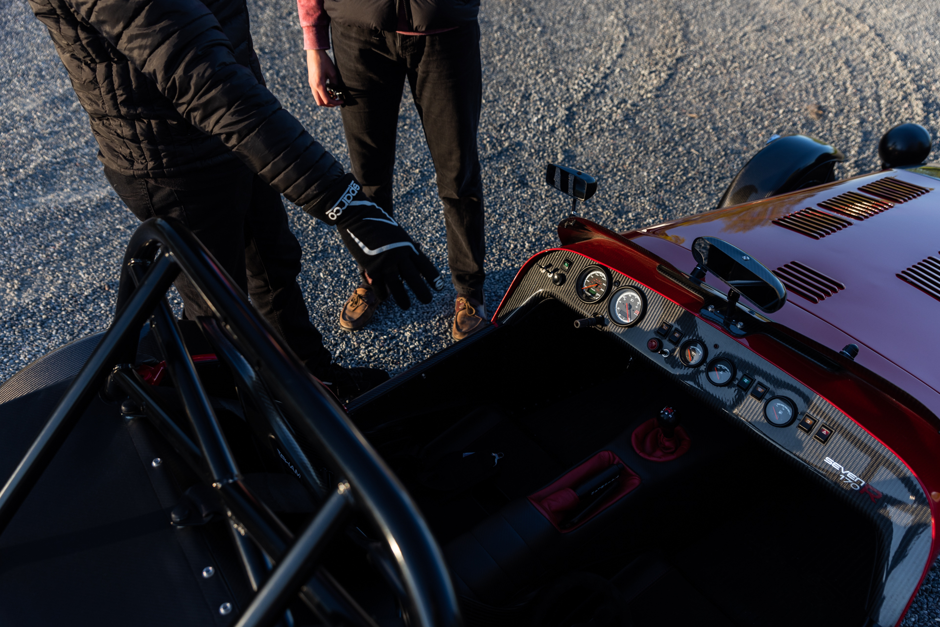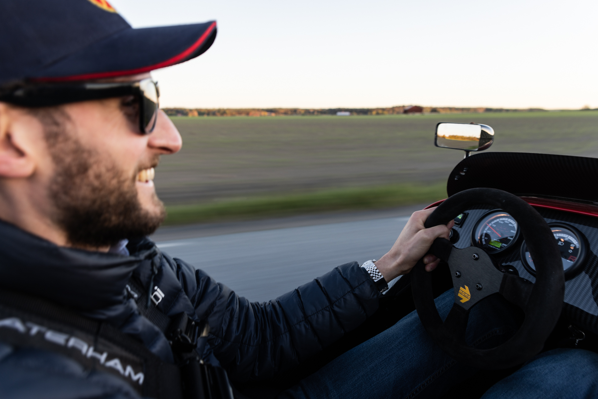 Det första man slås av när man ser 170R för första gången är hur otroligt liten den är. Andra Caterham-modeller erbjuder både längre hjulbas och bredare kaross, men i denna märkets minsting är det långt ifrån garanterat att man får plats. En person i sällskapet kunde inte komma ner i de tighta kolfiberstolarna, och jag själv fick ta av mig skorna för att kunna sköta pedalerna.