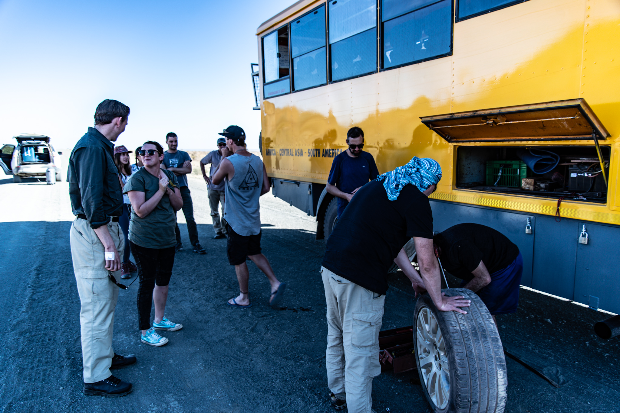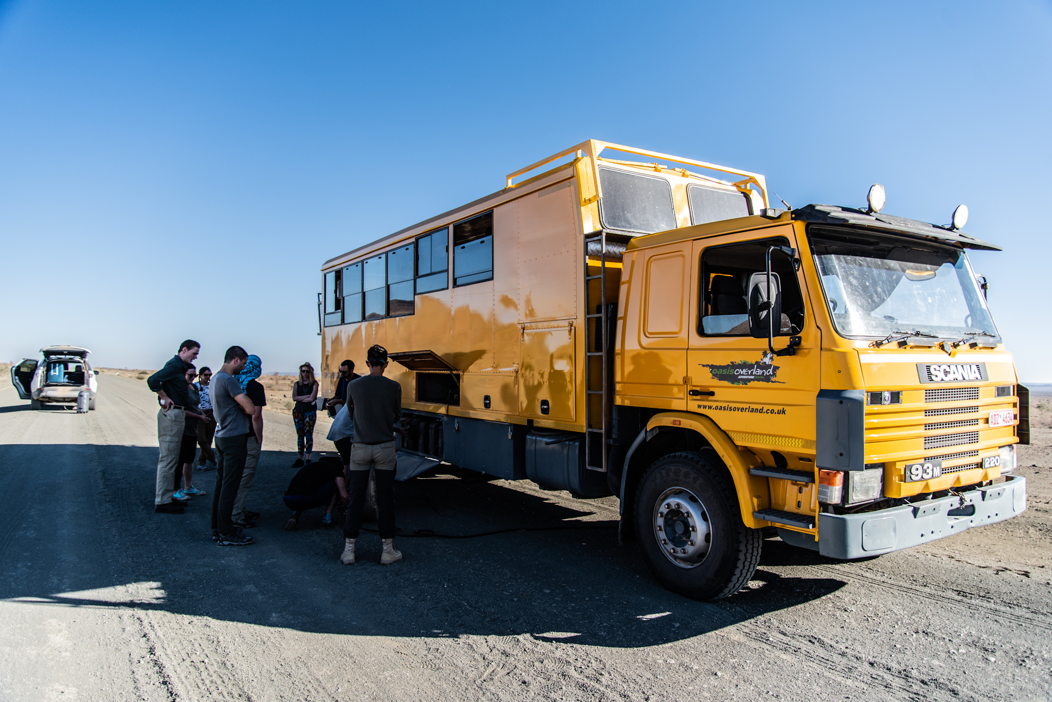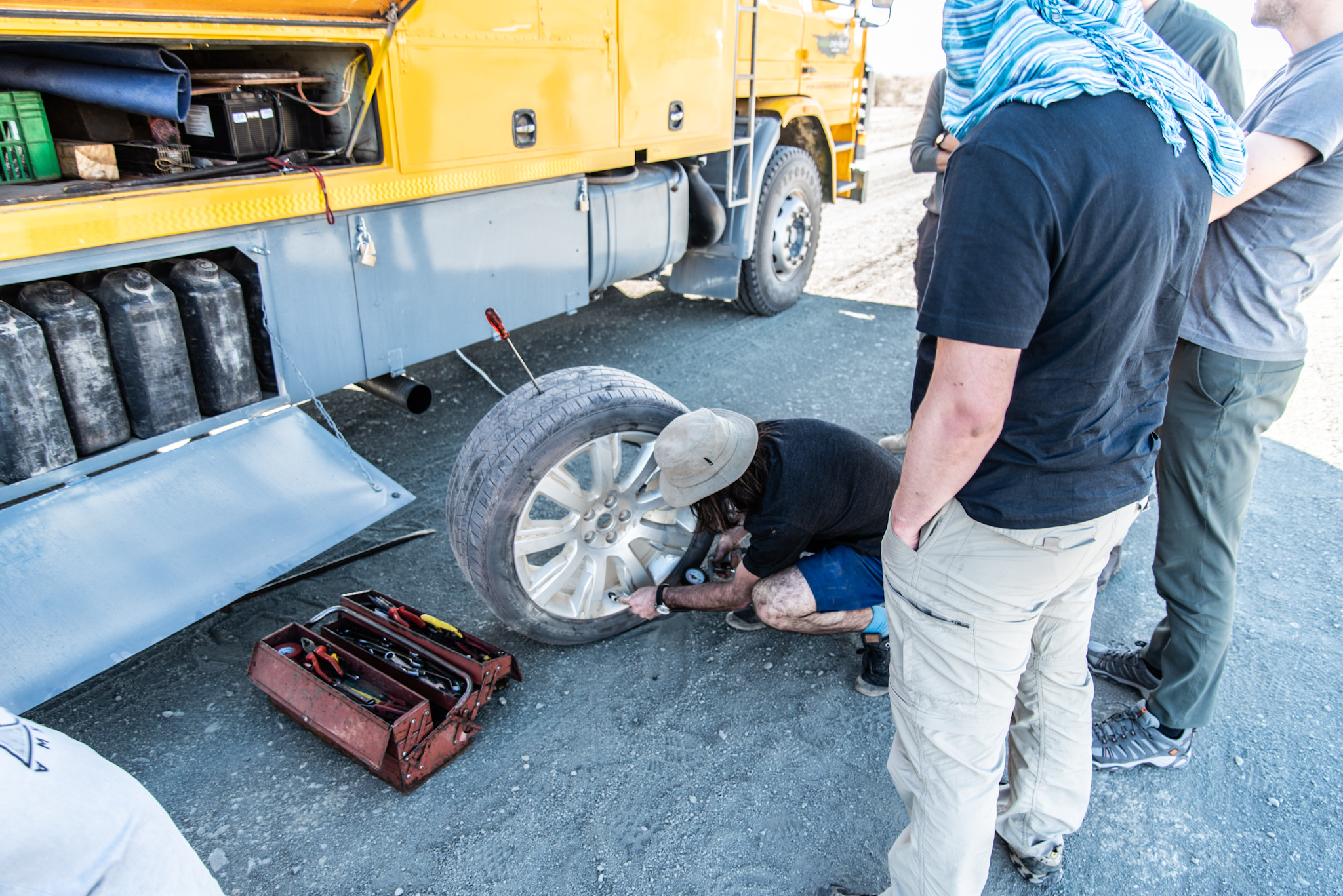 Eftersom Fish River Canyon är ett populärt resmål dröjde det inte länge tills det kom en bil. Som blåste förbi oss i minst 150 – fördelen med bra däck uppenbarade sig en än gång. Efter cirka en kvart kom det dock en enorm buss innehållandes turister som skulle från Kapstaden till Kairo, stort tack till Oasis Overland; ett företag som arrangerar resor jorden runt. De fixade vårt punkterade däck från dagen innan så vi kunde köra till närmaste samhälle, fyra mil bort, där vi lyckades lösa en något mer permanent lösning och körde plattan i mattan hela vägen tillbaka till Upington för att få våra nya däck. Att gränsvakterna vid både de namibiska och sydafrikanska gränserna höjde på ögonbrynen är förståeligt, men efter att ha förklarat situationen och fått 18 nya stämplar i passet var vi äntligen tillbaka där vi började dagen innan.
