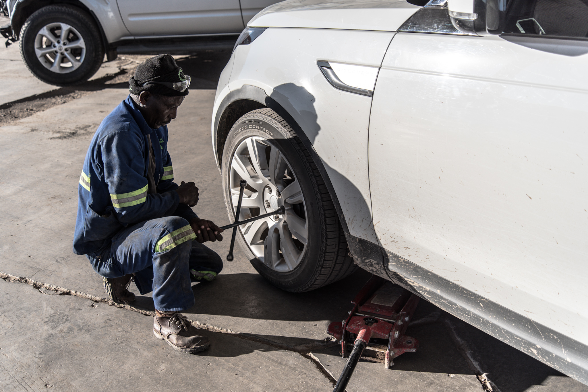 När vi anlände till Land Rover-verkstaden som skulle ha fått nya däck under natten möttes vi av beskedet att de inte hade några däck och att vi skulle till den lokala däckverkstaden. Sagt och gjort. Där hade de inte heller några däck vilket dessutom inte är särskilt lätt att fixa fram i ett litet sydafrikanskt samhälle på en lördag. Efter flera samtal visade det sig att däcken helt enkelt inte kommit fram vilket istället ledde till att vi fick ta däcken från verkstadsägarens privata Land Rover Discovery. För det är vi evigt tacksamma. Men än var det inte slut på äventyret…