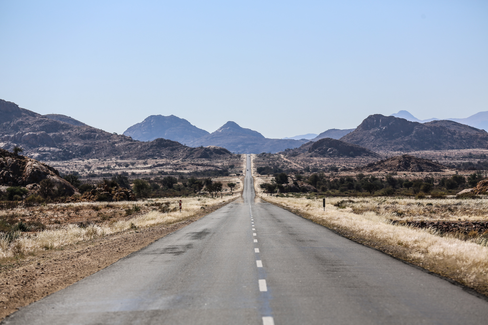 Morgonen därpå var det Upington till Lüderitz, Namibia som stod på tur, en sträcka på cirka 75 mil. Vägen är i princip spikrak hela vägen, något som är typiskt för vägnätet speciellt i Namibia – raksträckor som sträcker sig mil efter mil utan tillstymmelse till trafik. Det i kombination med avsaknaden av trafikpoliser gör att man kan ligga och kryssa i väldigt höga hastigheter. Efter cirka fem timmar nådde vi en liten avstickare vi skulle till: Fish River Canyon. Det är en dal som ligger några mil på grusväg bort från asfalten men som tydligen ska vara rival till Grand Canyon i USA.