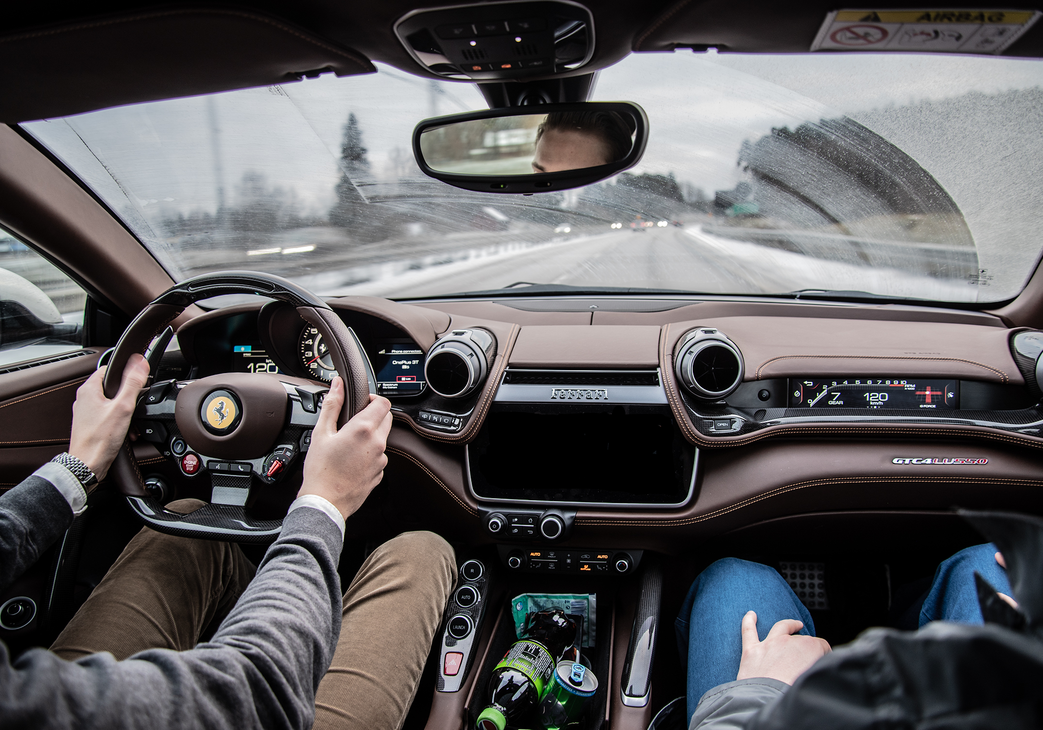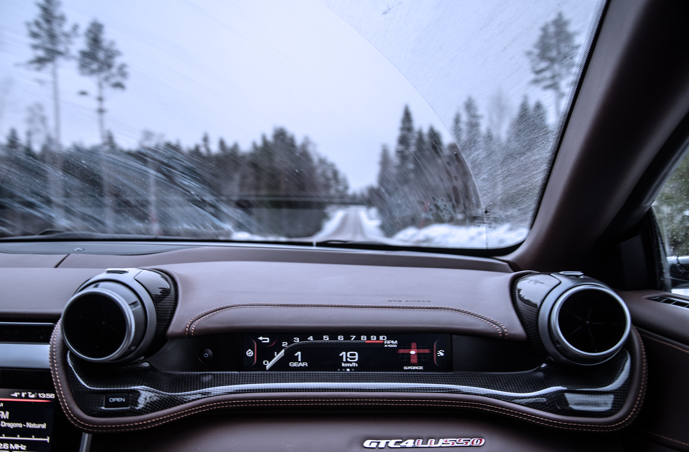Och motorn låter inte bara helt fenomenalt, den är dessutom otroligt kraftfull. 690 hästkrafter är knappast lite, och jag kan avslöja att det känns precis lika häftigt som det låter. Ferrari GTC4Lusso är infernaliskt snabb, så snabb att jag aldrig hann komma i närheten av att testa gränserna eftersom det var halt ute. De italienska vinterdäck som satt på bilen hjälpte knappast heller när det gällde att hålla sig i en rak linje på den istäckta landsvägen.