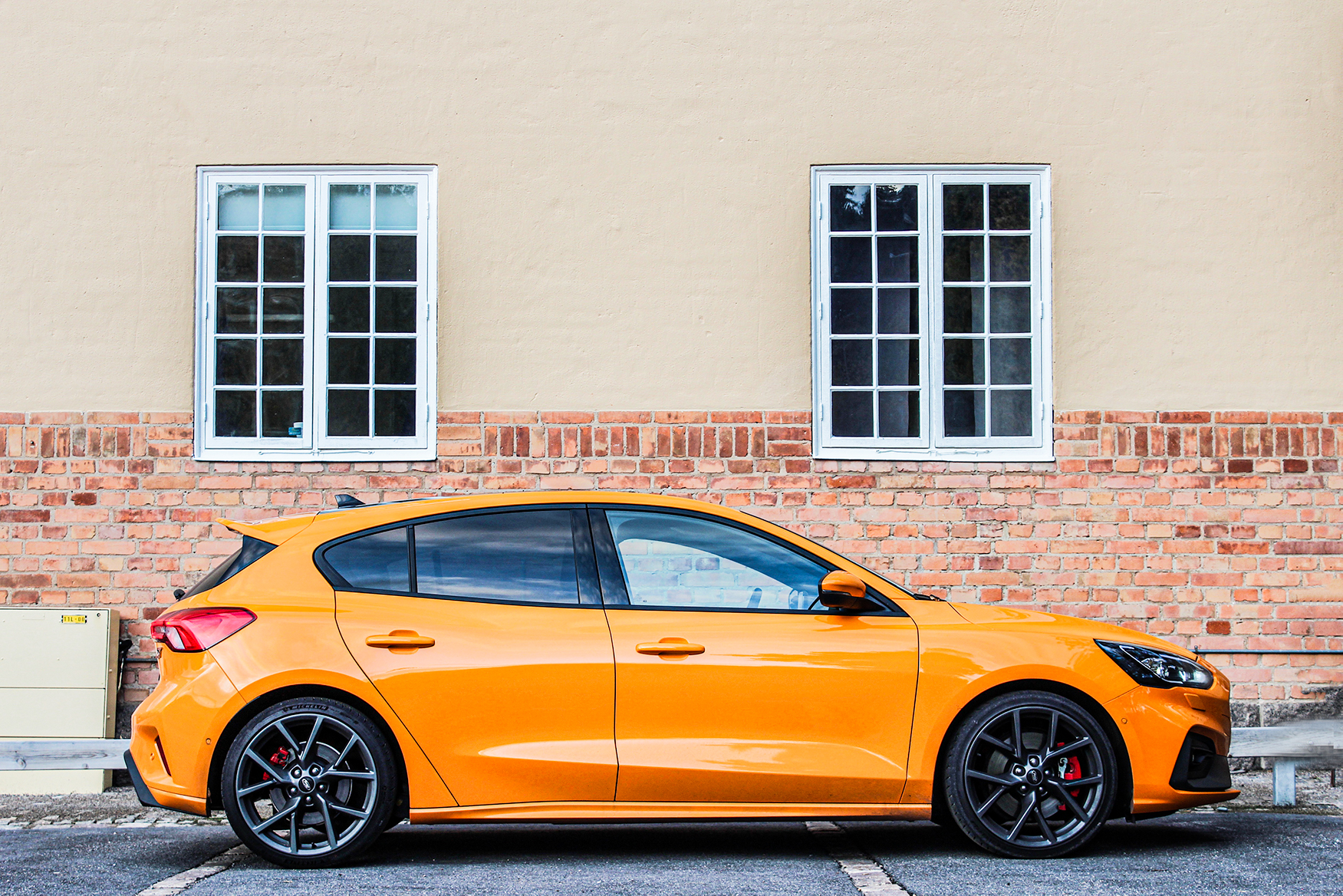 En ST-behandlad Focus har som väntat en del exteriöra detaljer som avslöjar att man kör runt i något med lite mer krut under huven. Det mest uppenbara är bokstäverna ST i grillen och på bagageluckan. Den har även en liten vinge bak, en större grill och kolossala bromsok för att förhöja den sportiga känslan. Ja, sen var det ju det här med att just vår testbil hade den reflexväst-orangea kulören som knappast hjälper till att hålla en låg profil. Att nya Focus är en mycket mer estetiskt tillfredställande skapelse än den gamla är ingen hemlighet och Focus ST bjuder utan tvekan på den mest aggressiva, sportiga looken hittills.