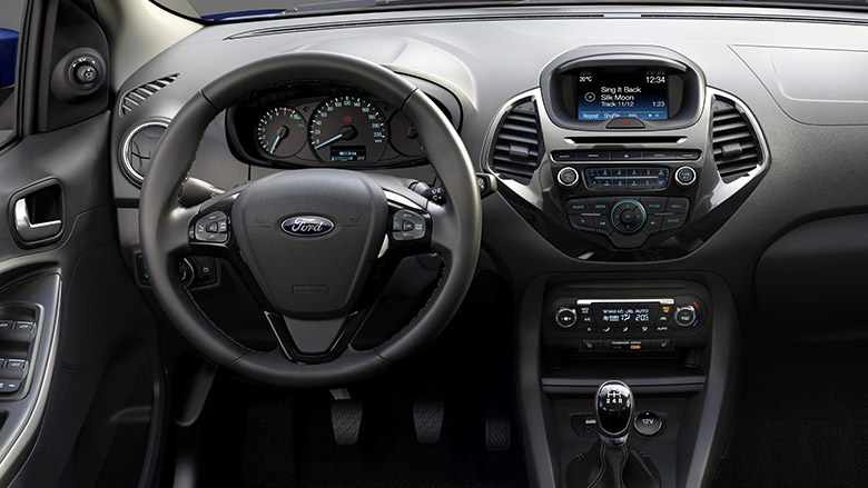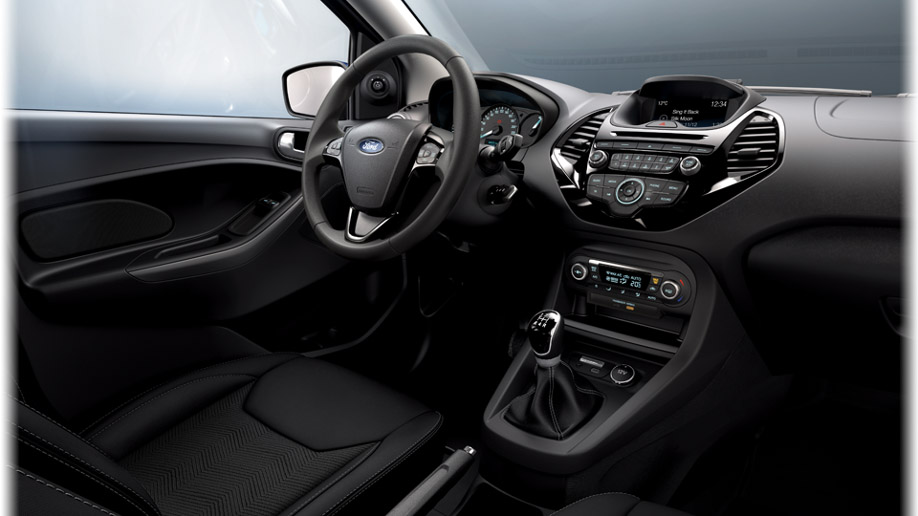 Interiören är likt exteriören spartanskt utformad. Det finns färre tekniska nyheter i KA+ interiör än det gör i fritidsrummet på ett ålderdomshem. Möjligheten att koppla telefonen via bluetooth är den modernaste funktionen tillsammans med ett USB-uttag för att ladda mobilen. Dock får man ha i åtanke att bilen har ett grundpris på under 100 000 kronor, något som gör att interiören motiveras av prislappen.