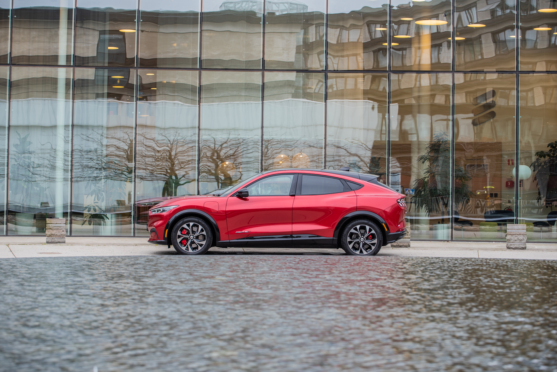 Utseendet är helt klart Mustang-inspirerat – lyktorna både fram och bak, fronten, och bilens linjer är alla hämtade från originalet. Det finns dessutom inte ett enda Ford-emblem på bilen förutom i vindrutan. Ford har inte försökt att vara övertydliga med att det rör sig om en elbil. Istället för traditionella handtag finner man knappar som öppnar dörren – de är responsiva och enligt Ford fungerar de även i tiotals minusgrader. Interiören domineras av den enorma skärmen à la Tesla som enligt Ford är bättre på alla sätt och vis. Alla basfunktioner som sätesvärme och liknande finns alltid nära till hands längst ner på skärmen. I övrigt är det en fråga om att vänja sig men systemet är inte överdrivet intuitivt; man blir lätt överväldigad av alla valmöjligheter.