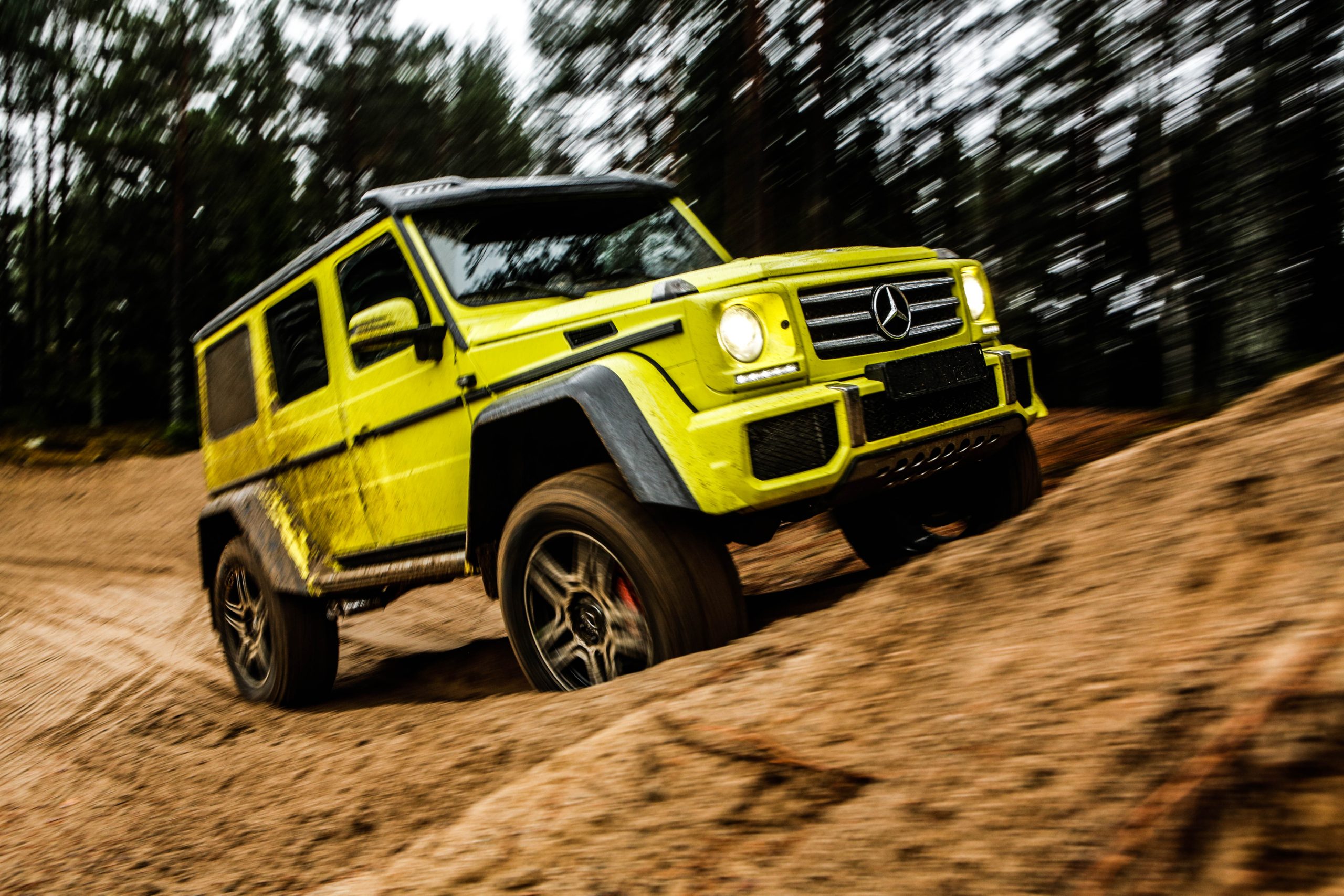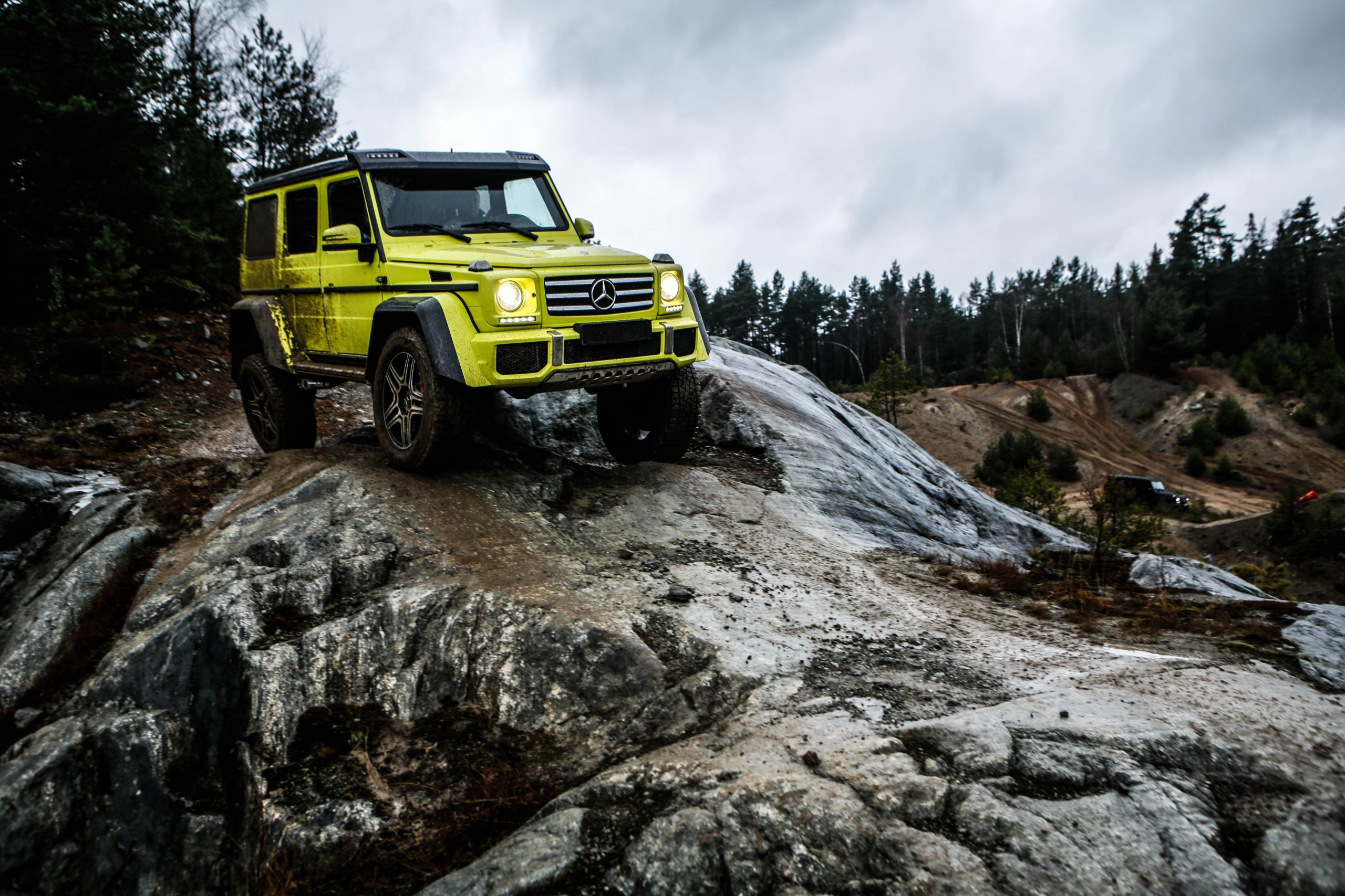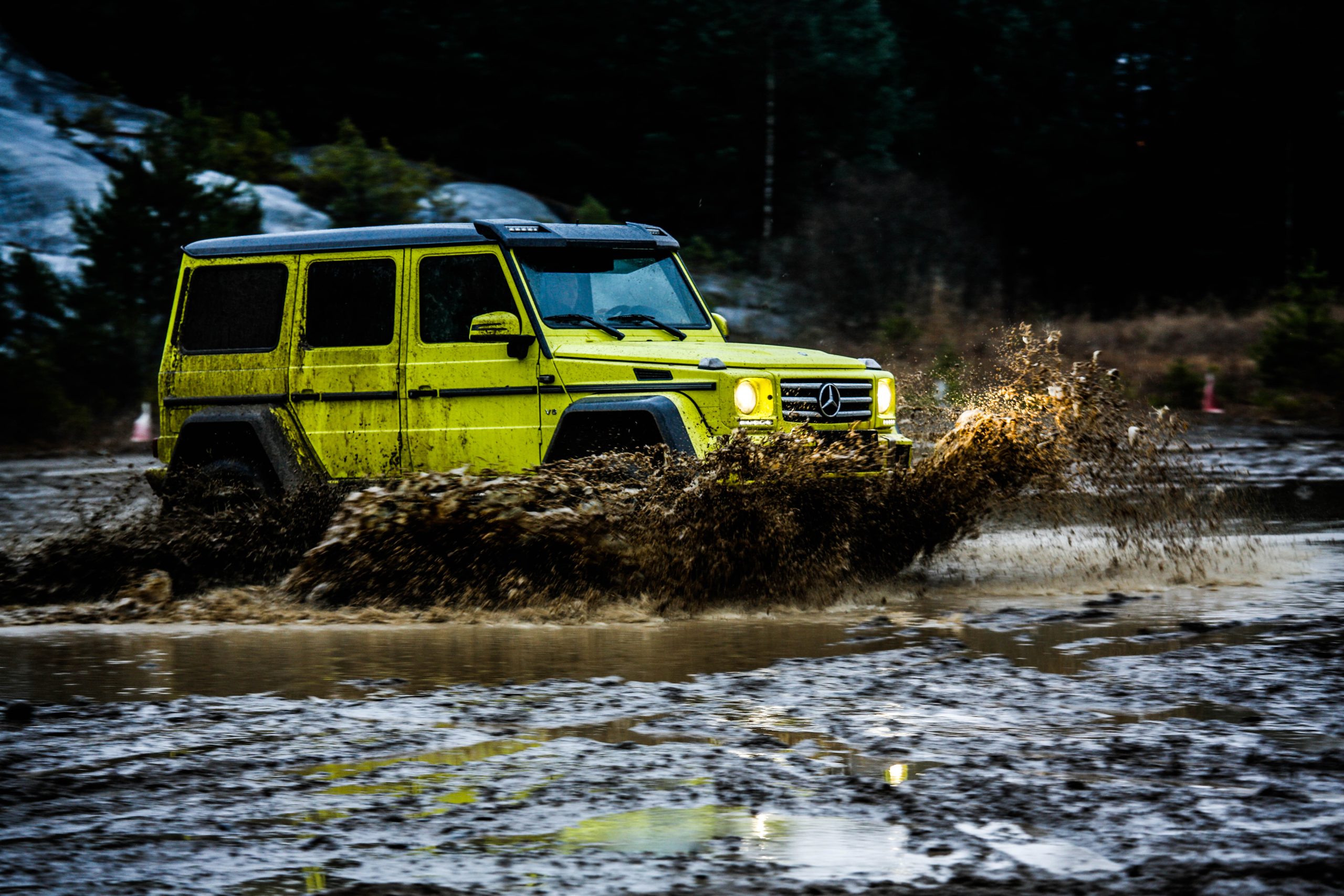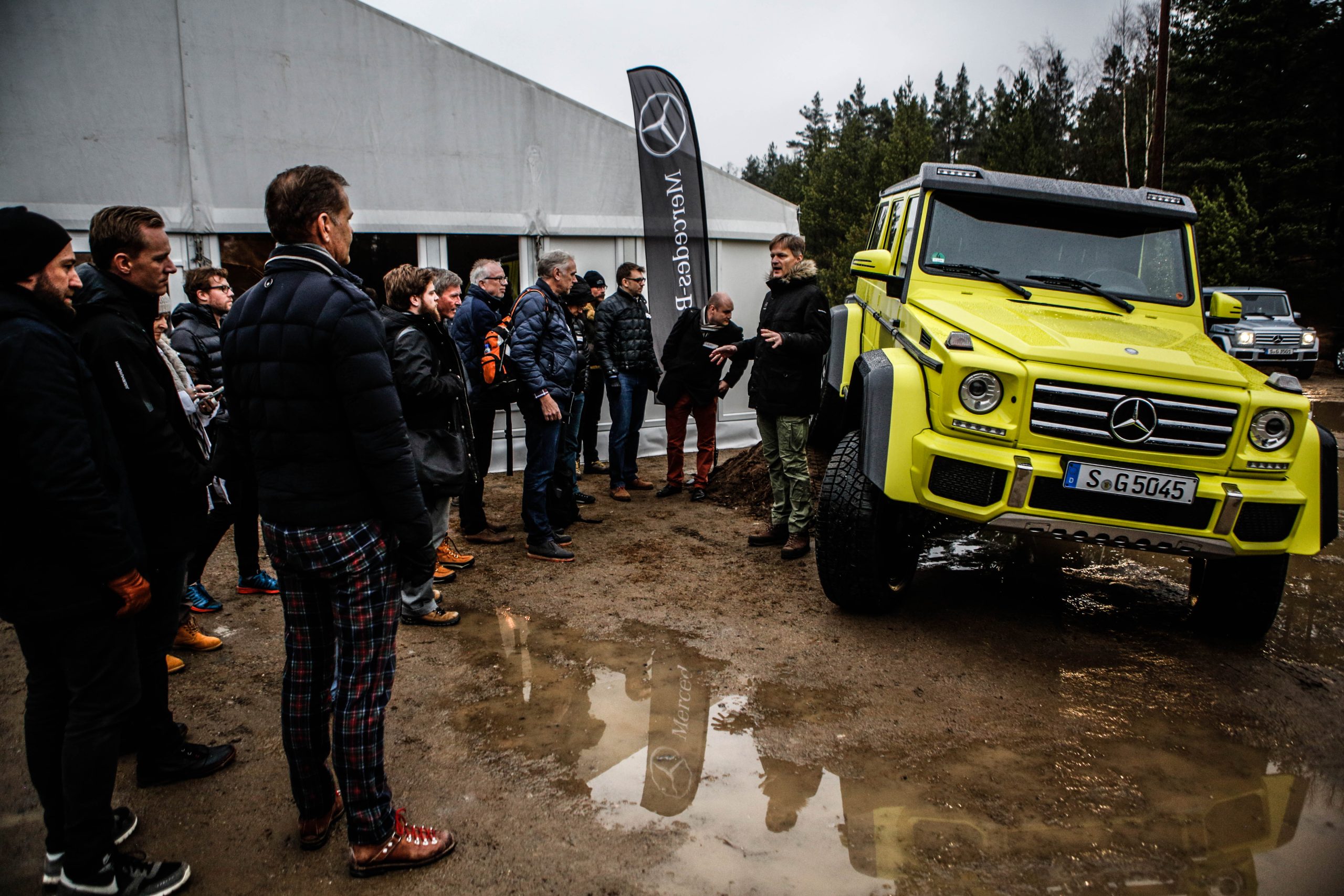 Dagen började med en presentation innehållandes både en powerpoint samt ett föredrag om de olika versionerna som erbjuds. En av dessa är Mercedes-Benz G500 4×4^2 som alltså uttalas “G500 ‘four-by-four squared'” och inte “G500 ‘fyra gånger fyra kvadrat'” som vissa svenskar verkar tro. I vilket fall som helst är det inte bilvärldens mest koncisa namn men å andra sidan är det oerhört verklighetstroget. Fredrik Wahrolén, PR- och kommunikationschef på Mercedes-Benz Sverige, hänvisade under dagens gång till bilen som “den gula faran” vilket inte är så svårt att lista ut anledningen till. En gul färg som enligt vissa källor kostar ögonsvidande 20 000 Euro. Aningen ironiskt på en bil som bokstavligt talat kan agera berg- och dalbana.