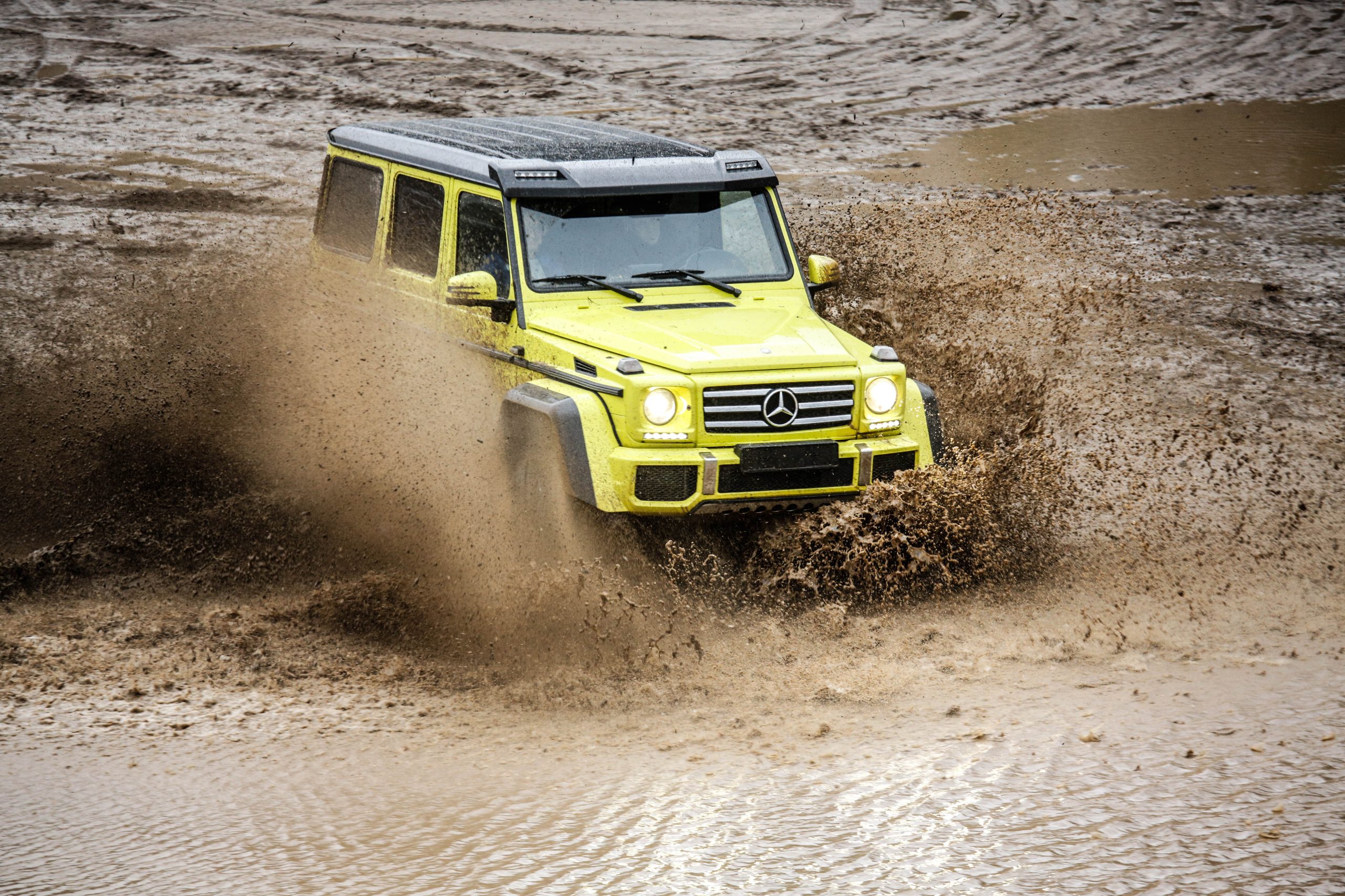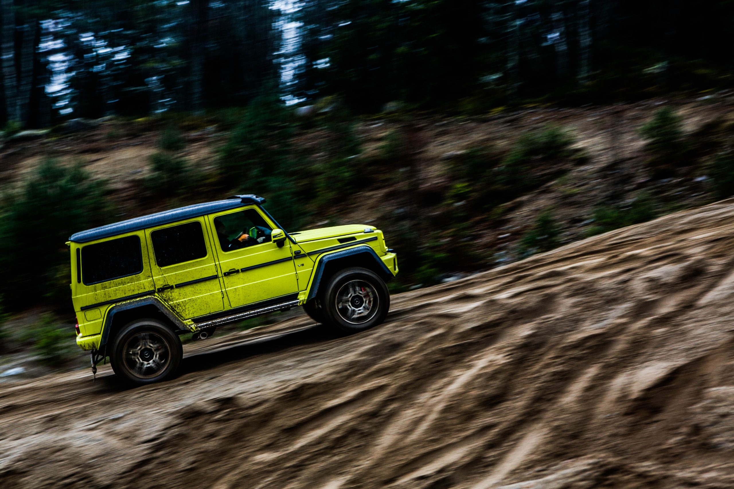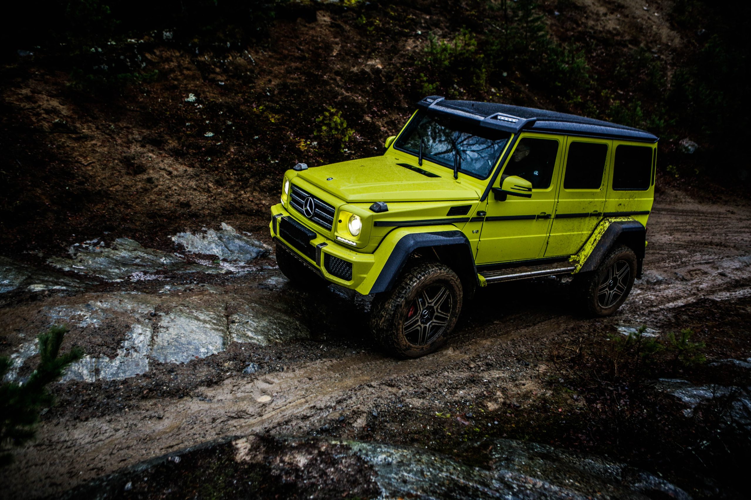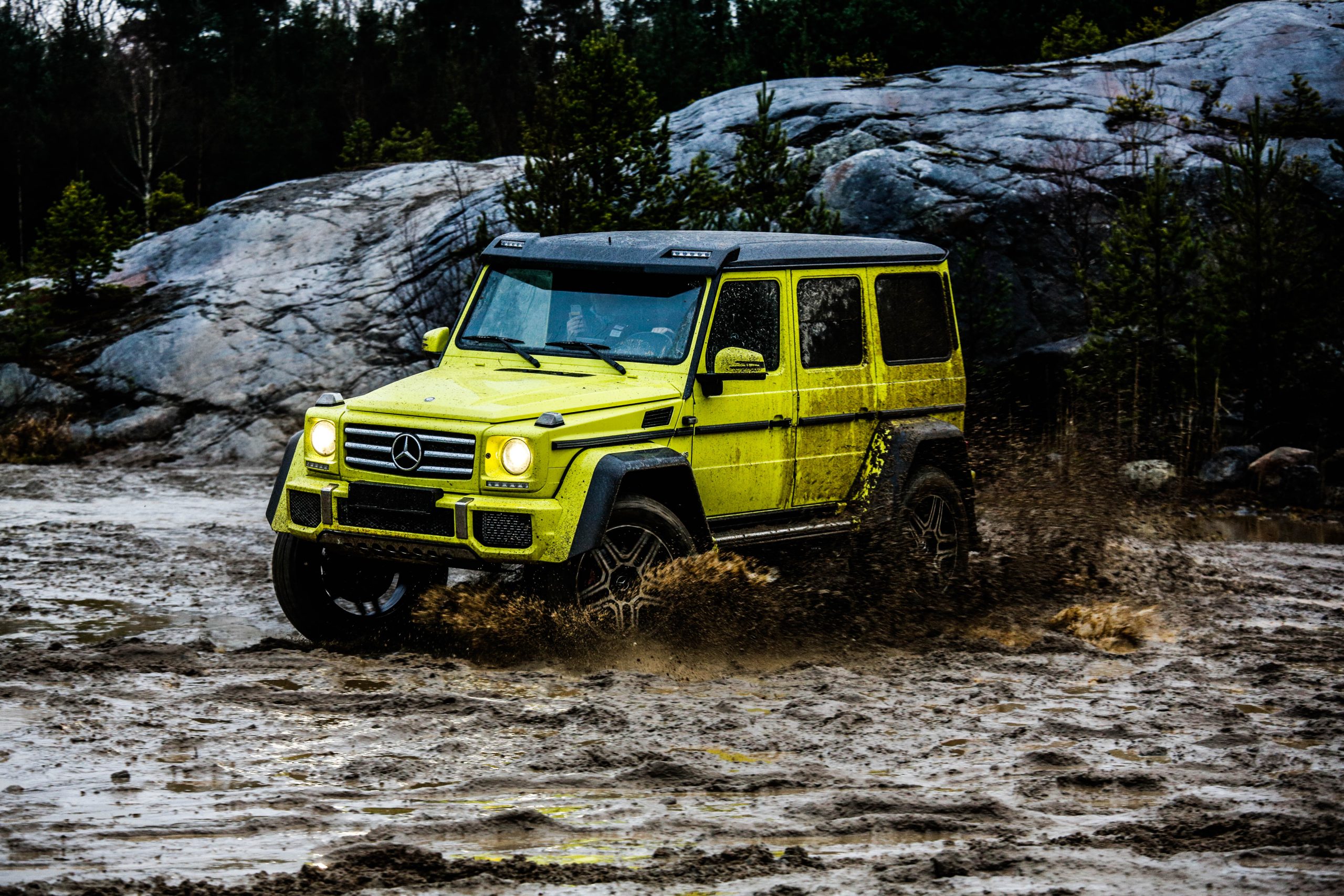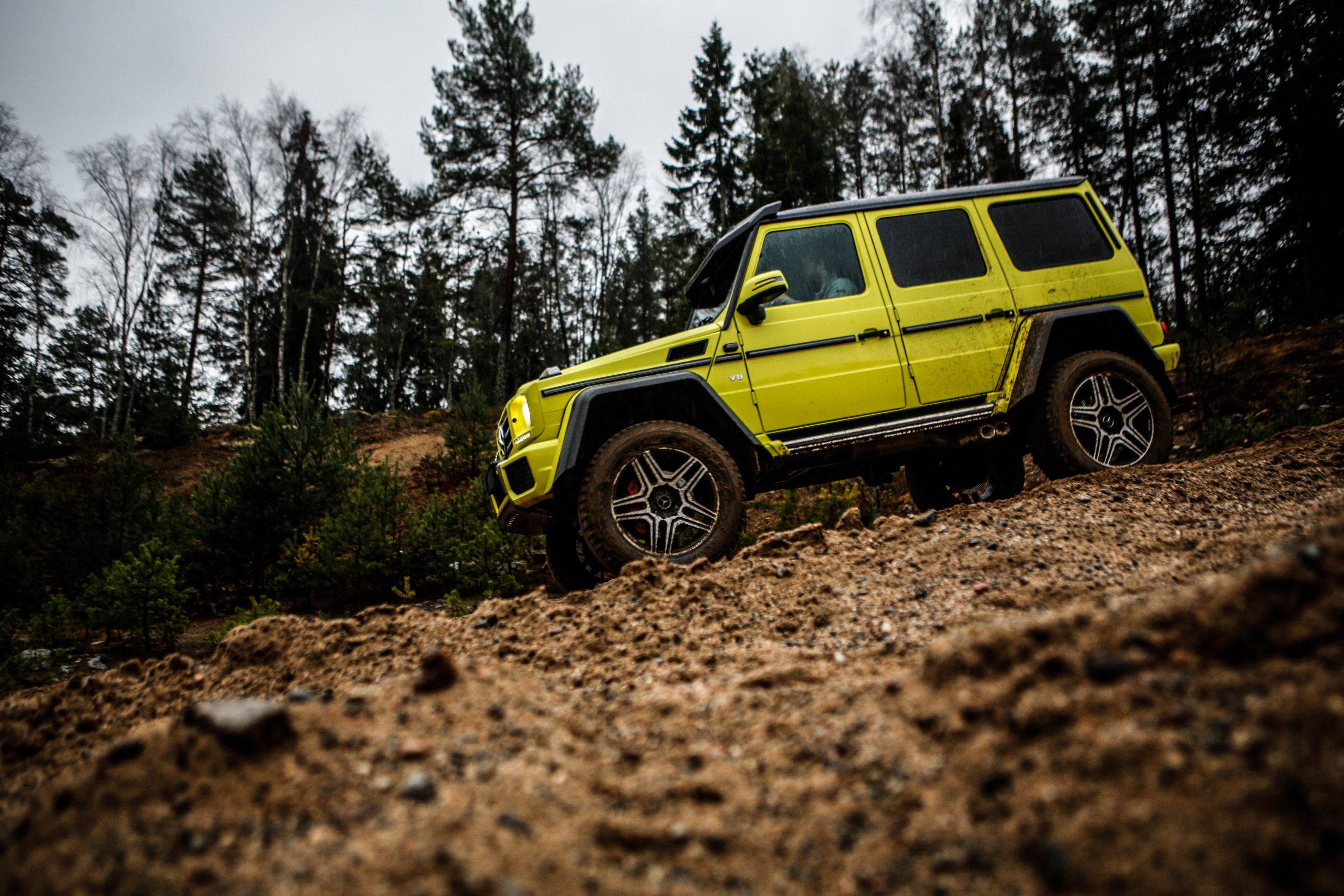 Dagen började med en presentation innehållandes både en powerpoint samt ett föredrag om de olika versionerna som erbjuds. En av dessa är Mercedes-Benz G500 4×4^2 som alltså uttalas “G500 ‘four-by-four squared'” och inte “G500 ‘fyra gånger fyra kvadrat'” som vissa svenskar verkar tro. I vilket fall som helst är det inte bilvärldens mest koncisa namn men å andra sidan är det oerhört verklighetstroget. Fredrik Wahrolén, PR- och kommunikationschef på Mercedes-Benz Sverige, hänvisade under dagens gång till bilen som “den gula faran” vilket inte är så svårt att lista ut anledningen till. En gul färg som enligt vissa källor kostar ögonsvidande 20 000 Euro. Aningen ironiskt på en bil som bokstavligt talat kan agera berg- och dalbana.