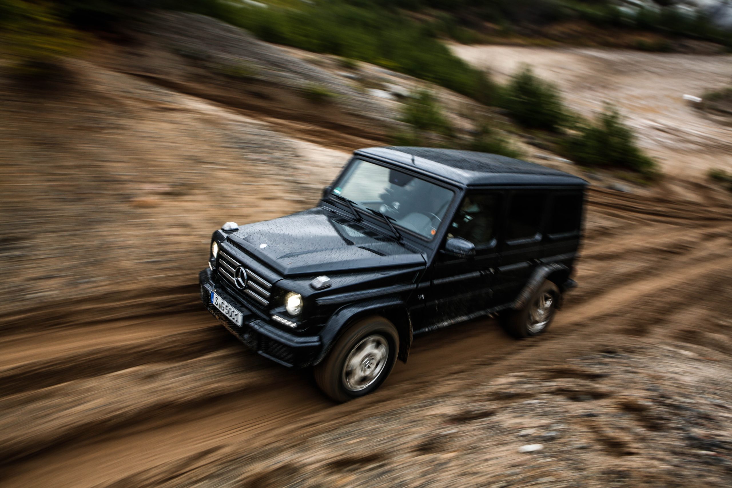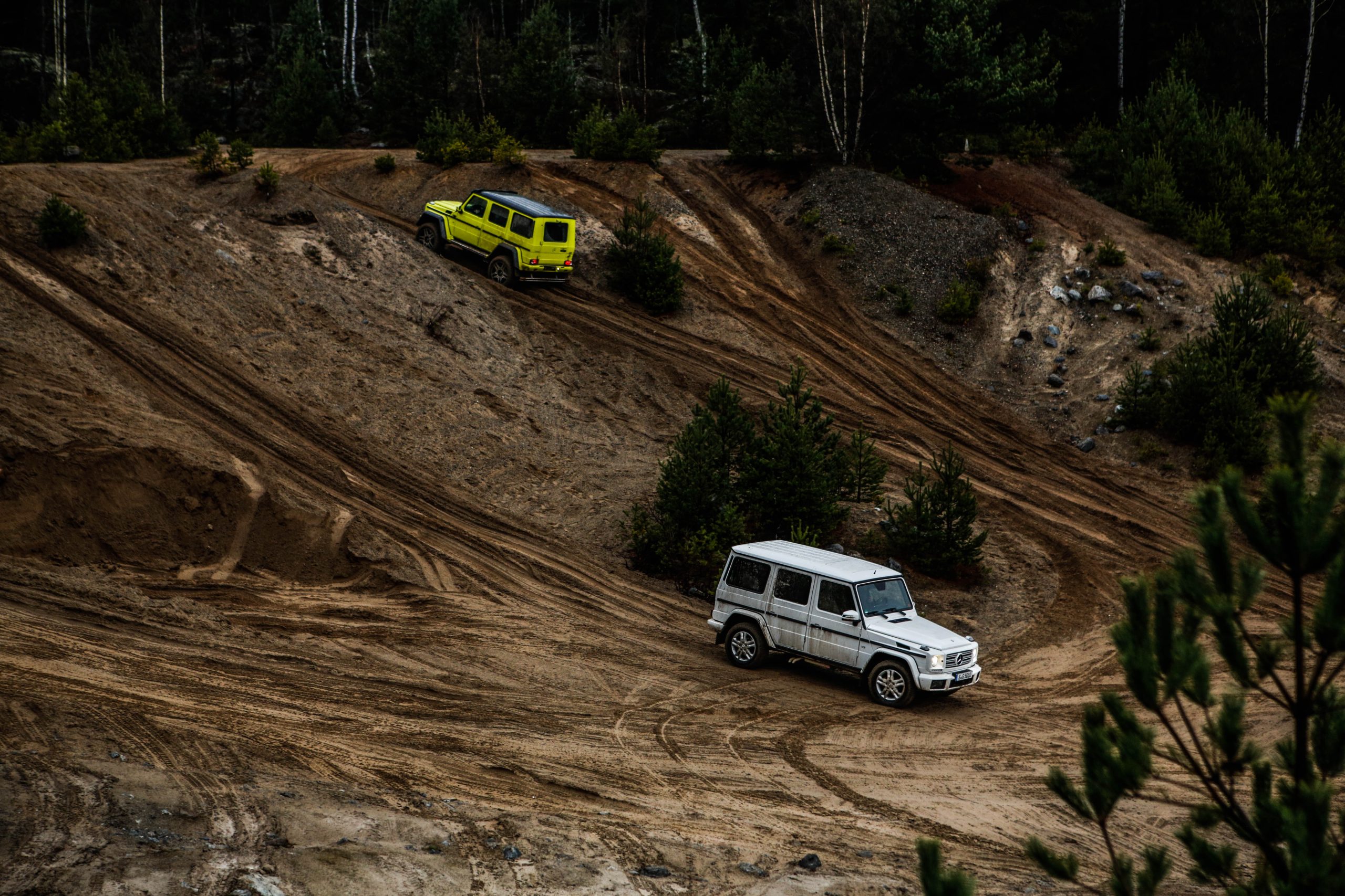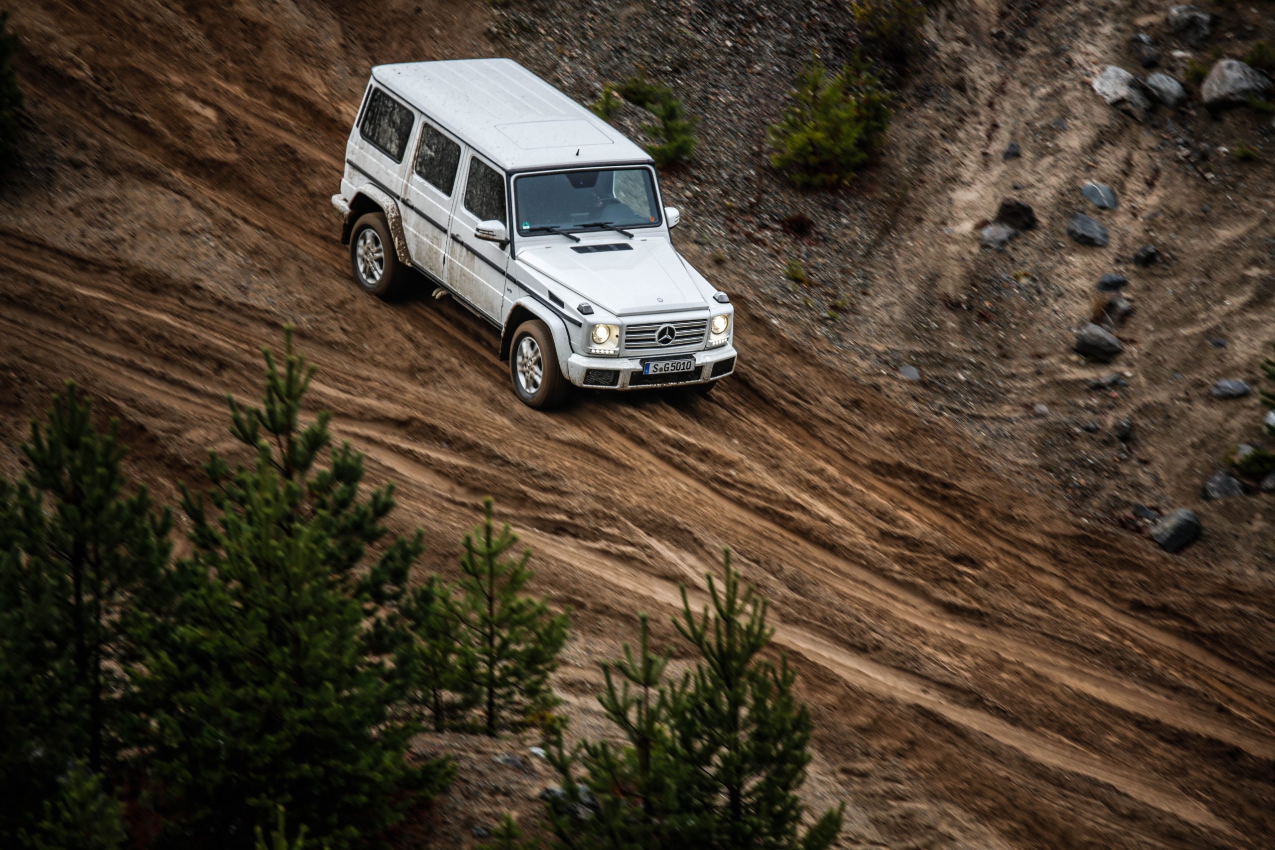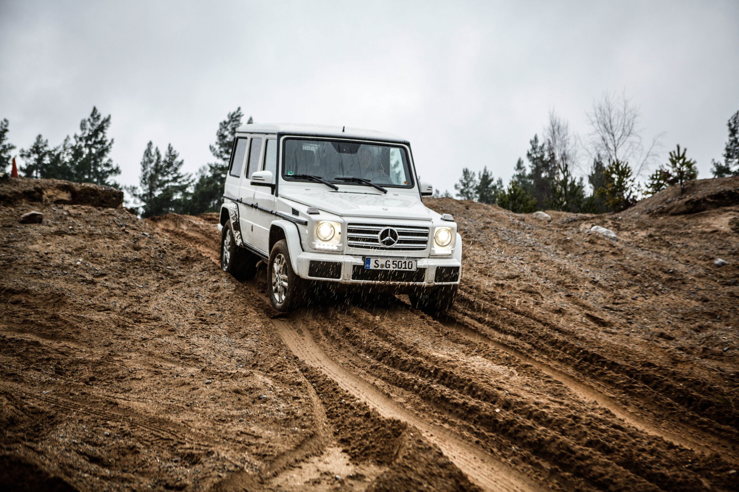 Den första bilen som vi fick köra var Mercedes-Benz G500 som med en 4.0-liters V8:a på 422 hästkrafter och 610 newtonmeter har mer än nog med prestanda för att bestiga både det ena och det andra. G-Klassen är en av ytterst få bilar som man kan få med en lågväxel och den enda i produktion med tre stycken låsbara differentialer; för gemene man handlar det om hur kraften fördelas för att optimera terrängkörning mer eller mindre. Det är första gången vi kör en G-Klass men som sagt inte första gången på Terrängcamp Ekeby där vi även kört Volkswagen Touareg och Porsche Cayenne. Att köra en G-Klass tillhör de absolut häftigaste man kan göra. Vi tyckte att Touaregen var extremt kapabel men en G-Klass får en Touareg att framstå som en gympalektion bredvid VM-finalen i fotboll. Sikten ut över den maffiga huven, kopplat med mullret från V8:an var en sensationell upplevelse. Att bilen lyckades bestiga branta och höga sandberg utan ett enda om och men var sannerligen bevis på dess militära anknytning. Den lyckades med saker som anses helt orimliga för en bil och gjorde det med en sådan extrem lätthet att man tvingades montera fast hakan efter varje tur.
