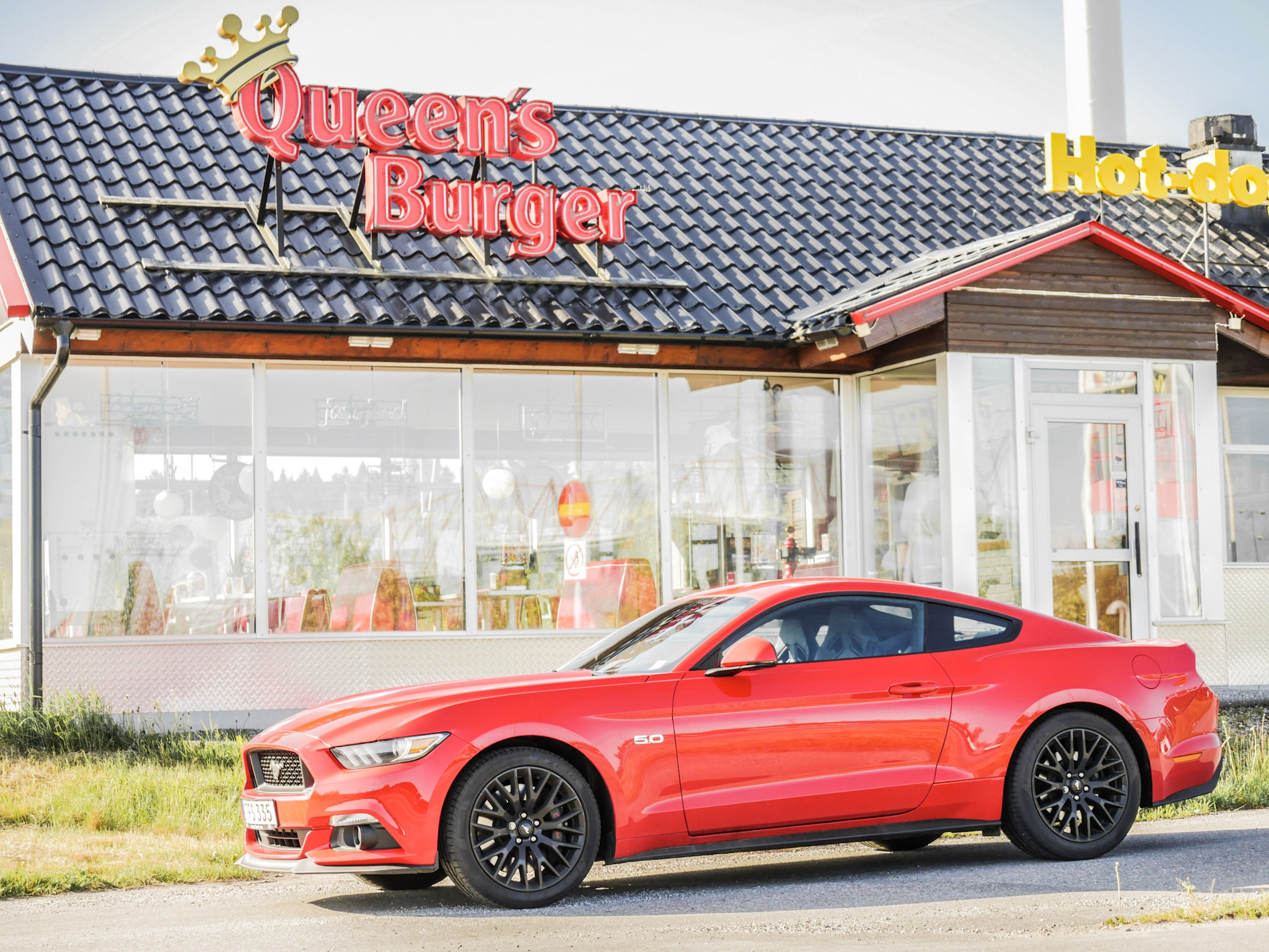 Efter att ha kastat runt bilen och insett att forna tiders amerikanska vattensängsfjädring och traktorväxellådor är försvunna körde vi in vid Queens Burger. Queens är en klassisk amerikansk diner som serverar det mesta i friterad form. Dinern som fenomen är en relik från 50/60-talet som uppkom i samband med att bilen frigjorde människor och lät dem utforska land och rike. Queens Burger hämtar mycket av sin inspiration från 60-talet på precis samma sätt som Ford Mustang.