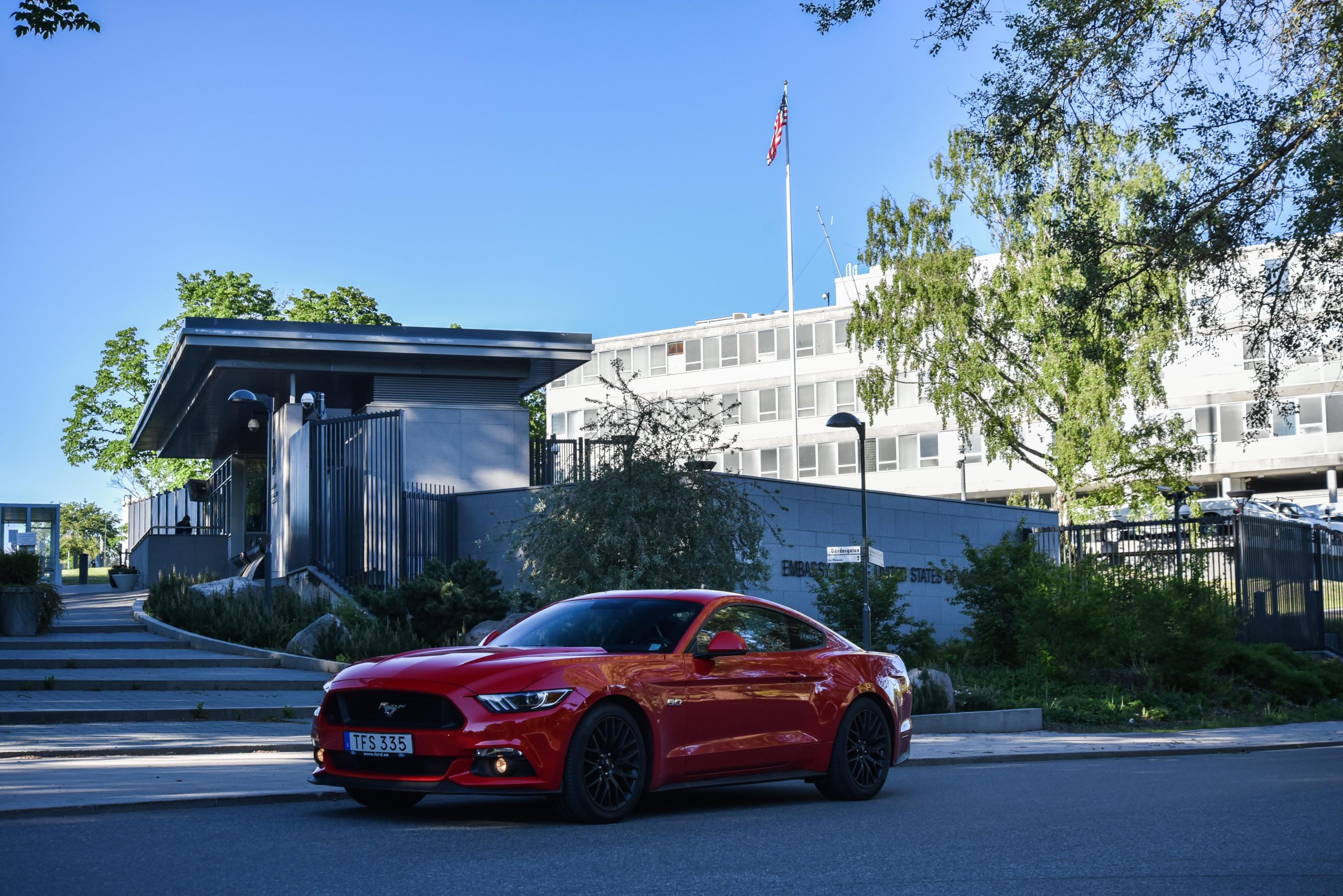 Resan startade vid den juridiskt mest korrekta platsen när det kommer till att upptäcka USA i Sverige, nämligen den amerikanska ambassaden. Tekniskt sett är detta amerikansk mark och det kändes som en ypperlig plats att starta på. Efter att ha kört fram till ambassaden och prompt blivit tillsagda att vi förmodligen borde avlägsna oss, blev vår vistelse kortare än stubinen på John McEnroe. Mot all förmodan var det ingen ypperlig miljö för Mustangen då de trånga utrymmena inte underlättade en helomvändning med ekipaget. Bilen har cirka 18 meter motorhuv vilket gör tighta manövrar till något av en utmaning.