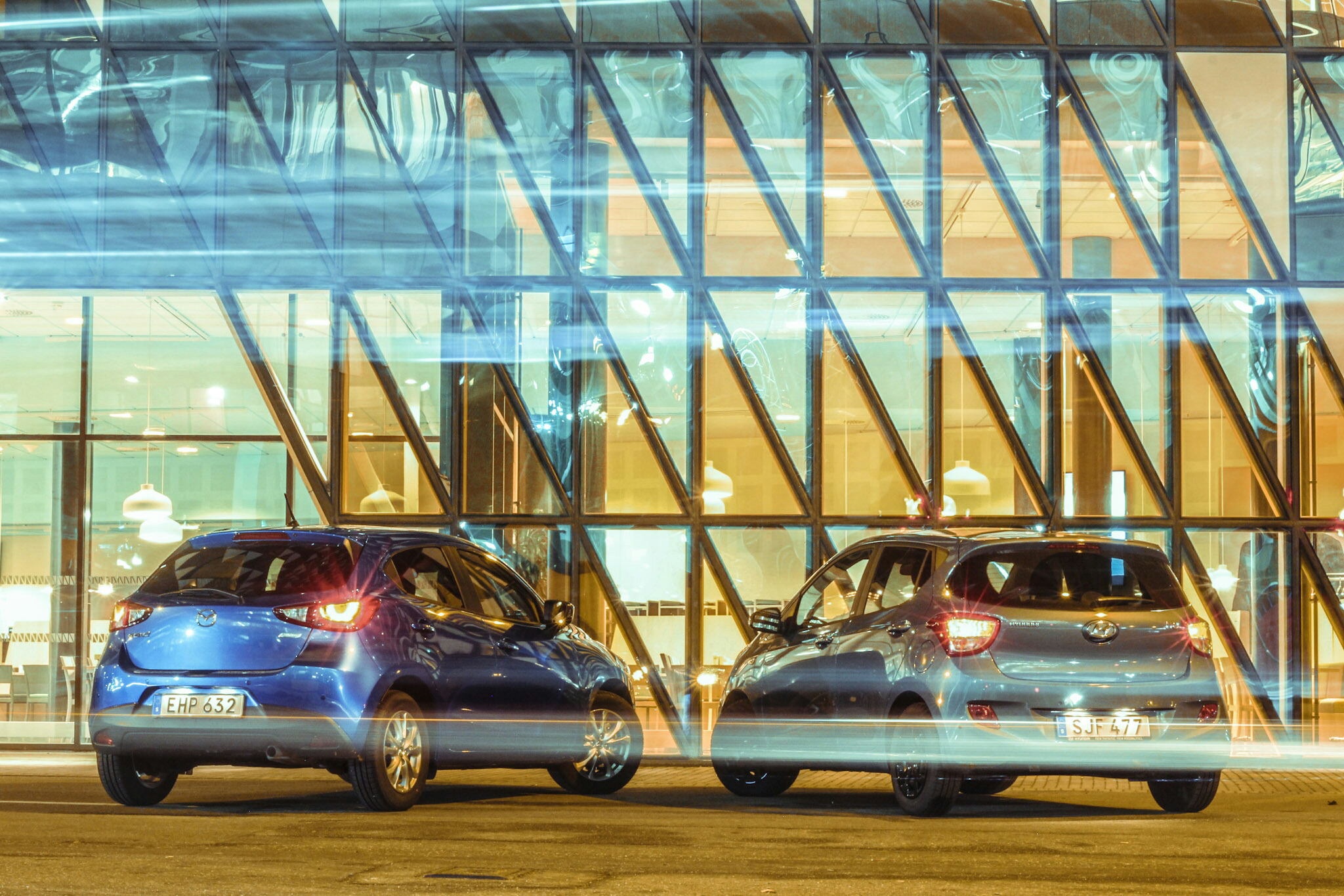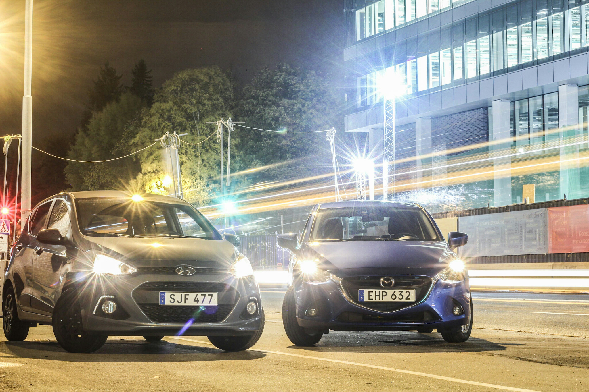 Under vår vecka med Hyundai i10 lånade vi även en Mazda2 vilket innebär att vi hade lite av en japansk duell att ta itu med. Börjar man på utseendefronten hör båda bilarna tveklöst hemma på ett museum lika mycket som en kebabrulle gör på en vegetarisk matlagningskurs. Att välja en bil som ser bättre ut än den andra är lite som att välja mellan två hundvalpar, det handlar om vilken hjärtat slår lite extra för. I mitt fall är det Mazda2 vars utseende tilltalar mig mer men det som allmänheten unisont verkar tycka är att båda bilarna är ”söta”.