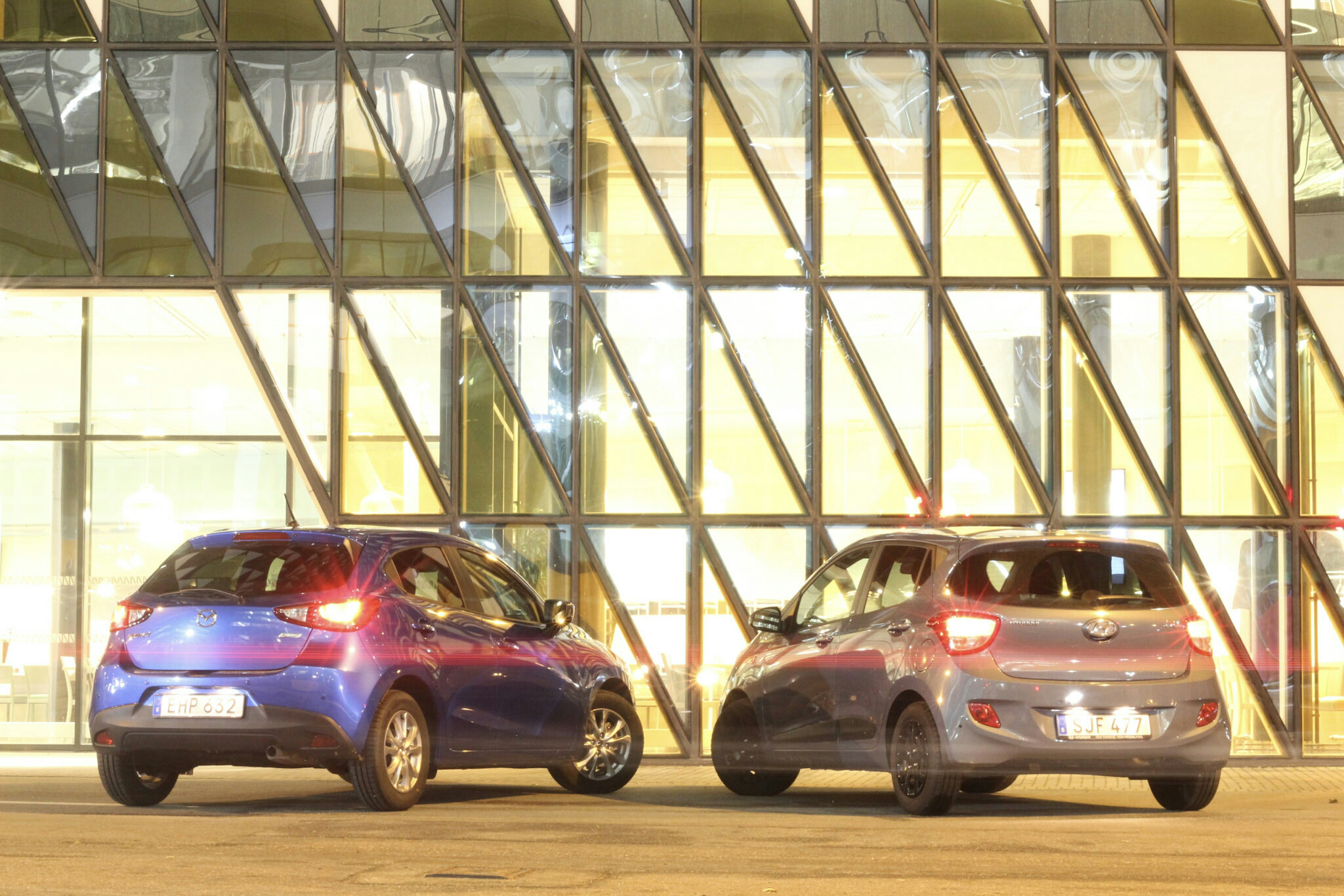 Det är betydligt intressantare på interiörsfronten. Mazdan är mer högteknologisk med ett infotainmentsystem som är någorlunda responsivt och intuitivt. Allt känns högkvalitativt och man sitter behagligt. Hyundaien har samma infotainmentsystem som man finner i en hyrbil från 90-talet – det vill säga en liten skärm på en halv tum där man kan byta radiokanal – otroligt enkelt men inte särskilt modernt. Tanken med en stadsbil är dock att man rimligtvis ska se ut ur den när man kämpar sig genom trafiken och med den logiken är i10 mer av ett växthus medan Mazdan känns betydligt mer klaustrofobisk. Trots det sitter man bättre i Mazdan rent ergonomiskt.