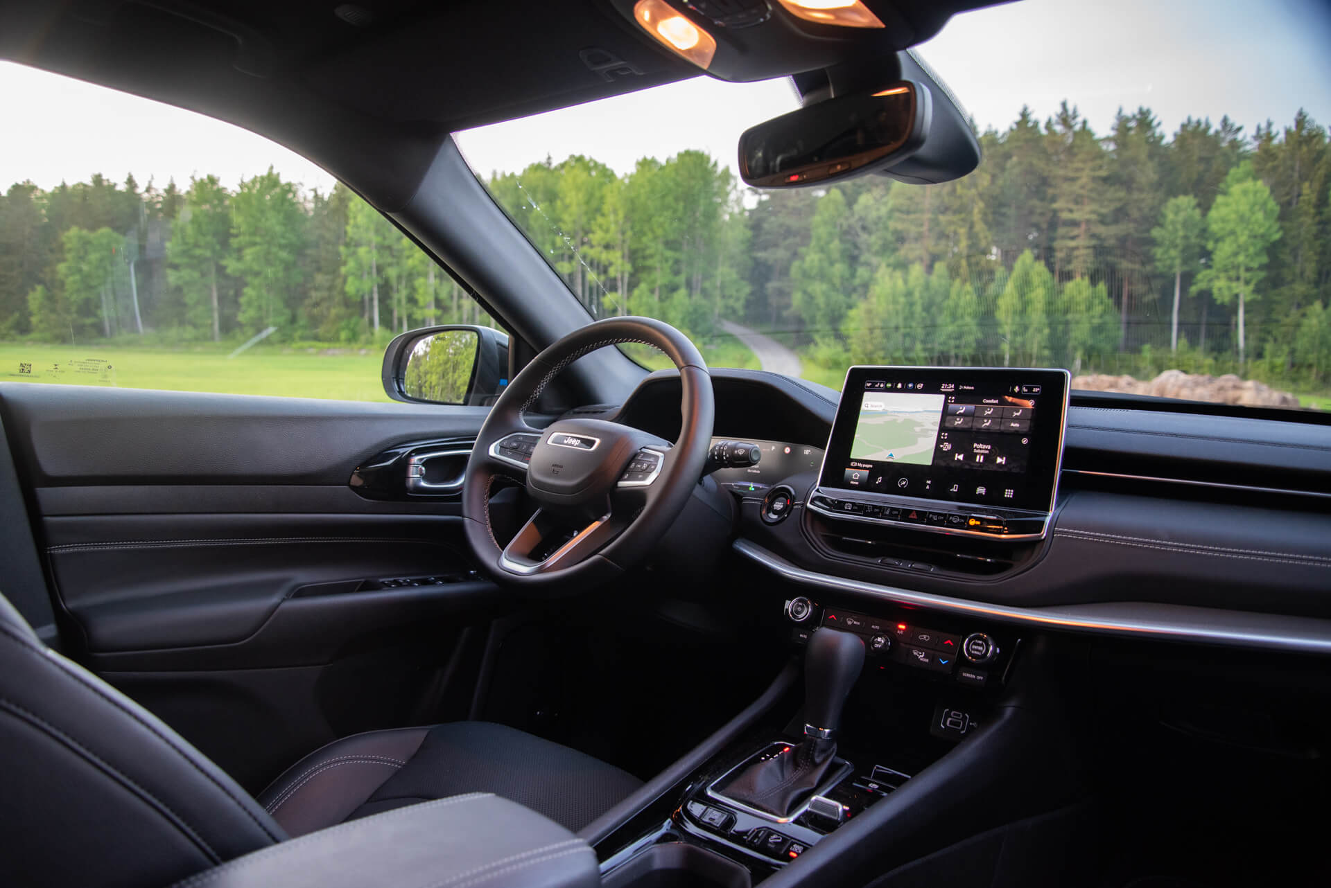 Något som å andra sidan rimmar väl med dagens trender är det faktum att hela Jeeps modellutbud består av SUV:ar. En elektrifierad SUV är således något som borde sälja som D-vitamin i december. Den Jeep Compass 4xe vi testade var pepprad med detaljer i blått men bortsett från det och laddluckan är det inget som avslöjar bilens elektrifierade anda. Utseendemässigt har Jeep lyckats väl och bilen osar ändå en kompetens och tuffhet som Jeep-fantaster kan uppskatta. På insidan möts man av en helt ny instrument- och dörrpanel och en ny 10,25-tumsskärm med ett uppdaterat infotainmentsystem.