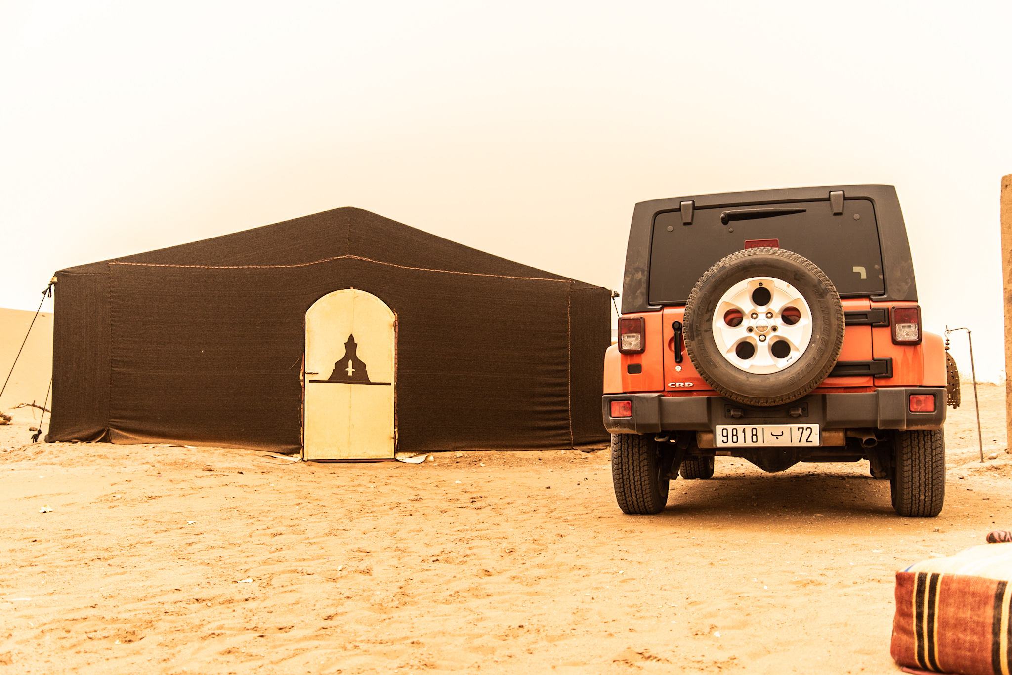 Efter drygt tre timmar anlände vi till det tältläger vi skulle bo på. Det var alltså stora tält med ordentliga sängar. Tälten saknade dock luftkonditionering men var fyllda med enorma kryp och annat äckligt som finns i Sahara. Ironiskt nog hade vi just en Jeep Wrangler Sahara och på Jeep-språk betyder Sahara ”lyx” men jag kan intyga efter att ha sovit där att det är så långt ifrån lyx man kan komma. Ett bättre namn hade varit Jeep Wrangler Vandrarhem i sådana fall, men det hade nog inte klingat lika väl.