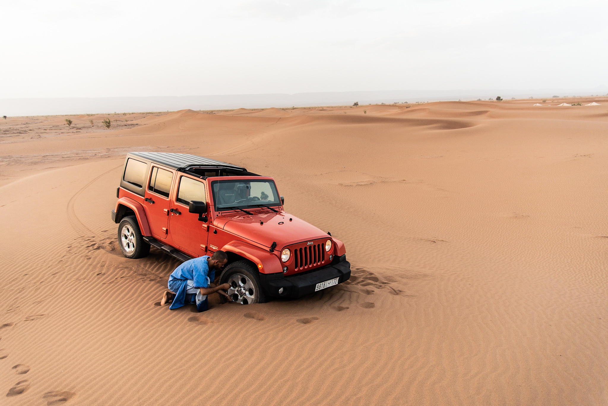 Efter att ha kokts levande på en kamelrygg åkte vi Toyota tillbaka till lägret, tog vårt pick och pack och avbröt vistelsen efter en natt. Det fick räcka. Jeep Wrangler var helt enkelt tuffare än oss. Färden tillbaka till M’Hamid gick snabbt och smidigt och jag valde att ta ut svängarna lite för att se vad bilen verkligen klarar av. Det fanns ingenting i Sahara som kunde sätta stopp för Wrangler, med undantag av de mest extrema sanddynerna. Vi hade för mycket luft i däcken för att stanna uppe på sanden istället för att köra fast.