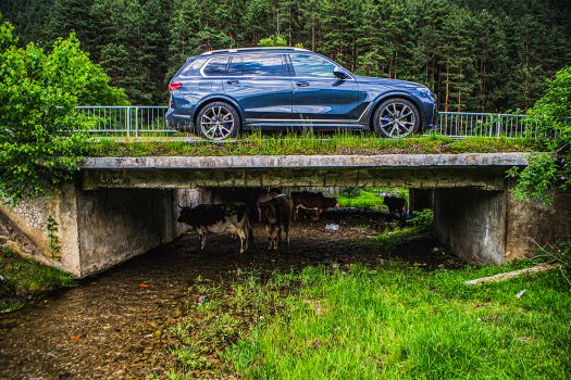 Precis som 7-serie trivs X7 på såväl motorväg som kurviga landsvägar, men av förklarliga skäl gör den sig inte riktigt lika väl som limousinen när omständigheterna är smickrande. I stället är det på ovan nämnda schweizerostvägar detta nya åbäke visar vart skåpet ska stå. Eftersom man på en resa genom Rumänien hinner se en hel del saker man inte nödvändigtvis väntar sig av ett EU-land, var sociala förhållanden ett tema för samtalet i bilen. Det fick mig att tänka att X7 är lite som ett grindsamhälle på hjul. Jag har sällan känt mig så skyddad i en bil som jag gjorde i denna stadsjeep, som bara lämnar samvetet blottat för omvärlden, vilken i Rumänien är tämligen fylld av dystra ekipage med en fjärdedel så många hästkrafter som ben.