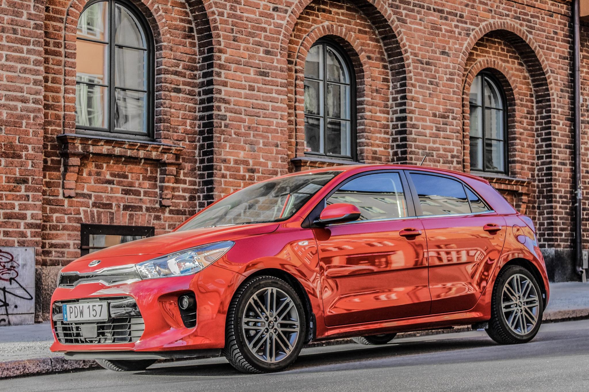Mitt första intryck av Kia Rio är fullkomligt briljant. Bilen är lika vacker som en solnedgång över en söderhavsö. Jag kom på mig själv med att alltid vända mig om och beundra den efter jag hade parkerat. Fronten ser sportig och lite elak ut, medan de otroligt smakfulla och eleganta fälgarna får Rio att se avsevärt mycket dyrare ut än den är. Även interiören är en stilfull fullträff bortsett från vissa plaster vilka är lika hårda som diamant men utan den exklusiva känslan som pressat kol medför. Infotainmentsystemet är föredömligt lättanvänt, precis som färddatorn.