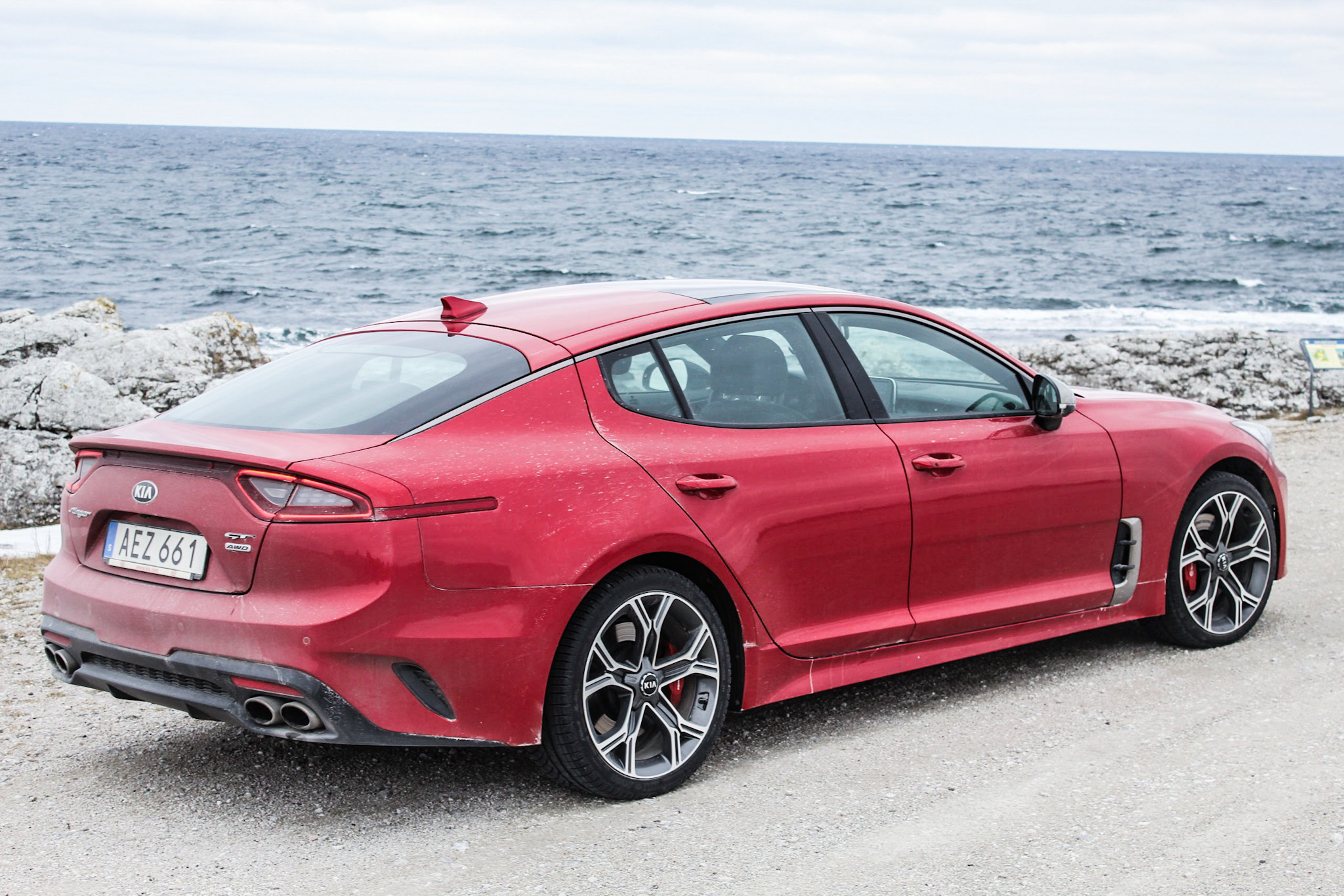 I högre hastigheter upplevs Stinger som fantastiskt stabil, men bromsarna på testbilen var allt annat än förtroendeingivande. De krävde att man trampade bestämt på pedalen och var allmänt stumma. Det är dock möjligt att de var utslitna efter hårt testande av tidigare journalister. Komfortmässigt är Stinger lite för hård. Den ska trots allt vara en GT, en grand tourer, och då hade jag önskat en lite mjukare inställd fjädring. Istället hamnar den i något slags limbo mellan sportbil och autobahn-lok.