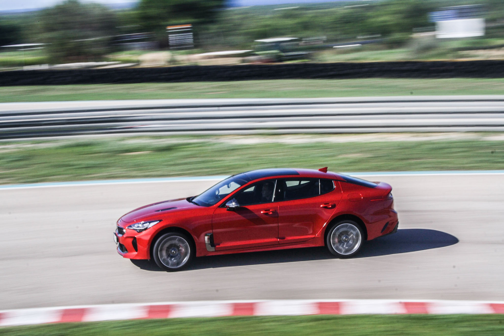 Kia är noga med att påpeka att det här är en GT-vagn, inte en sportbil. Rätt har de allt. Bilen var alldeles för tung och mjukt inställd för att leverera något riktigt adrenalinpåslag när vi dundrade runt Circuito Mallorca-banan. På den svenska marknaden kommer det dessutom bara att säljas fyrhjulsdrivna bilar (internationellt finns bakhjulsdrift som alternativ). Systemet är bakhjulsorienterat, men du lär inte klå någon raggare när det kommer till parningsdans på din lokala Biltema-parkering. Spiken i kistan blir avsaknaden av ett mustigt avgasljud.