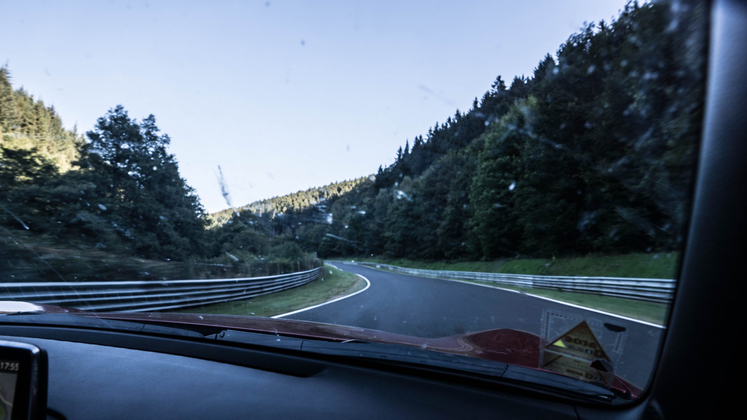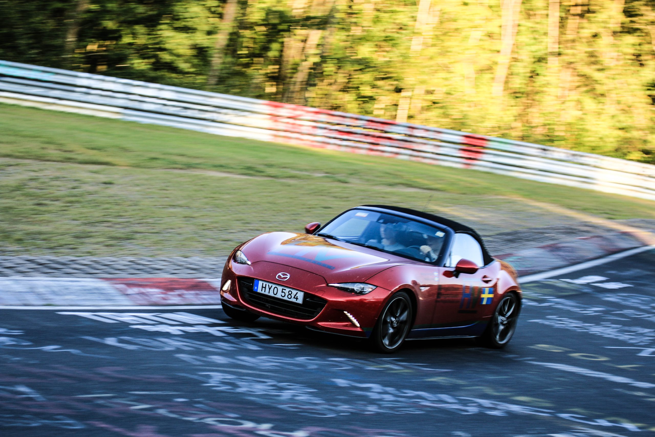 När jag frågade Mazda om det skulle gå bra att köra på Nürburgring var det halvt på skämt men när Mazda sa ja (och sedan tecknade en extra försäkring) trillade jag av stolen. Min första (och garanterat inte sista) färd på den berömda Ringen, där många offer har skördats, skulle vara i en Mazda MX-5; i min värld en oerhört lämplig bil för ändamålet. Dels är den för långsam för att man ska köra ihjäl sig själv och dels är den bakhjulsdriven och lika flyhänt som en fjäder. Precis som alla individer med oktan i blodet har jag sett tusentals klipp från Nürburgring. Allt ifrån när en Aventador SV eller en Porsche 918 kör på under 7 minuter till klipp av människor som krockar. Dessvärre har jag sett fler klipp av folk som krockar, på just Touristenfahrt (som vi alltså skulle åka) än av folk som kör som gudar. Marginalerna är asfalt, sen någon meter gräsplätt och sedan en sargad sarg. Efter att ha köpt nio stycken varv för 220 euro som man får på ett kort som man sedan drar när man kör in på banan var jag taggad till skyarna, men även rädd som få. Man kör rakt in på slutet av den långa rakan och efter att man undvikit lite koner är det bara att trycka gasen i botten. Det första jag märkte var att asfalten var bredare än vad man tror men att man med en 160-hästars Miata kommer rätt långt eftersom den är såpass lättkörd i kurvorna. Jag kom genast ikapp en Ford Fiesta ST som jag körde om men hade såklart ögonen klistrade i backspegeln. Man vill knappast ligga i vägen när en av många supermodifierade Porsche 911:or eller BMW M3:or kommer som skållade troll bakifrån. Nürburgring räknas som en motorväg så man ska hålla höger när någon kommer ikapp en. Givetvis hände det väldigt ofta och ibland höll man på att blåsa av vägen. Med inställningen att kolla läget det första varvet (något jag fick lära mig av en svensk Ringräv som vi pratade med strax innan vi gav oss ut på banan) körde jag förhållandevis lugnt. En oljefläck som resulterade i att bilen överstyrde bevisade att Ringräven inte var ute och cyklade. Det gjorde mig betydligt mer försiktig men när jag väl kört ett varv var det raka spåret ut igen för att köra gasen i botten. Det hela slutade med en varvtid på några hundradelar över 10 minuter vilket är en snittfart på 126 kilometer i timmen – otroligt imponerande för en Miata om jag får säga det själv. Efter att vi hade kört på Nürburgring var det Flensburg vid Tysk-Danska-gränsen som var nästa anhalt, en mindre spännande sträcka.