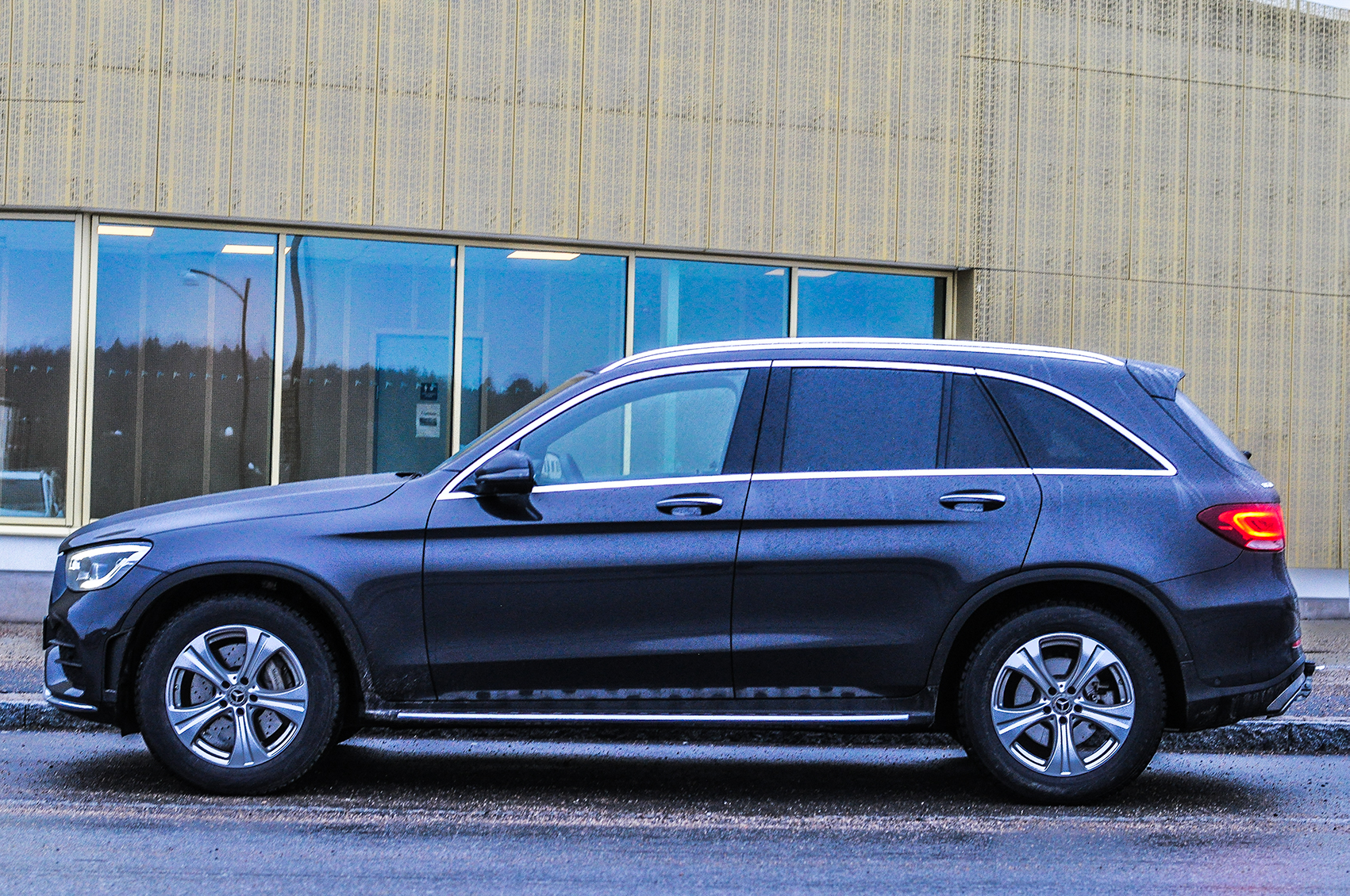På utsidan stoltserar GLC med nya lyktor, men i övrigt är det mesta sig likt. Bilen ger ett moget och värdigt intryck. Ingen mellanchef skulle någonsin bli ifrågasatt om han anlände i ett åk som det här! Lägg dock märke till testbilens instegslister (tillval), som varken är särskilt snygga eller praktiska. Det blir närmast omöjligt att hoppa ut eller in i bilen utan att lorta ner sina byxor, och bilen är inte så hög att det faktiskt behövs för att förenkla insteget.