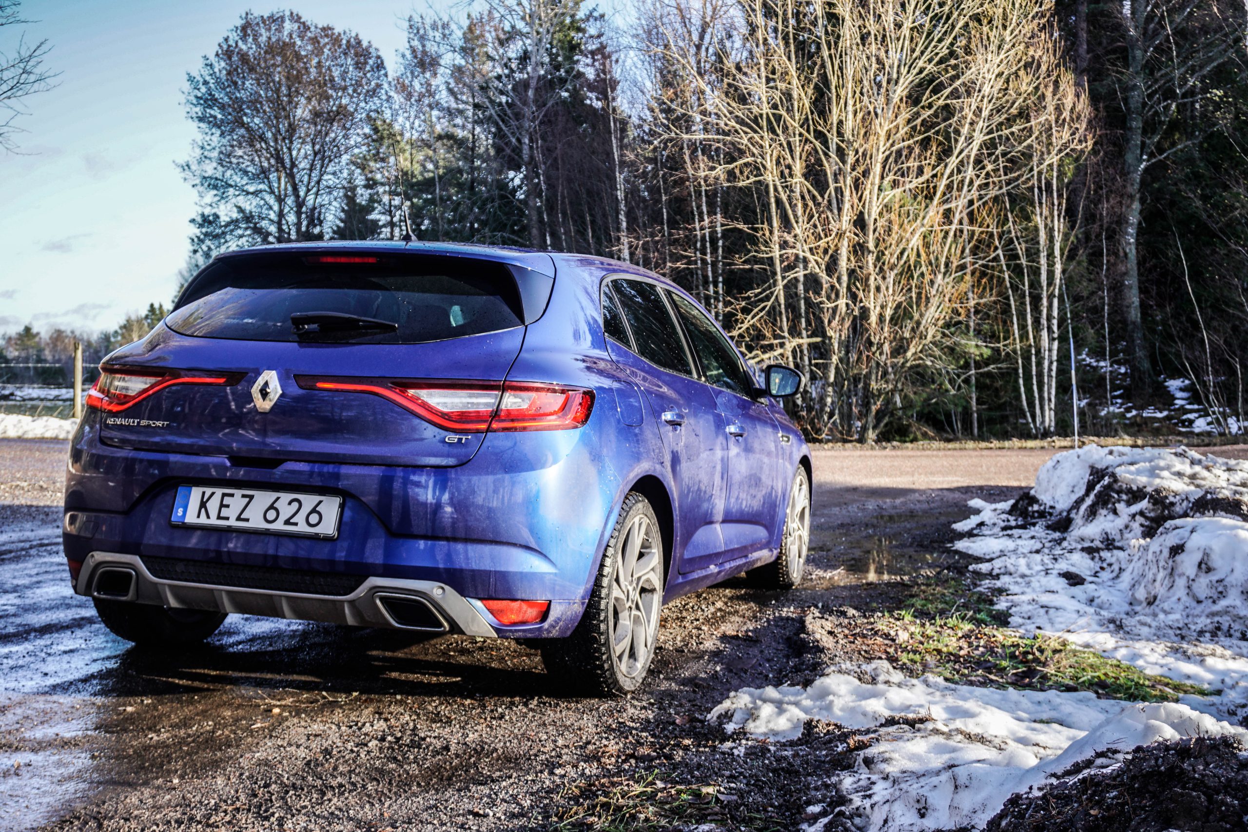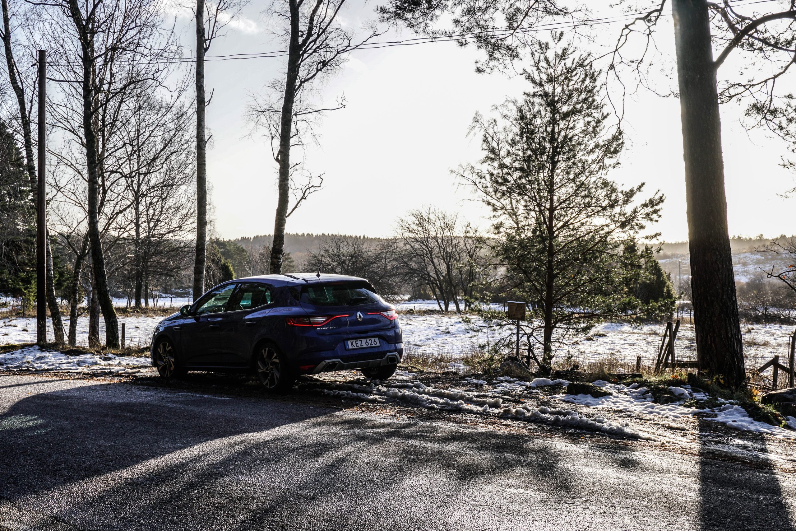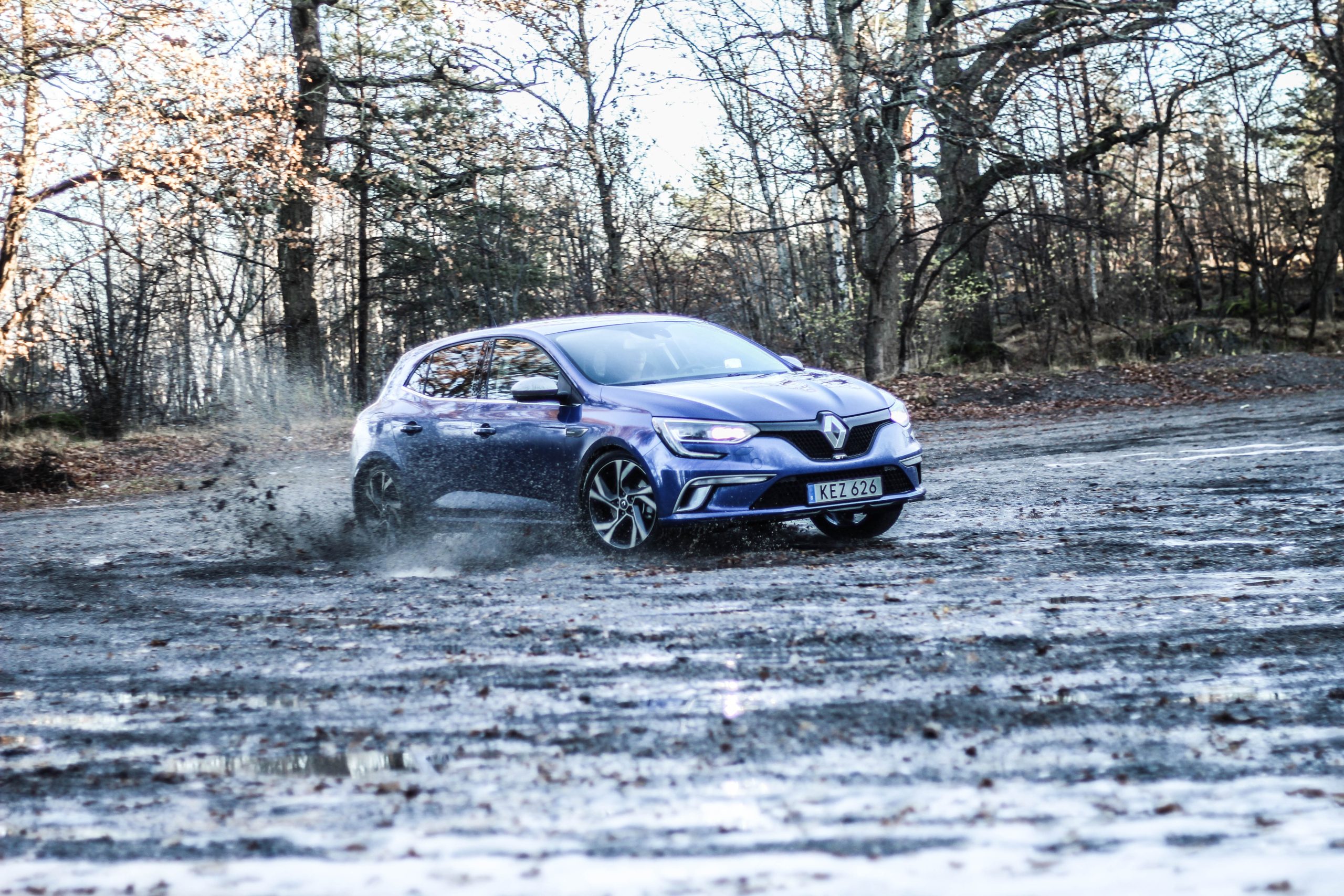 Renault Megane GT:s trumfkort är det faktum att bilen är försedd med fyrhjulsstyrning. Det innebär att bakhjulen i låga hastigheter svänger åt samma håll som framhjulen vilket gör att bilen kan svänga på en femöring. I hastigheter över 80 kilometer i timmen svänger de åt motsatt håll vilket befrämjar stabilitet på motorvägen. Hur det påverkar kördynamiken på landsväg fick jag dessvärre inte erfara – vinterväglaget motverkade rallyinspirerad körning. Det som är viktigt att understryka är att Renault har använt sig av epitetet GT istället för GTI, något som lyckas pricka Meganens karaktär väldigt väl. Man kan exempelvis inte ens stänga av stabilitetskontrollen.