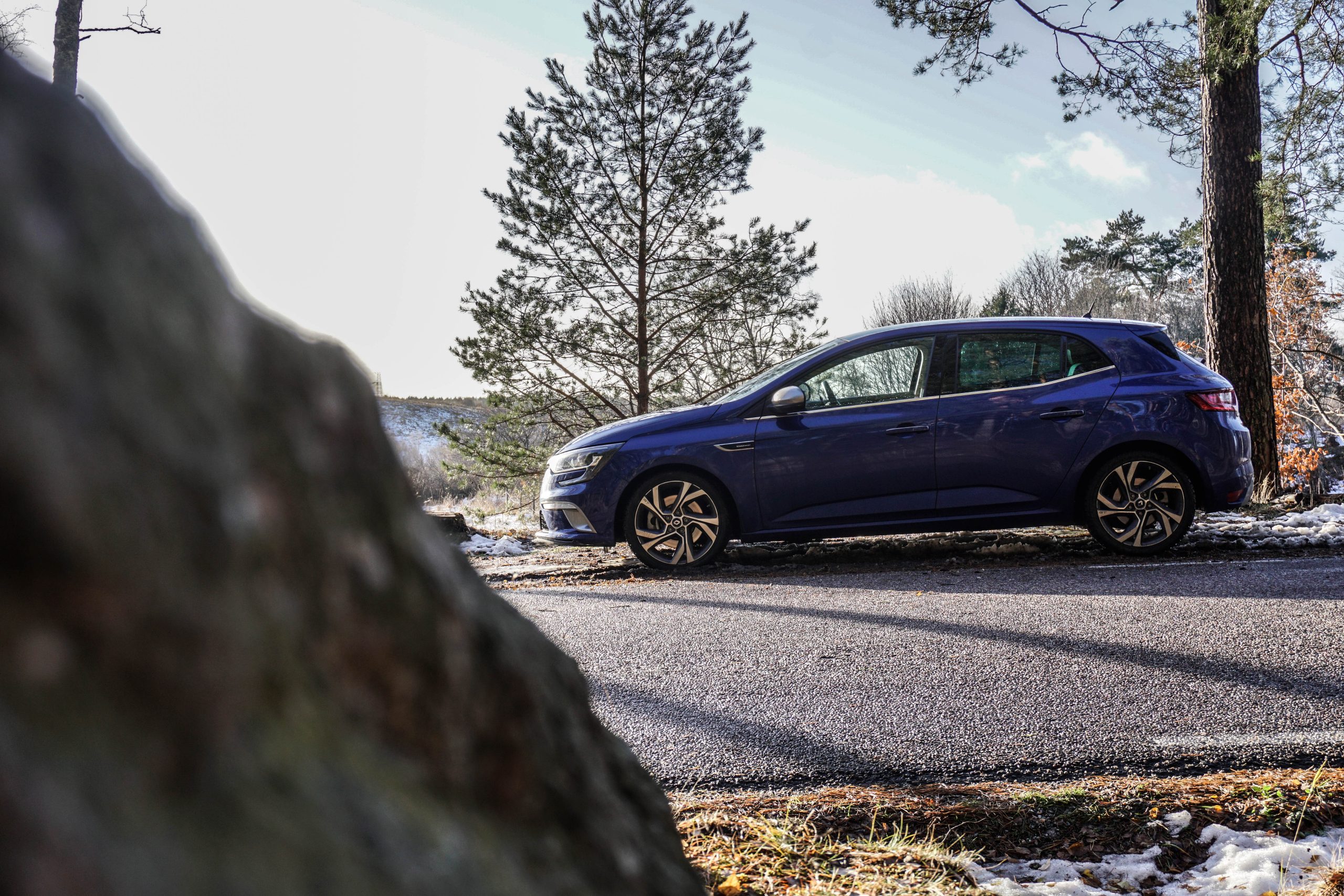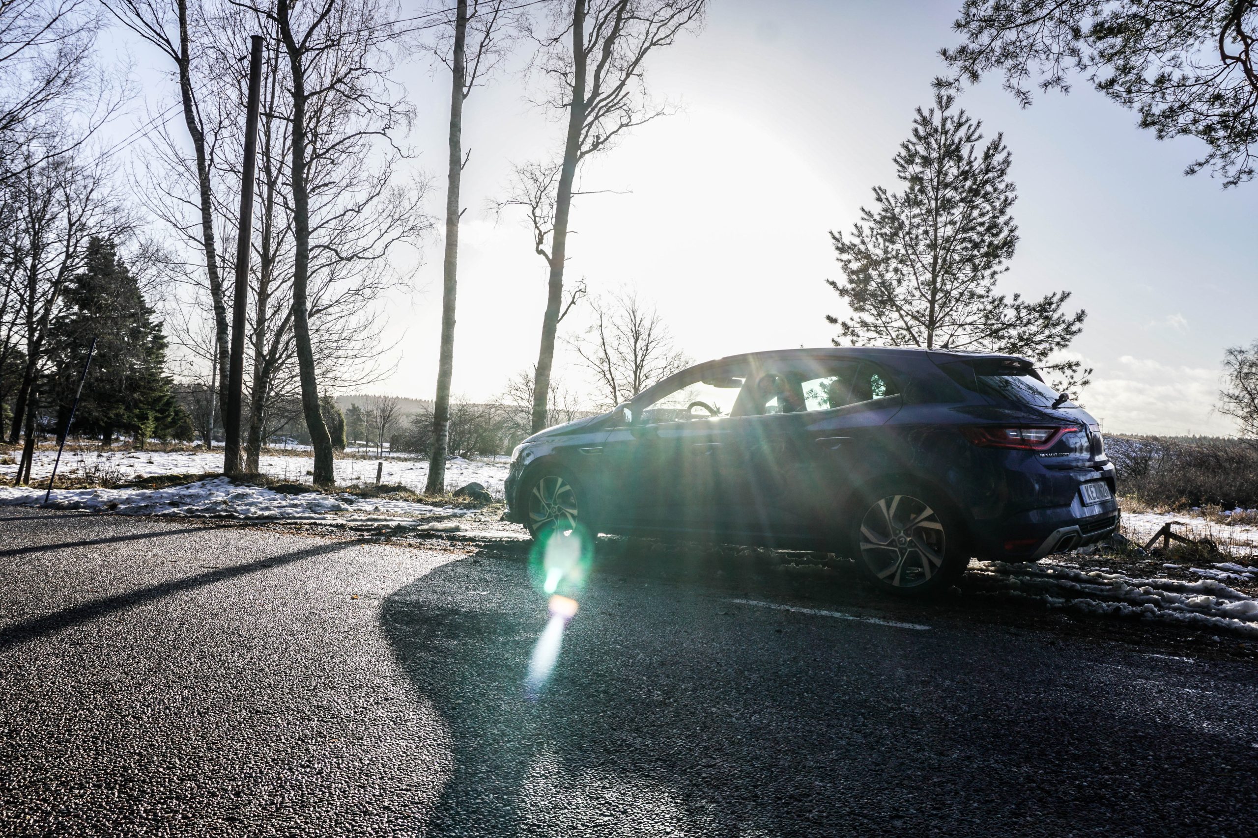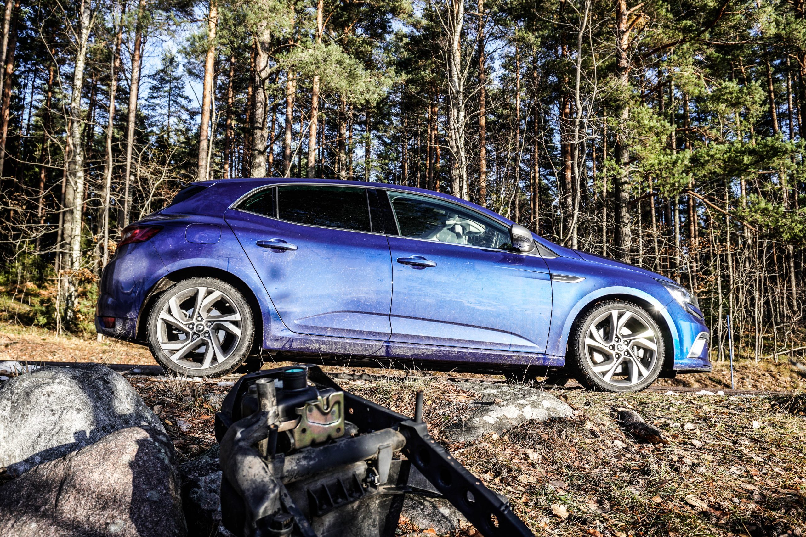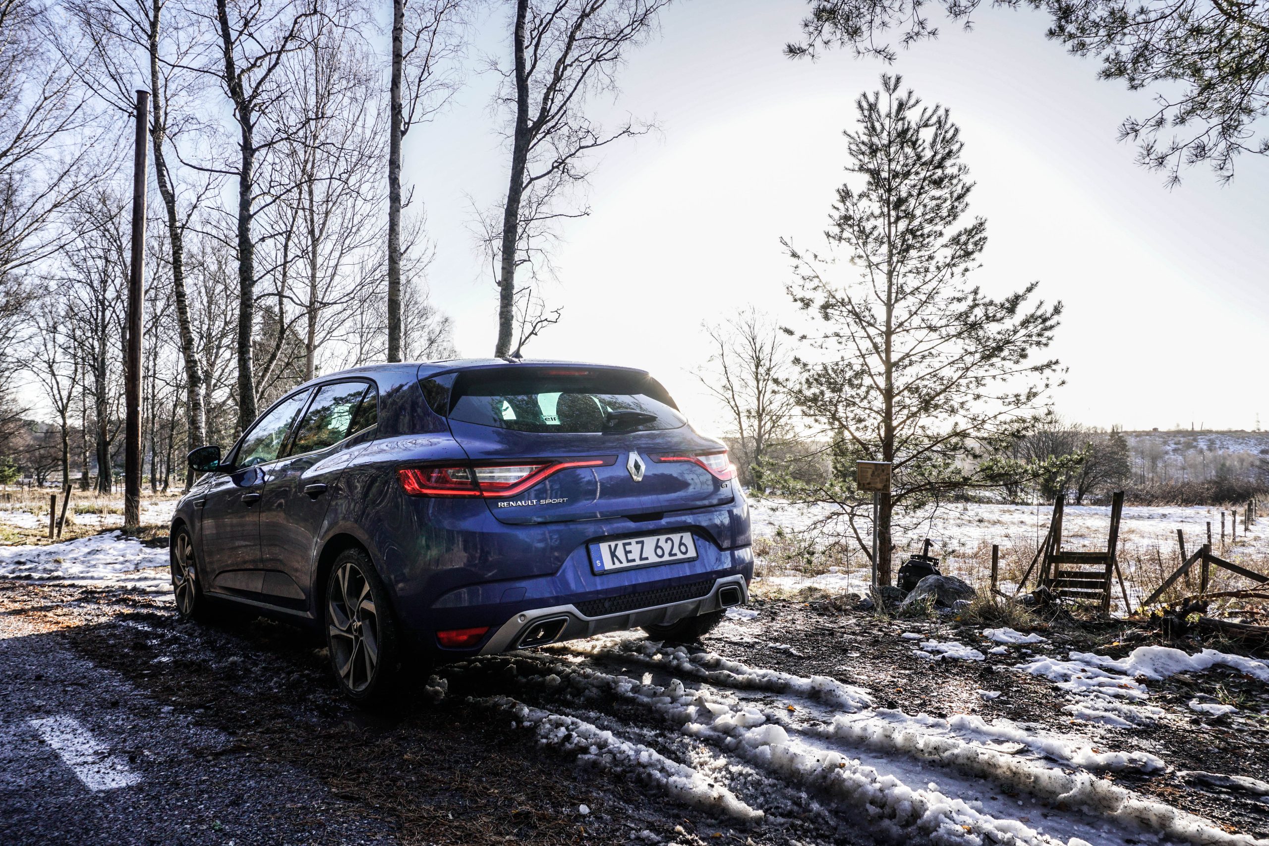 Renault Megane GT:s trumfkort är det faktum att bilen är försedd med fyrhjulsstyrning. Det innebär att bakhjulen i låga hastigheter svänger åt samma håll som framhjulen vilket gör att bilen kan svänga på en femöring. I hastigheter över 80 kilometer i timmen svänger de åt motsatt håll vilket befrämjar stabilitet på motorvägen. Hur det påverkar kördynamiken på landsväg fick jag dessvärre inte erfara – vinterväglaget motverkade rallyinspirerad körning. Det som är viktigt att understryka är att Renault har använt sig av epitetet GT istället för GTI, något som lyckas pricka Meganens karaktär väldigt väl. Man kan exempelvis inte ens stänga av stabilitetskontrollen.