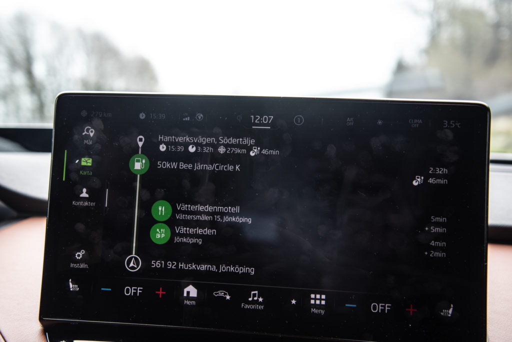 I en bil driven av en förbränningsmotor hade ovan nämnda resa knappast varit en utmaning. De flesta bilar rullar längre än 60 mil på en tank och om ett tankstopp ändå skulle krävas behöver det inte ta längre än ett par minuter. Škoda Enyaq har, i testutförandet, en räckvidd på cirka 50 mil. Den snabbtänkte kan därför utan större utmaning räkna ut att ett laddstopp krävs efter ungefär fem sjättedelar av sträckan. Detta antar någorlunda fördelaktiga väderförhållanden.