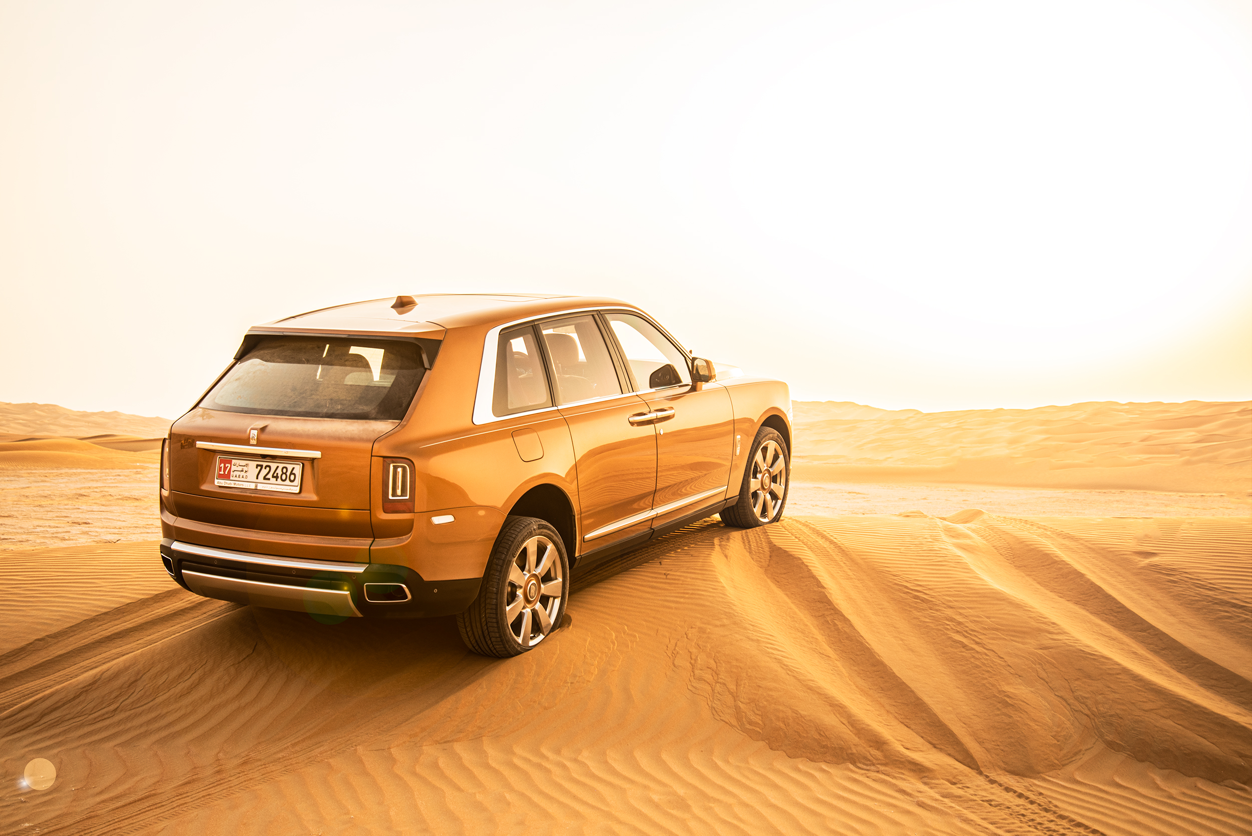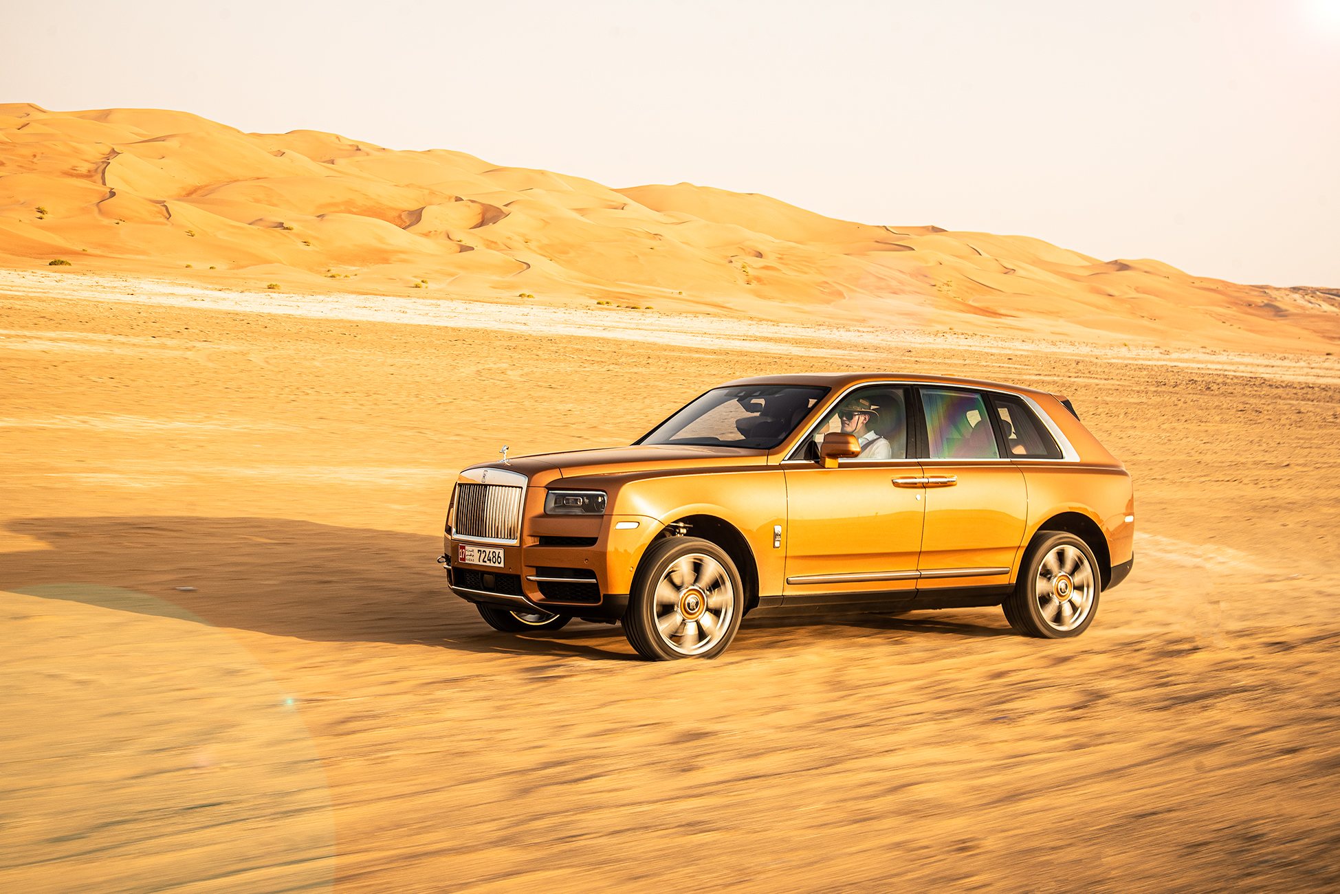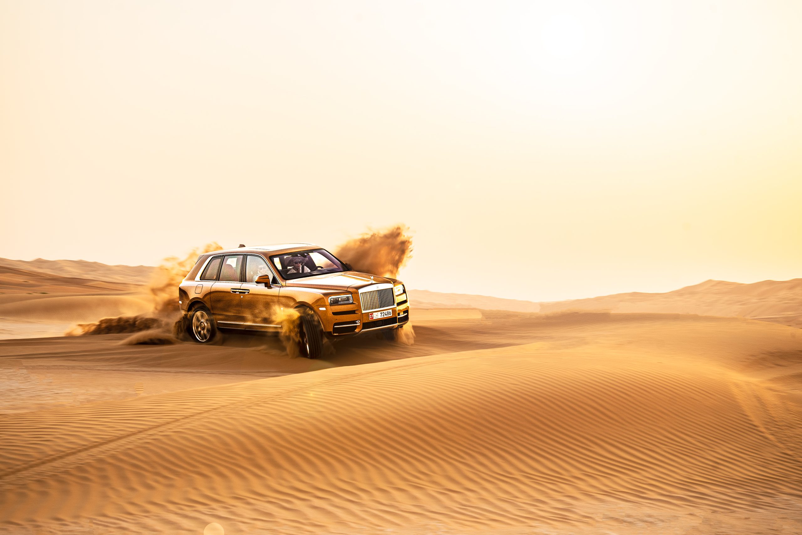 Att sitta i förarsätet på en Rolls-Royce och blicka ut över en av världens mest otacksamma miljöerna i mannaminne med endast den flygande damen som guide är en udda upplevelse. Med rejält lågt däcktryck, off-road-läget aktiverat, och en bitande oroskänsla, körde vi in för kung och fosterland. I takt med att temperaturen klättrade över 50 grader, körde vi rakt ut i sanden, bara några kilometer från gränsen till Saudiarabien. Vi körde rakt upp för en mellanstor dyna, men Cullinans tyngd och avsaknaden av lämpliga terrängdäck gjorde att vi illa kvickt blev en del av just den öknen vi försökte ta oss an.
