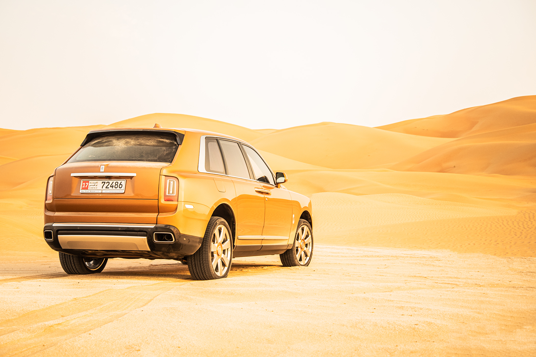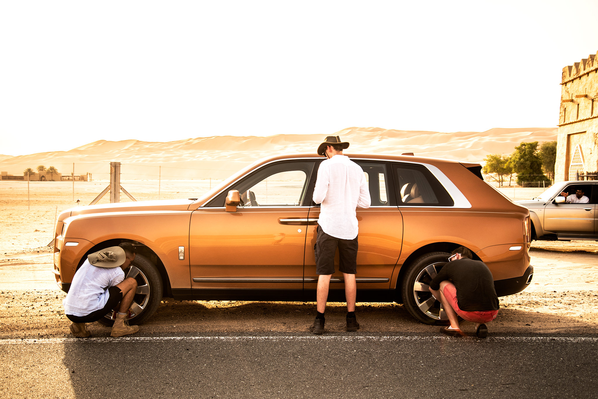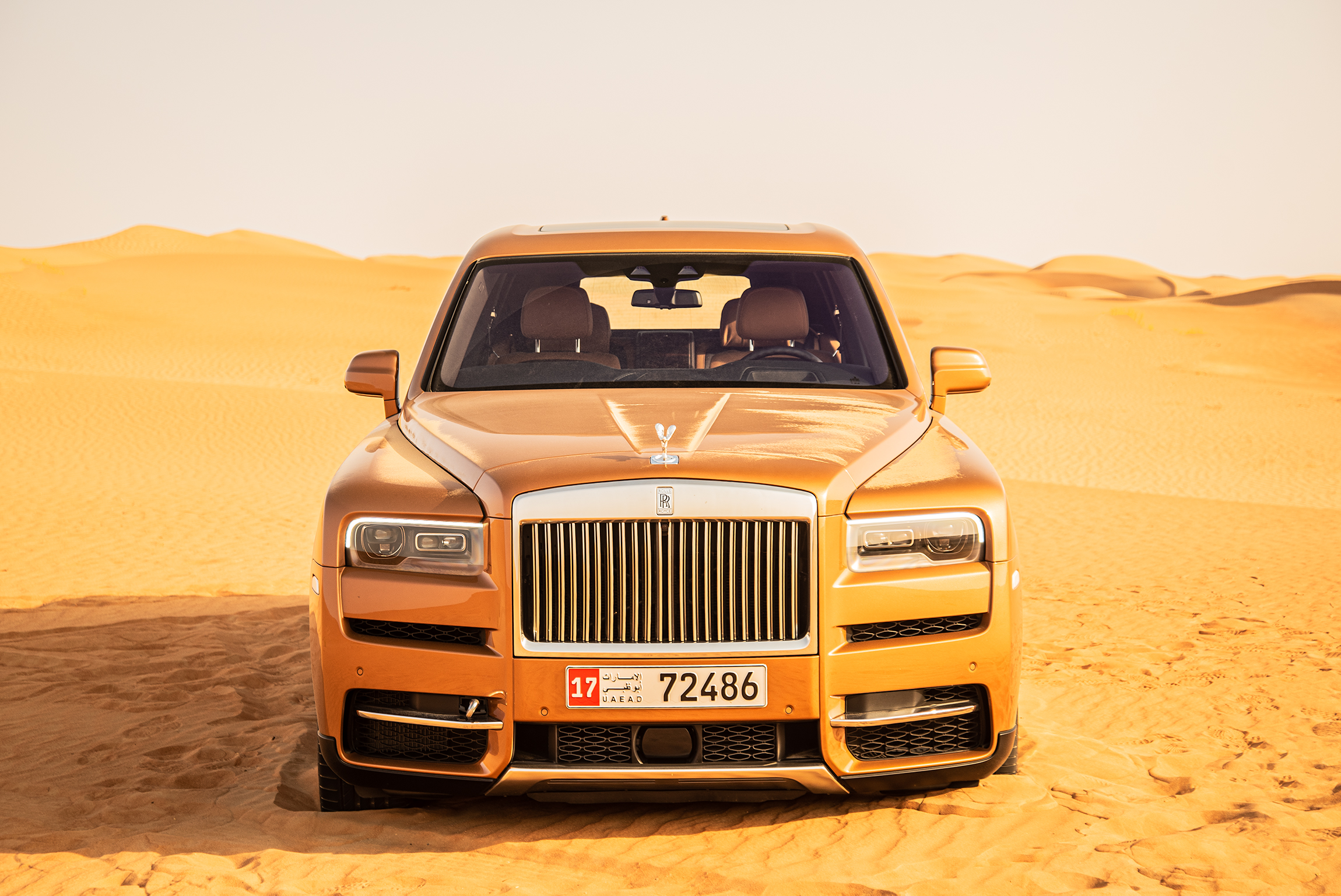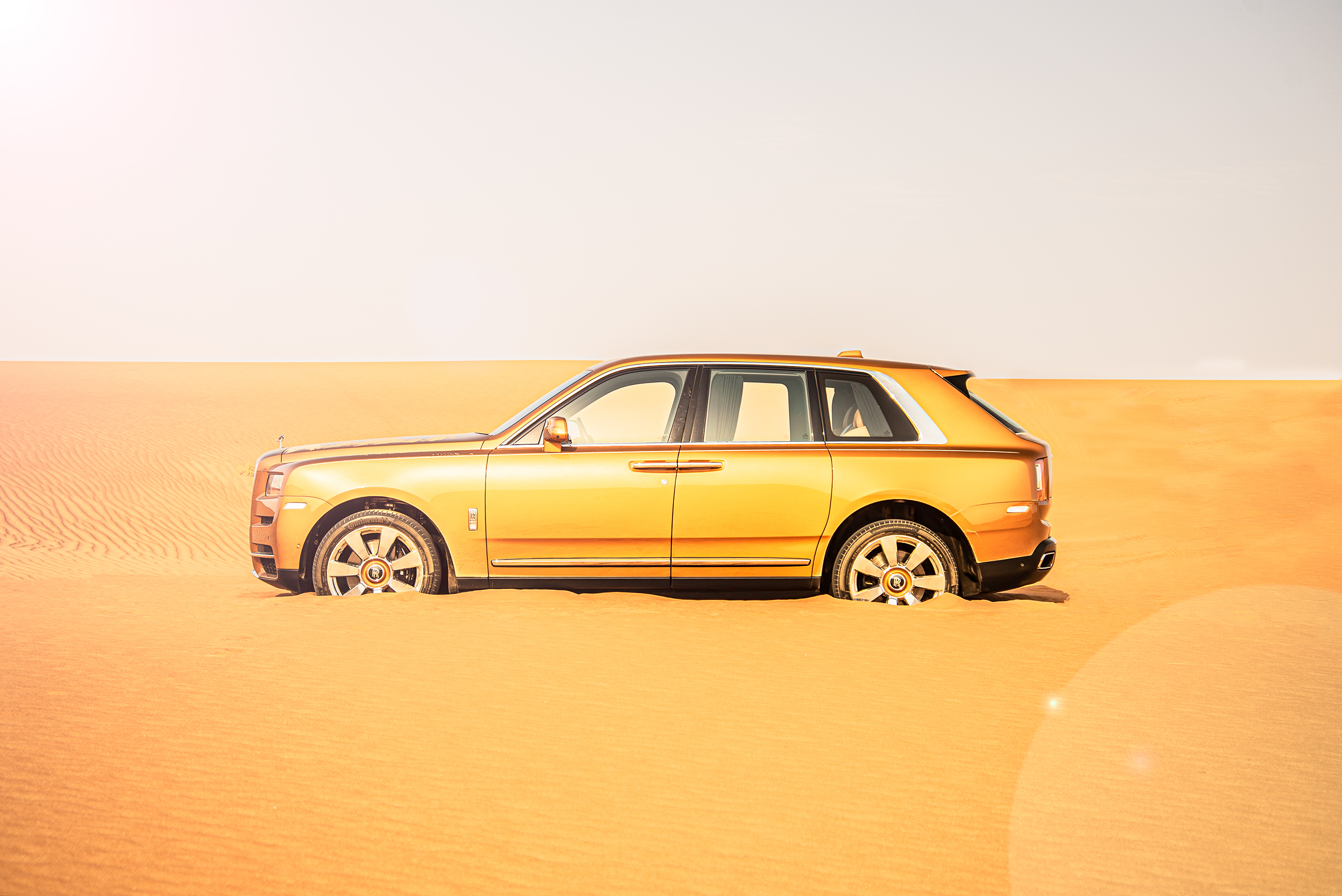 Att sitta i förarsätet på en Rolls-Royce och blicka ut över en av världens mest otacksamma miljöerna i mannaminne med endast den flygande damen som guide är en udda upplevelse. Med rejält lågt däcktryck, off-road-läget aktiverat, och en bitande oroskänsla, körde vi in för kung och fosterland. I takt med att temperaturen klättrade över 50 grader, körde vi rakt ut i sanden, bara några kilometer från gränsen till Saudiarabien. Vi körde rakt upp för en mellanstor dyna, men Cullinans tyngd och avsaknaden av lämpliga terrängdäck gjorde att vi illa kvickt blev en del av just den öknen vi försökte ta oss an.