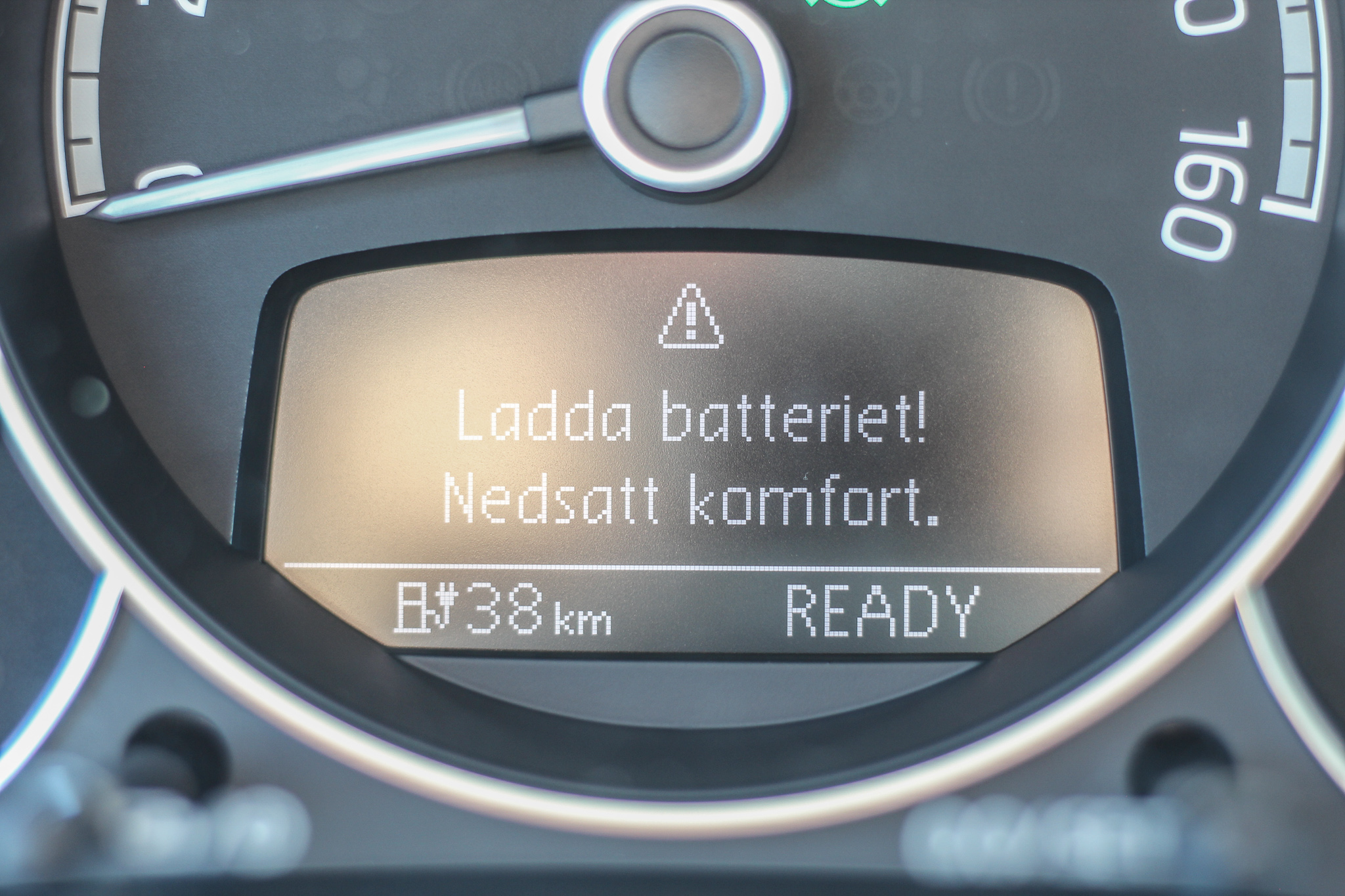Resan påbörjades med ett batteri lika fullt som SL-bussarna under rusning. Den lilla färddatorn bredvid hastighetsmätaren indikerade 260 kilometer med eco-läget påslaget. Det finns även ett eco+-läge som stänger av klimatanläggningen men eftersom jag inte ville bada bastu i två timmar lät jag fläktarna snurra. Dock skippade jag AC:n som enligt displayen skulle äta upp 3 mil av räckvidden.