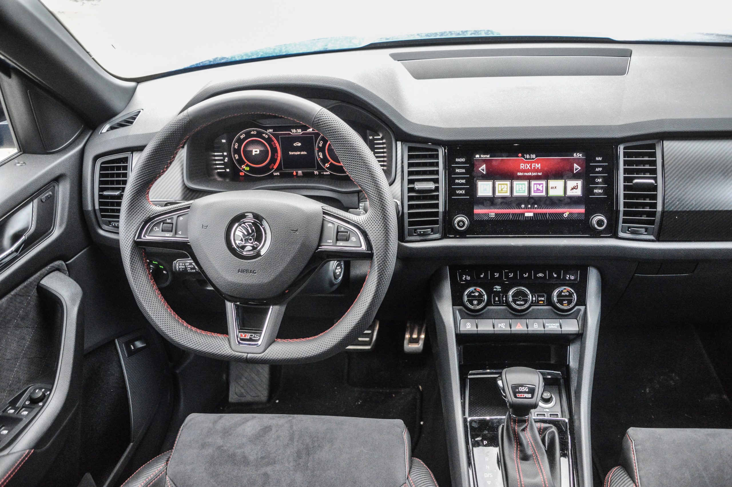 Interiören har även den fyllts med sportiga detaljer. Alla sömmar, och det genomgående temat i menyerna i infotainmentsystemet är lika rött som en perfekt mogen tomat. Stolarna är klädda i läder och alcantara, och bjuder på lagom mycket sidostöd. Det handlar inte om några obekväma skalstolar, men heller inte så plana dynor att baken halkar runt som ett helt ägg i en teflonpanna i kurvorna. Den nya digitala förardisplayen är tydlig att förstå och den som har använt Volkswagens motsvarighet kommer genast att känna igen sig. En av insidans bästa delar är dock den sportiga ratten som känns oerhört högkvalitativ och greppvänlig. Den är en komponent som definitivt höjer den redan genomgående höga standarden i Kodiaq RS interiör.