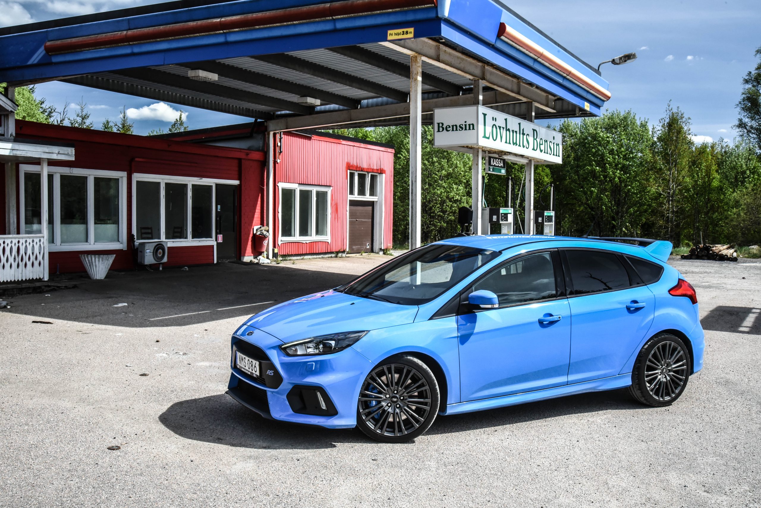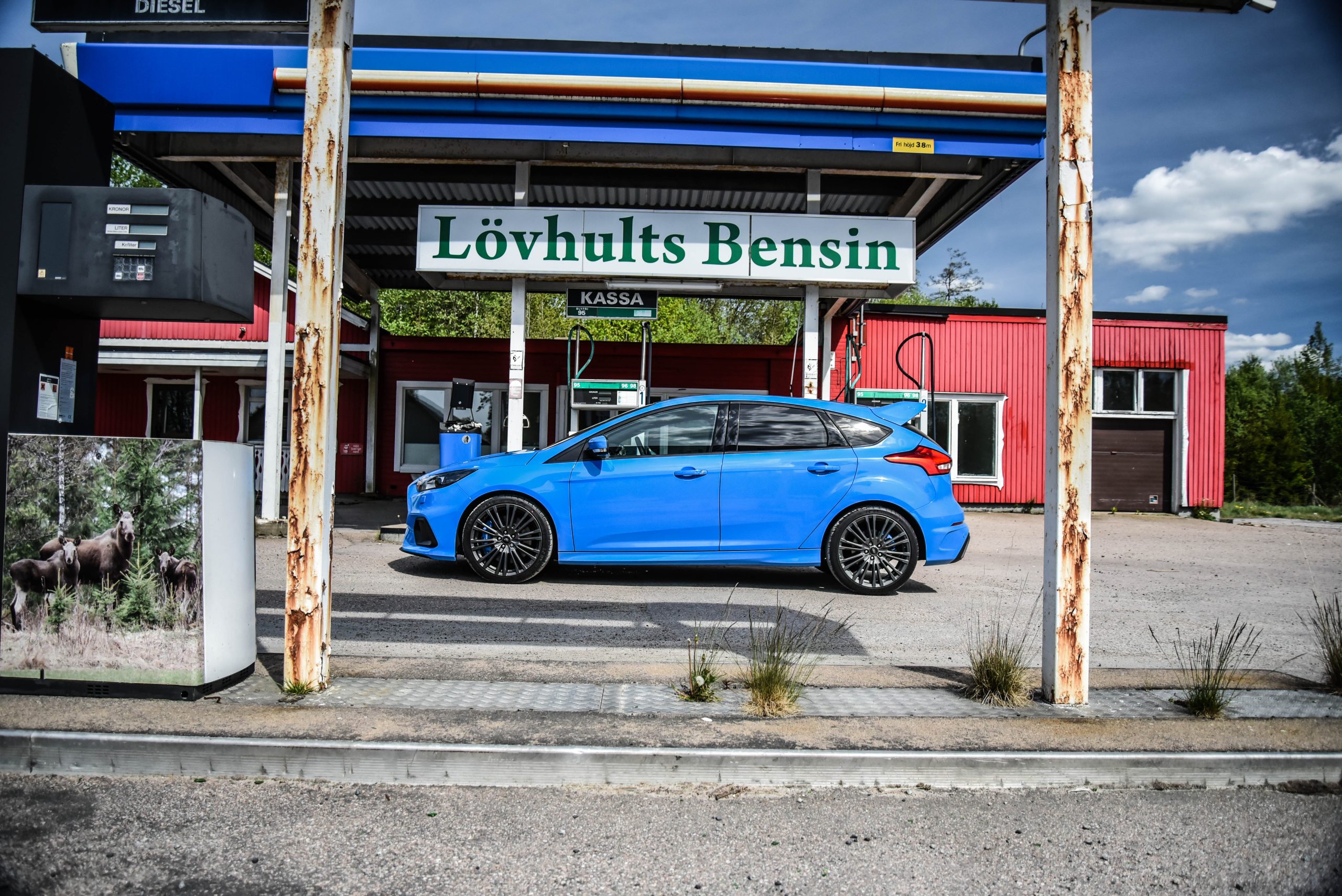 Jag nyttjade nästa spanska sväng illa kvickt och stannade till på ett av många offer som motorvägen har skördat. ”Lövhults Bensin” och ”Lövhults Taverna” var två skyltar jag la märke till. Macken och tavernan var lika tomma som ett vakuum och var på så vis en juxtaposition mellan Focus RS landsvägsambitioner samt landsvägens avsaknad av faciliteter för att stödja just en sådan ambition. Ödsligt och något sorgset var det även om det onekligen lämpade sig alldeles utmärkt för fotografering.