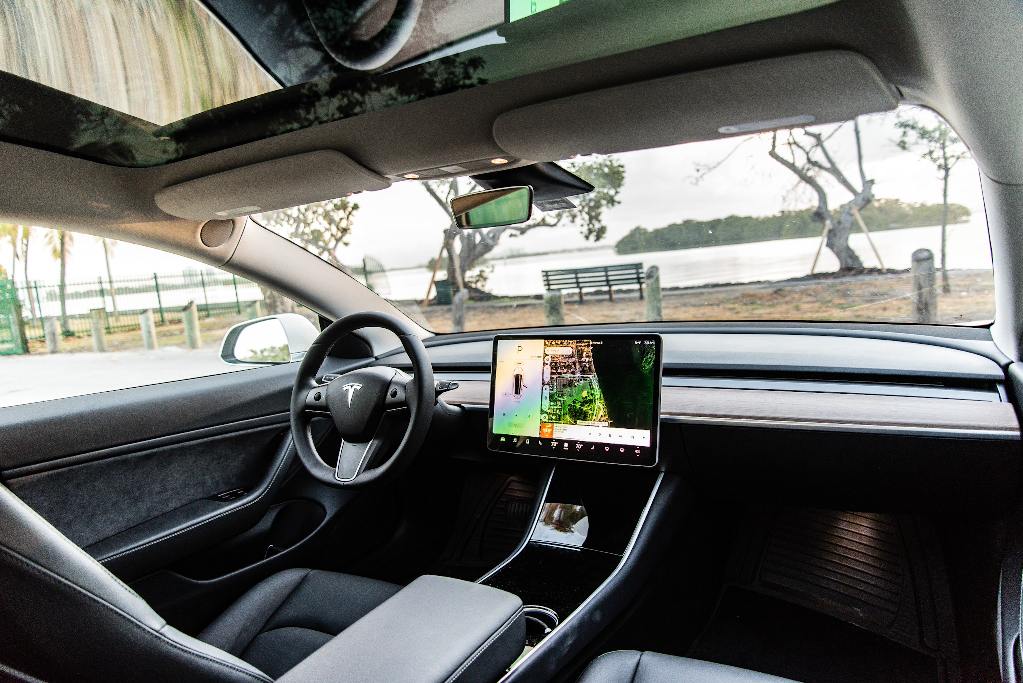 När det kommer till räckvidd är den som Tesla påstår (50 mil) verklighetstrogen om man kör lika hetsigt som en präst och utan klimatanläggningen igång. Dessvärre är det lika trevligt att köra utan AC i Miami som att campa i Everglades. Nåväl, södra Floridas tropiska klimat är perfekt för elbilar, precis som trafiksituationen och på så vis är Tesla Model 3 en enastående kompanjon. När det kommer till den teknologiska biten är intrycket lite mer varierat. Den enorma 15-tums-skärmen i mittkonsolen är ett bra verktyg på många sätt, men den är mer distraherande än ryska kraschfilmer på YouTube.