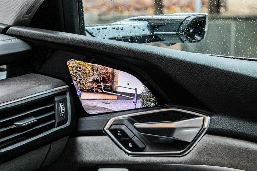 Invändigt är det som man har kommit att vänta sig av en modern Audi: en massa touch-skärmar och väldigt lite knappar. Dessa fungerar relativt väl men exempelvis klimatsystemet skulle vara lättare att använda med knappar och vreden. E-tron skiljer sig dock från sina syskon i två viktiga hänseenden: mittkonsolen är ihålig och rymmer nästan lika mycket prylar som ett mindre bagageutrymme, och det sitter en skärm på vardera dörr. Testbilen var nämligen utrustad med kamerabackspeglar. Det ser inledningsvis coolt ut men man inser snabbt att det bara är jättedumt. Det känns onaturligt, är svårt att avgöra avstånd på en skärm, och ögonen måste fokusera om vilket är ansträngande och tar tid. Ack, vilken gimmick!